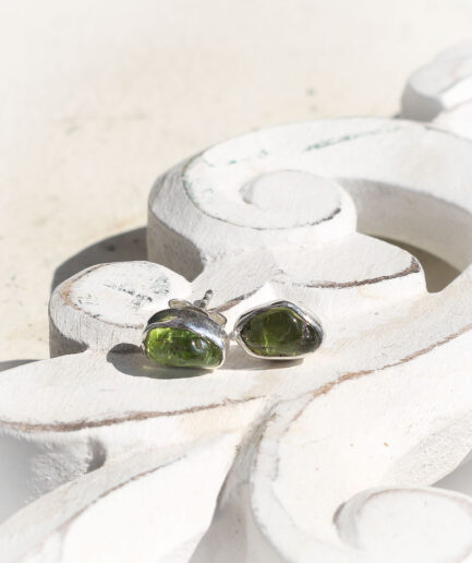 Een paar zilveren oorknoppen met ruwe, groene peridot stenen