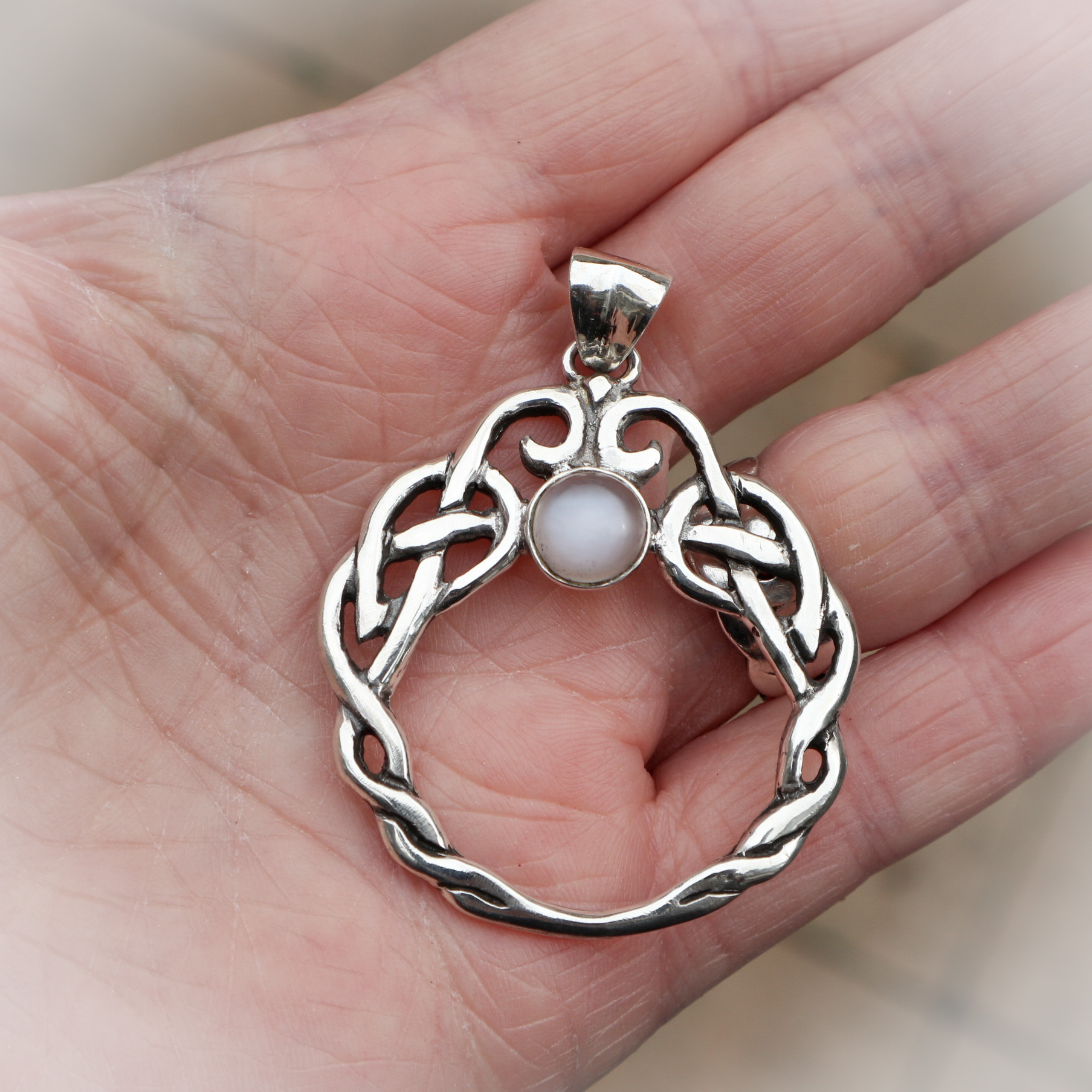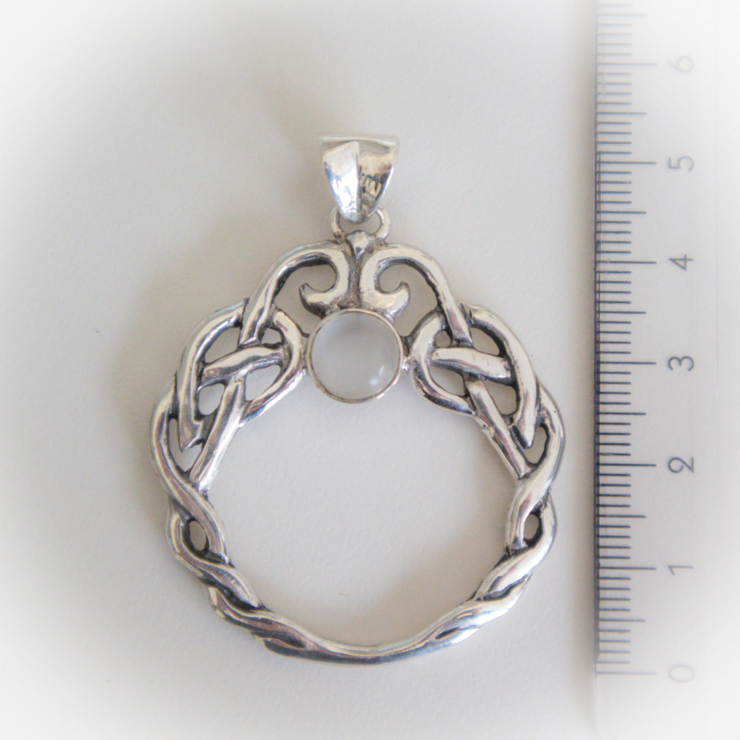 Een grote keltische maan hanger met prachtige gevlochten lijnen .