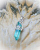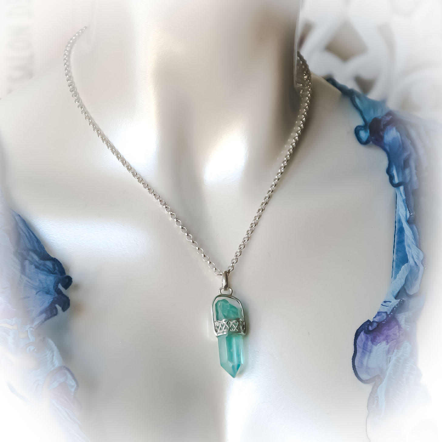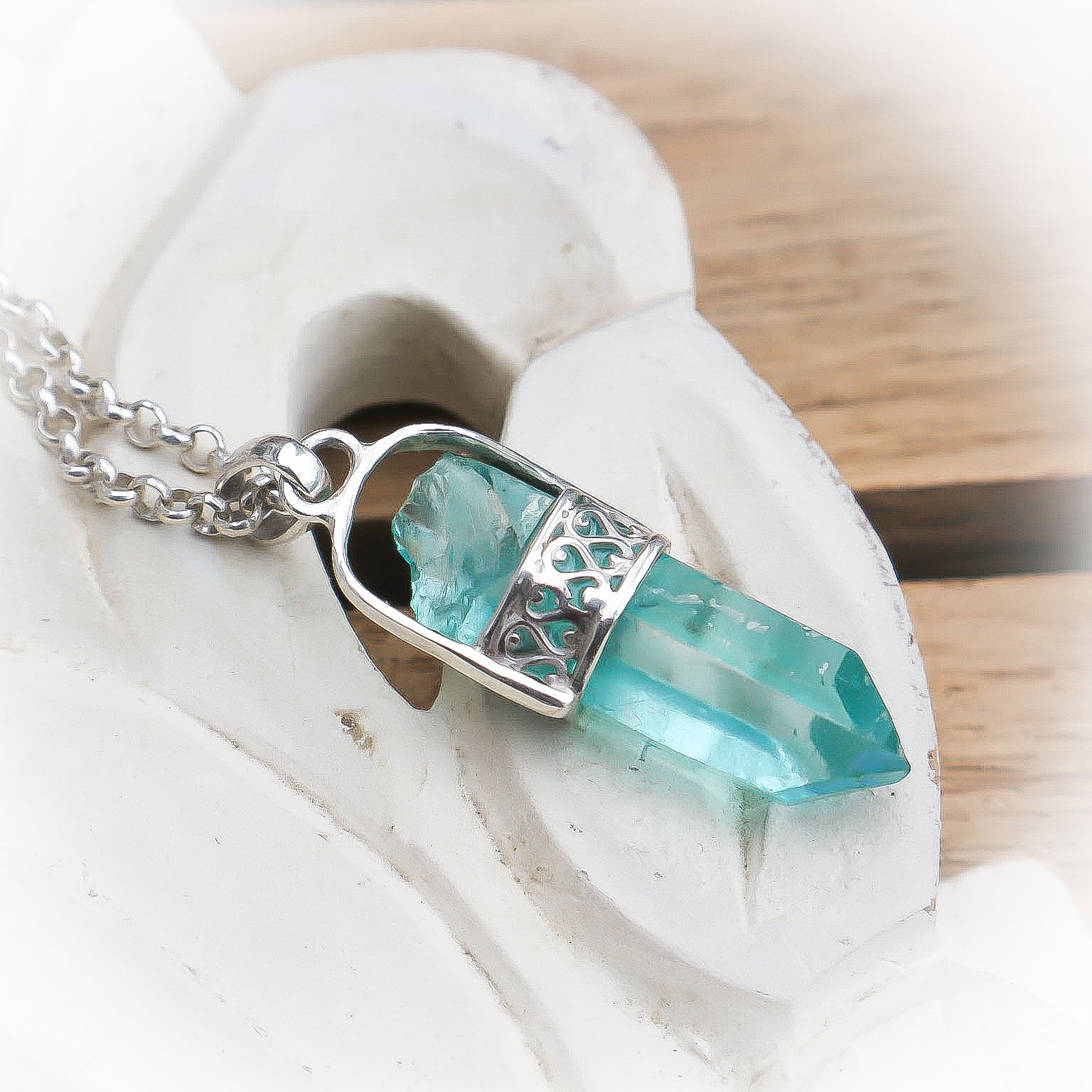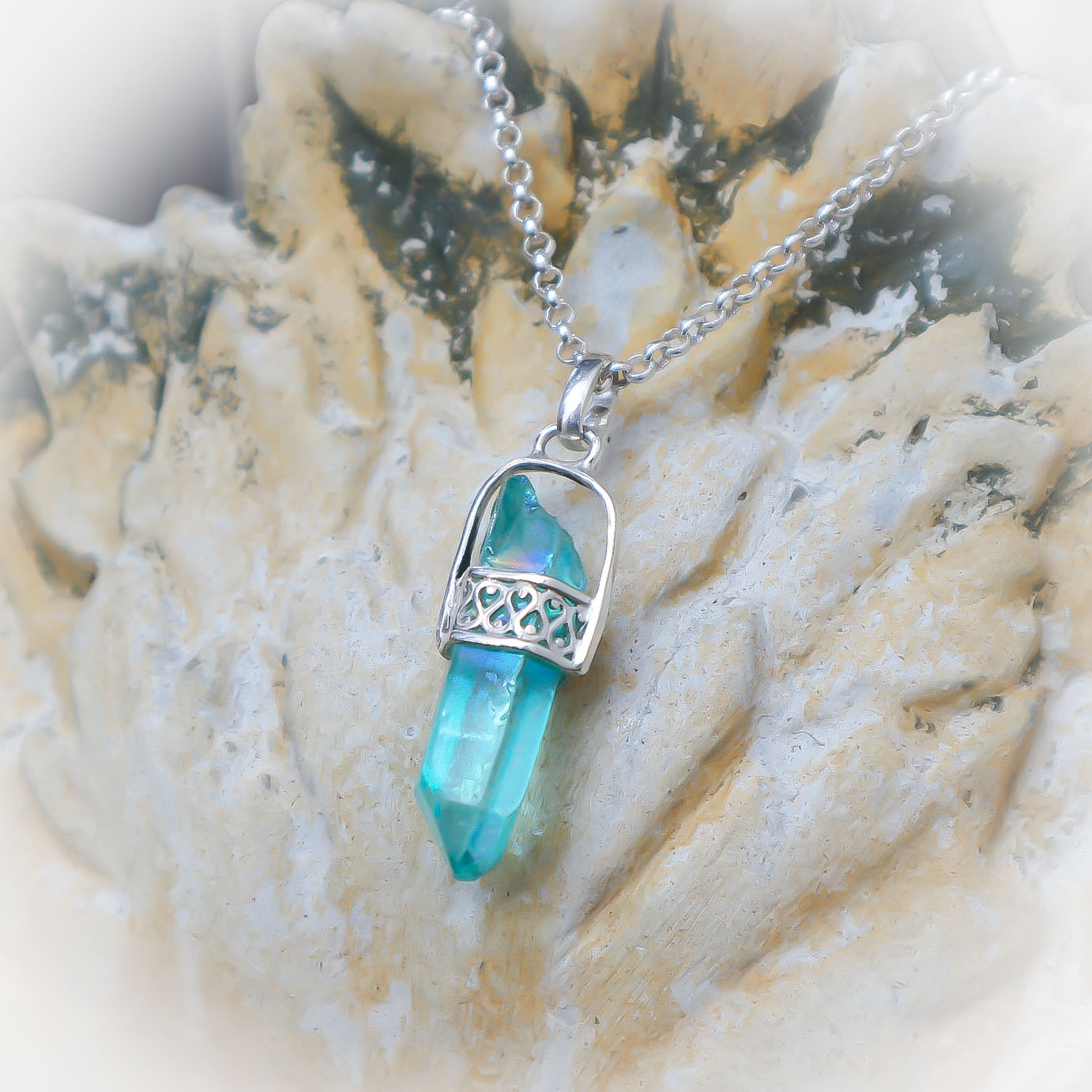 Een prachtige, ruwe aqua aura kwartskristalpunt gezet in een sierlijke boog van sterling zilver .