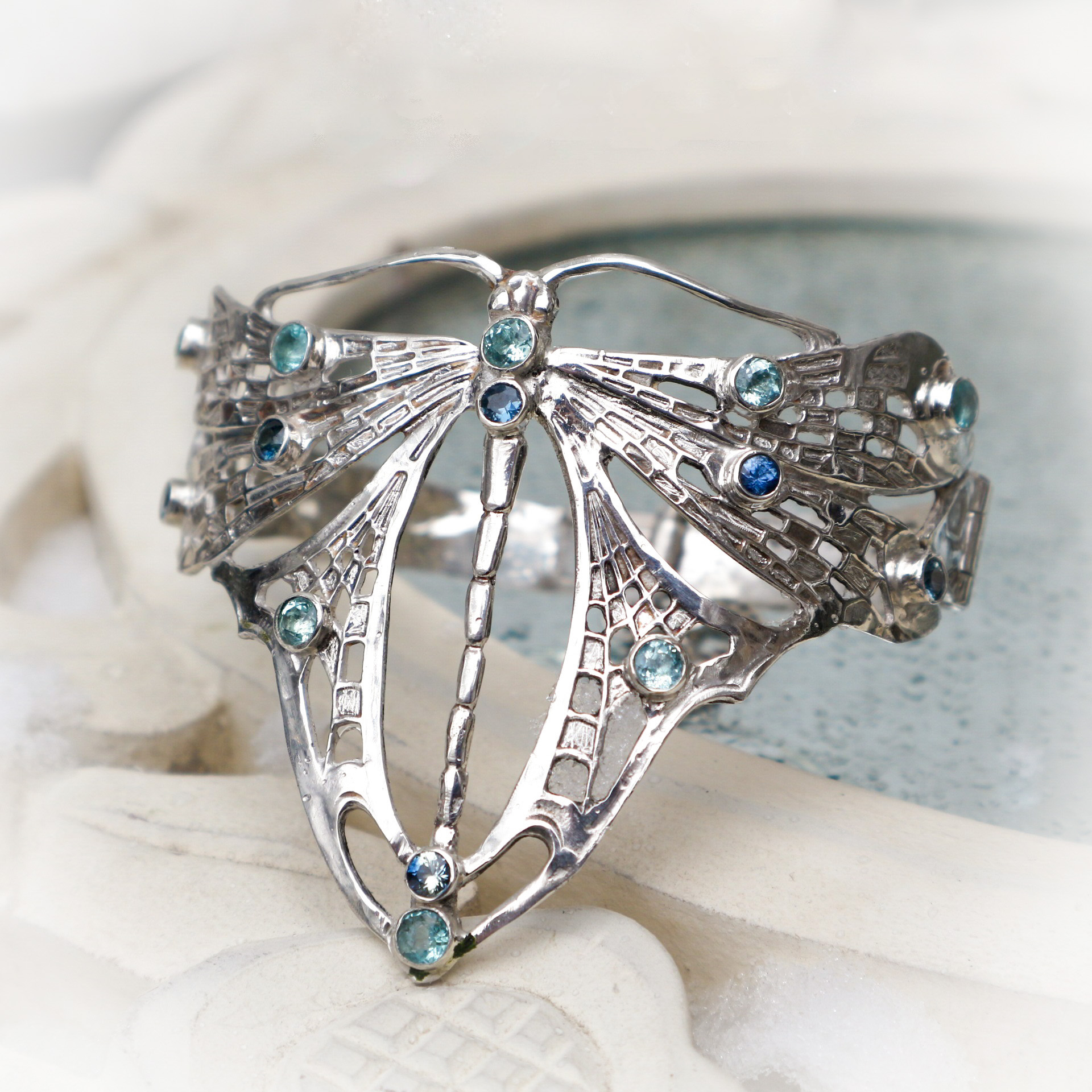 Op de libelle zijn 14 steentjes gezet, de groenblauwe steentjes zijn apatietsteentjes, en de blauwe zijn saffiertjes, prachtig facetgeslepen en 3 à 4 mm rond .