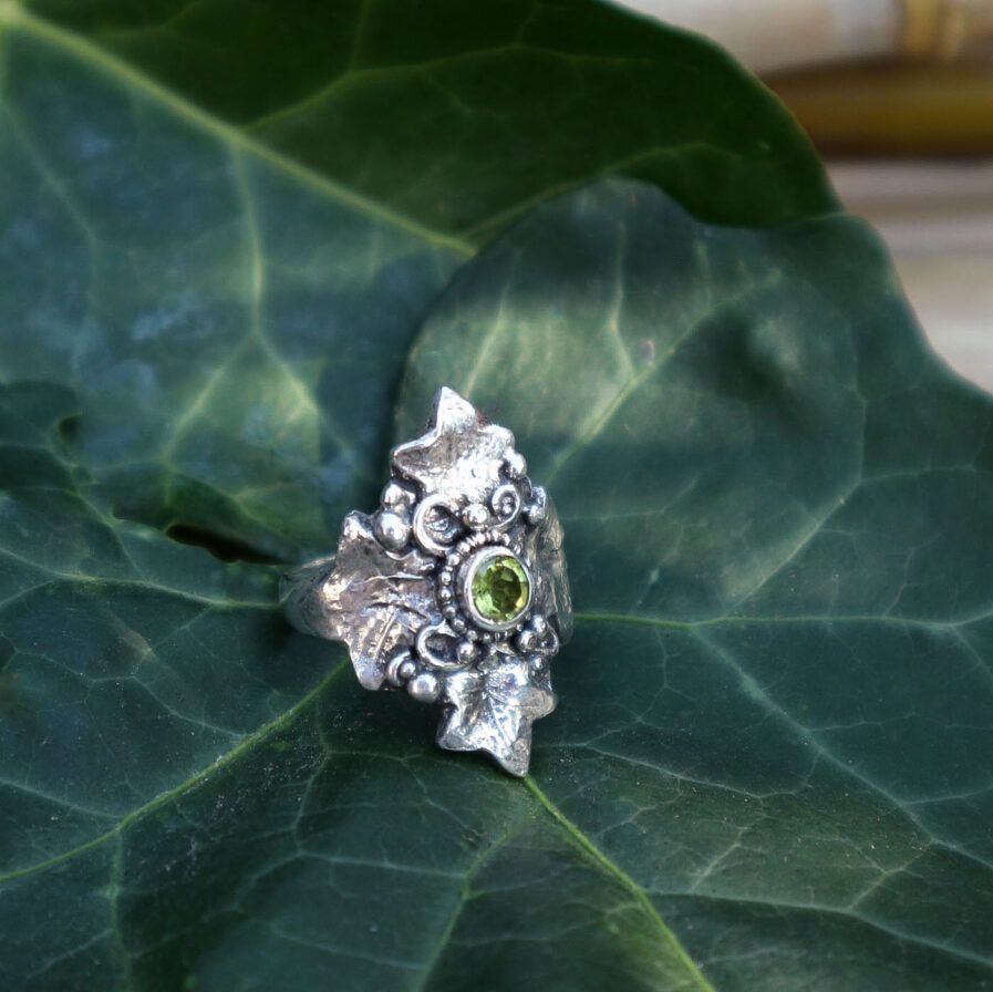 Een prachtige handgemaakte zilveren ring, geïnspireerd door de natuurlijke schoonheid van klimopblaadjes.