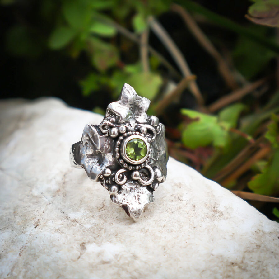 De ring is met zorg en vakmanschap vervaardigd, de klimopmotieven symboliseren groei en verbondenheid, middenin de ring een schitterende, facetgeslepen peridot edelsteen ( 5 mm rond ) De dieper gelegen delen van de ring zijn donker gepatineerd, zodat de details beter tot hun recht komen .