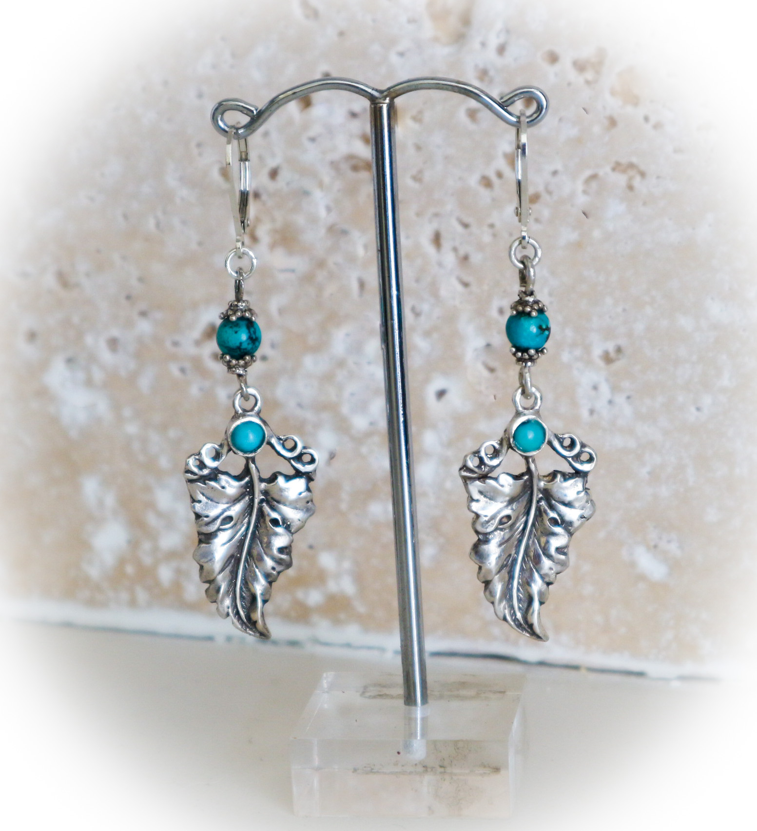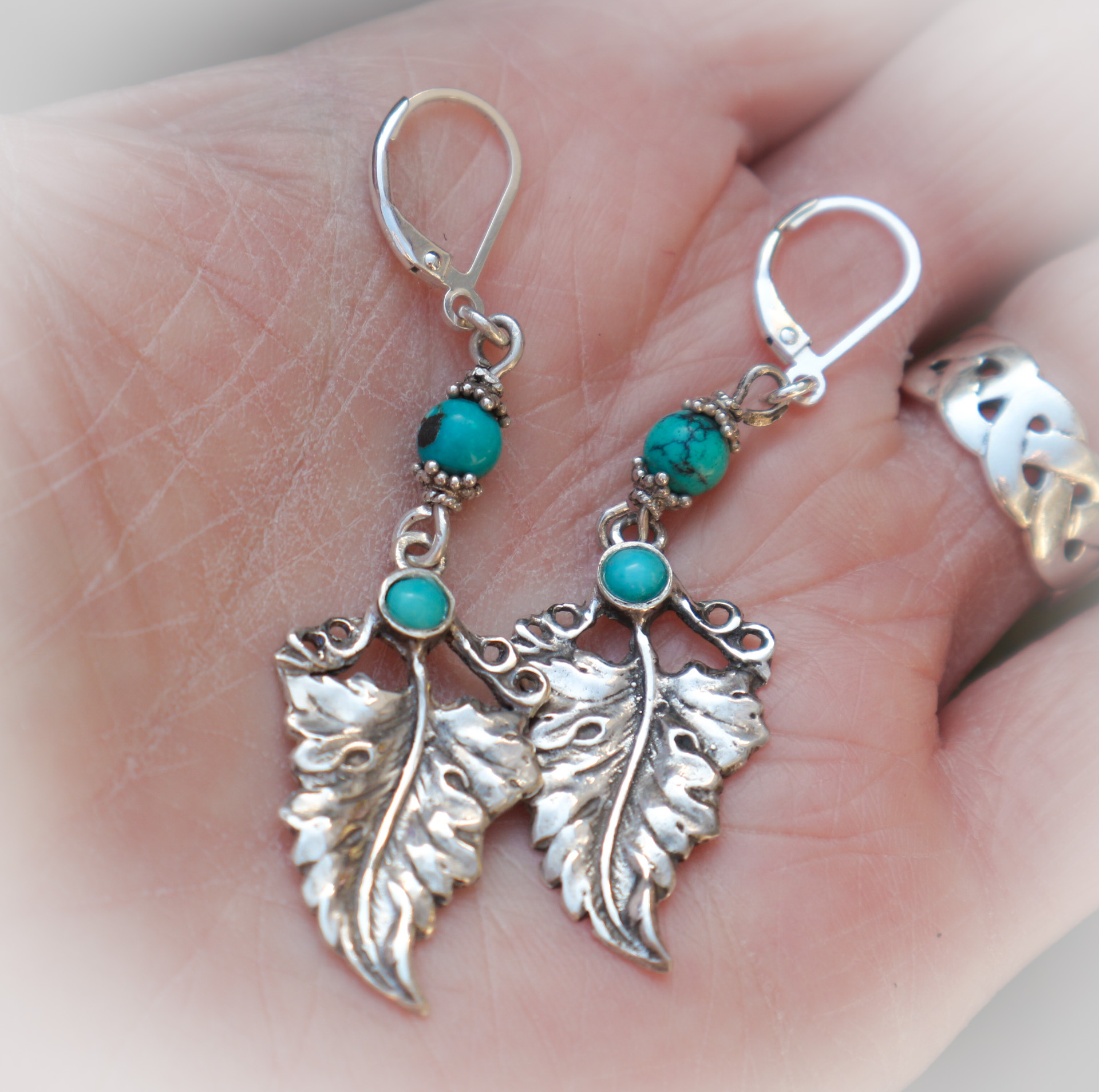 Een leuk, vrolijk paar ‘blaadjes’ oorbellen, met echte turkoois steentjes .