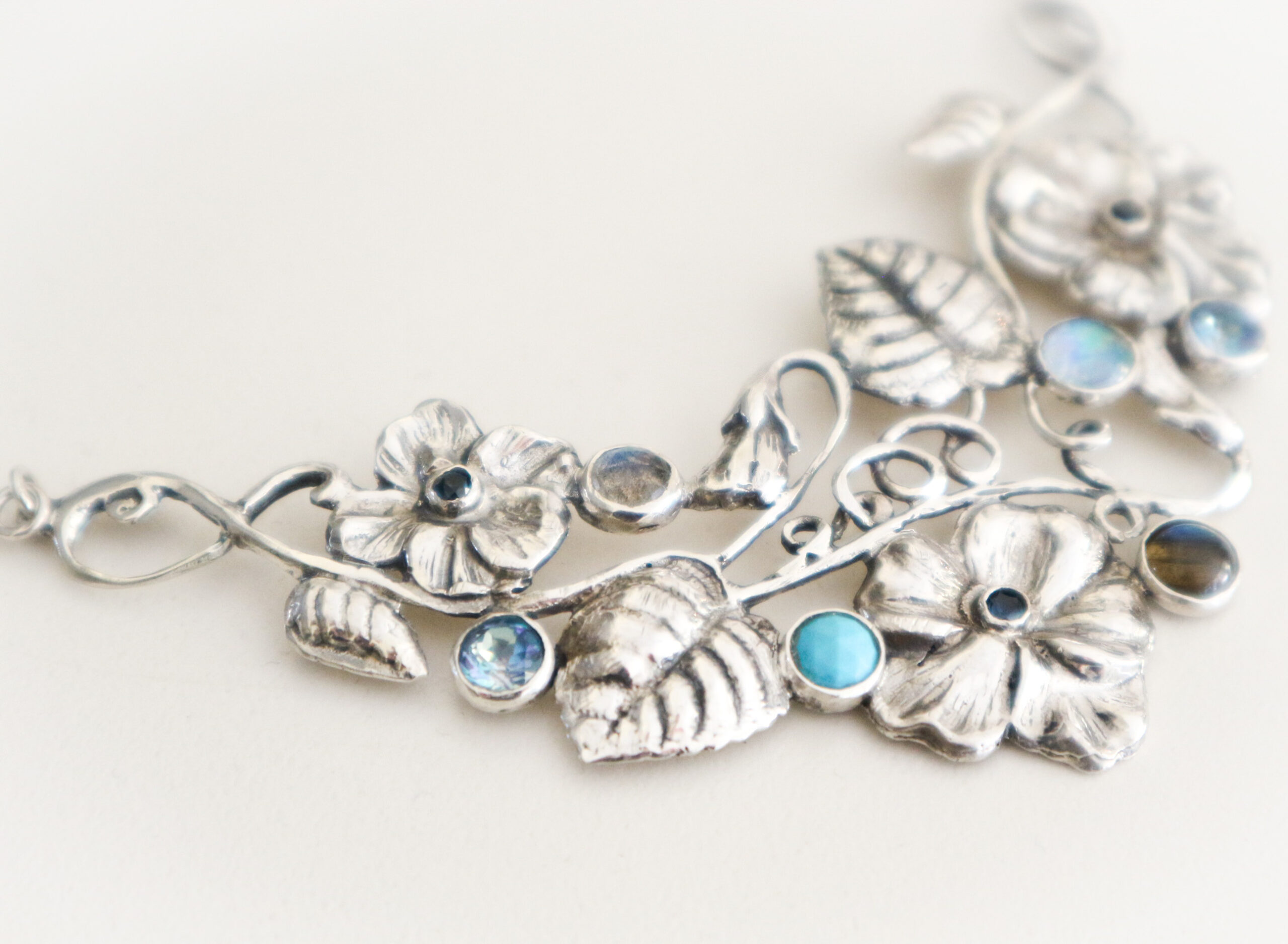 Tussen de bloemen in diverse -echte- stenen ; twee keer een labradoriet, een turkoois, twee aqua topaz blauwe steentjes en een opaal .