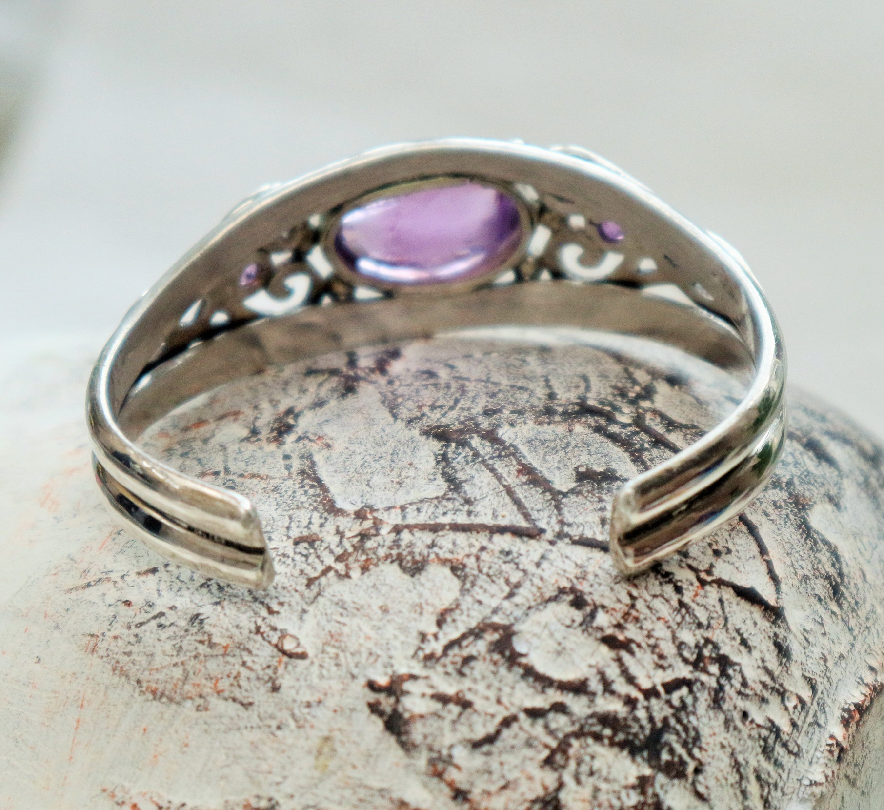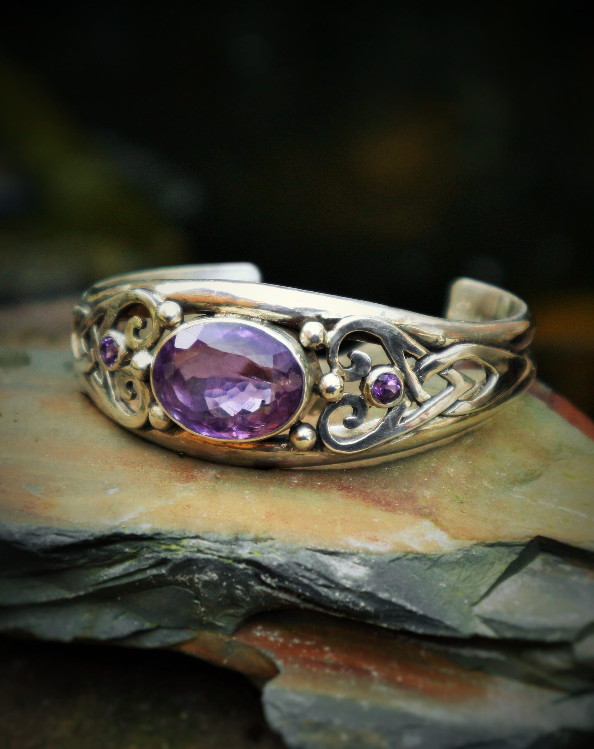 Een zware kwaliteit armband met een keltisch fantasy motief aan weerszijden van een facetgeslepen amethyst .