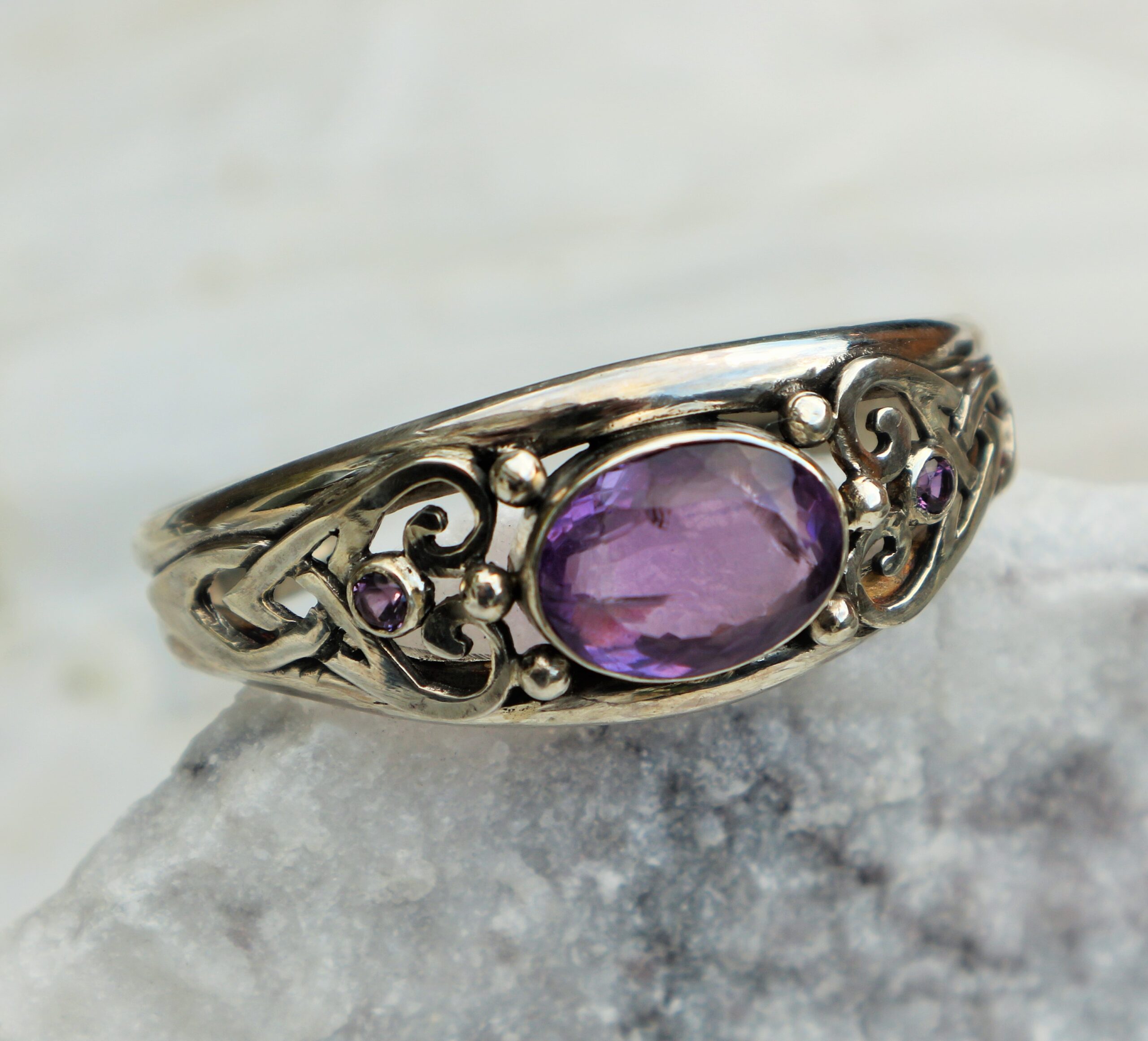 De middelste amethyst heeft een afmeting van 15×18 mm, de kleine amethysten aan de zijkanten zijn 5 mm rond .