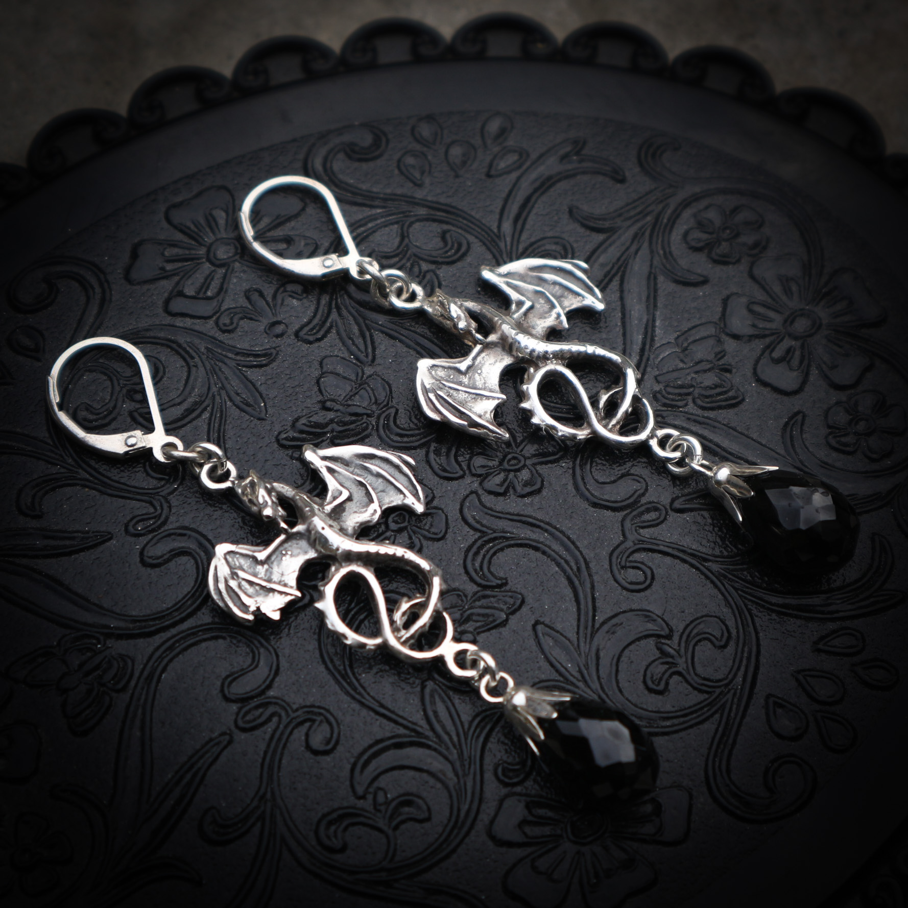 Een paar draken oorbellen in zilver met zwarte druppelvormige hangers .