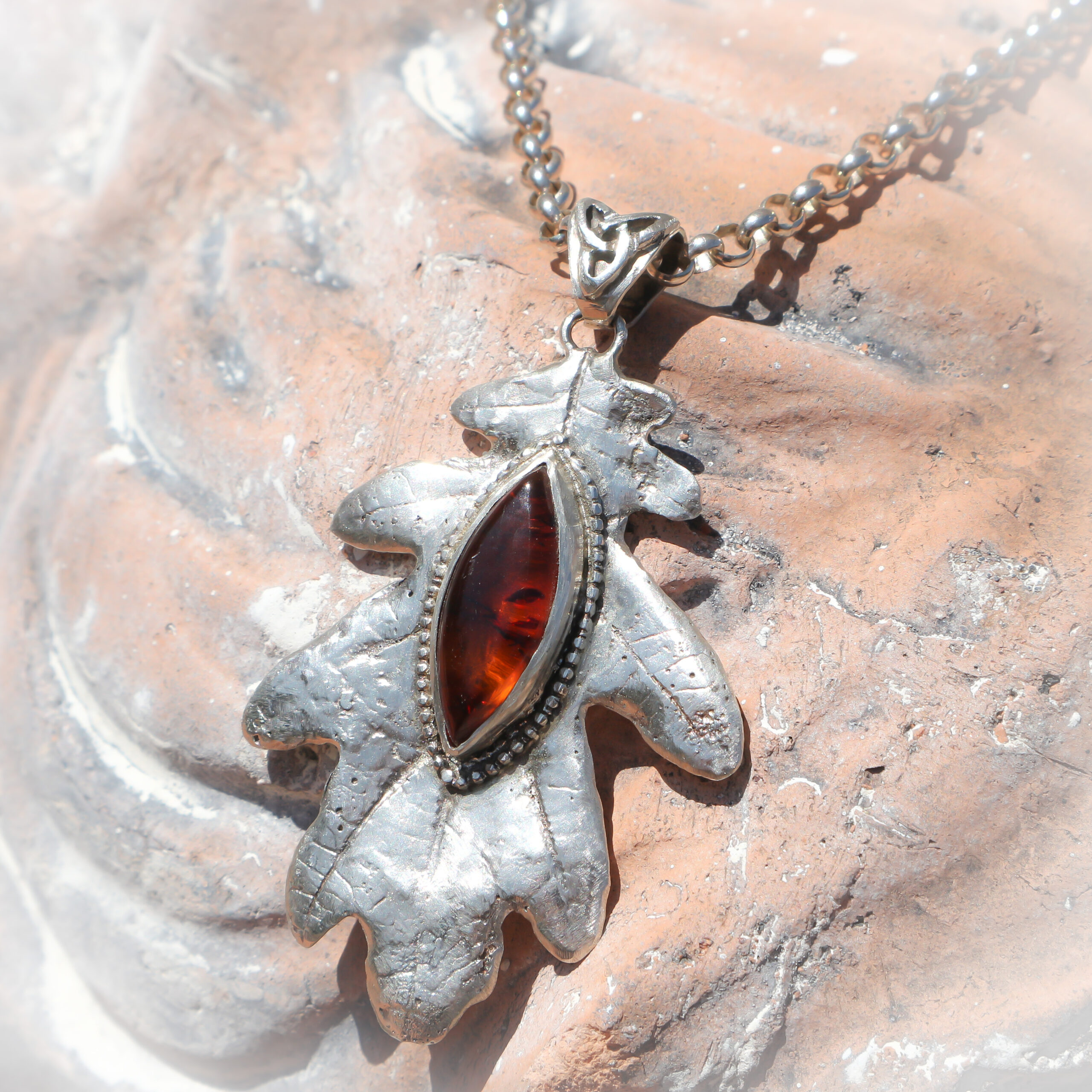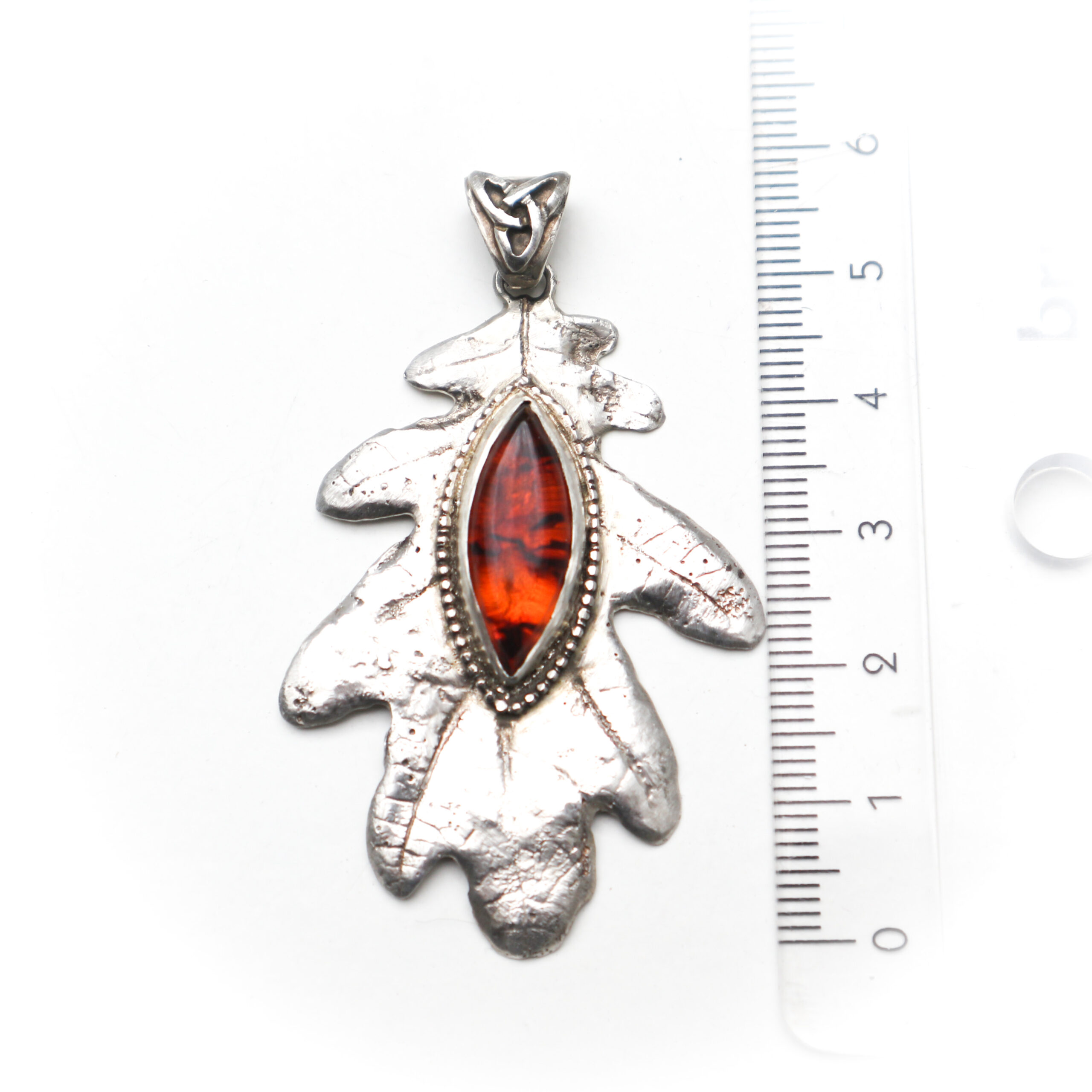 In het midden van het blad een prachtige, langwerpig geslepen barnsteen. Een warme, goudoranje steen, bekend om zijn organische schoonheid en unieke insluitingen .