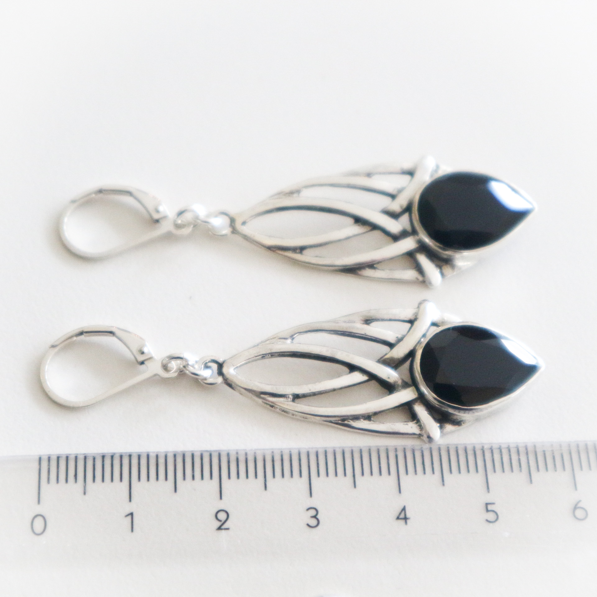 Een mooi paar grote oorbellen met zwarte stenen.