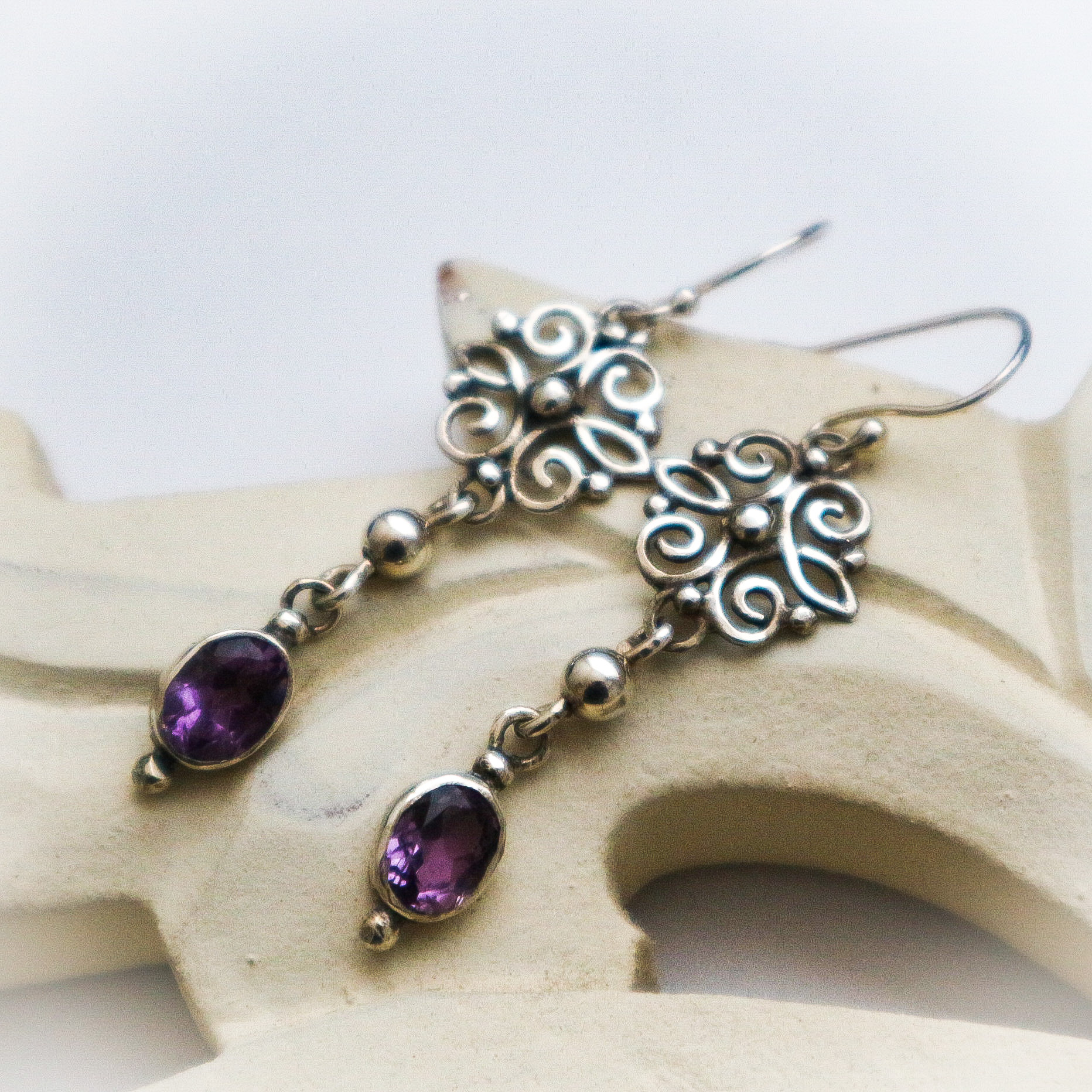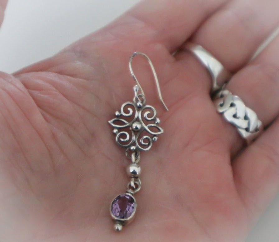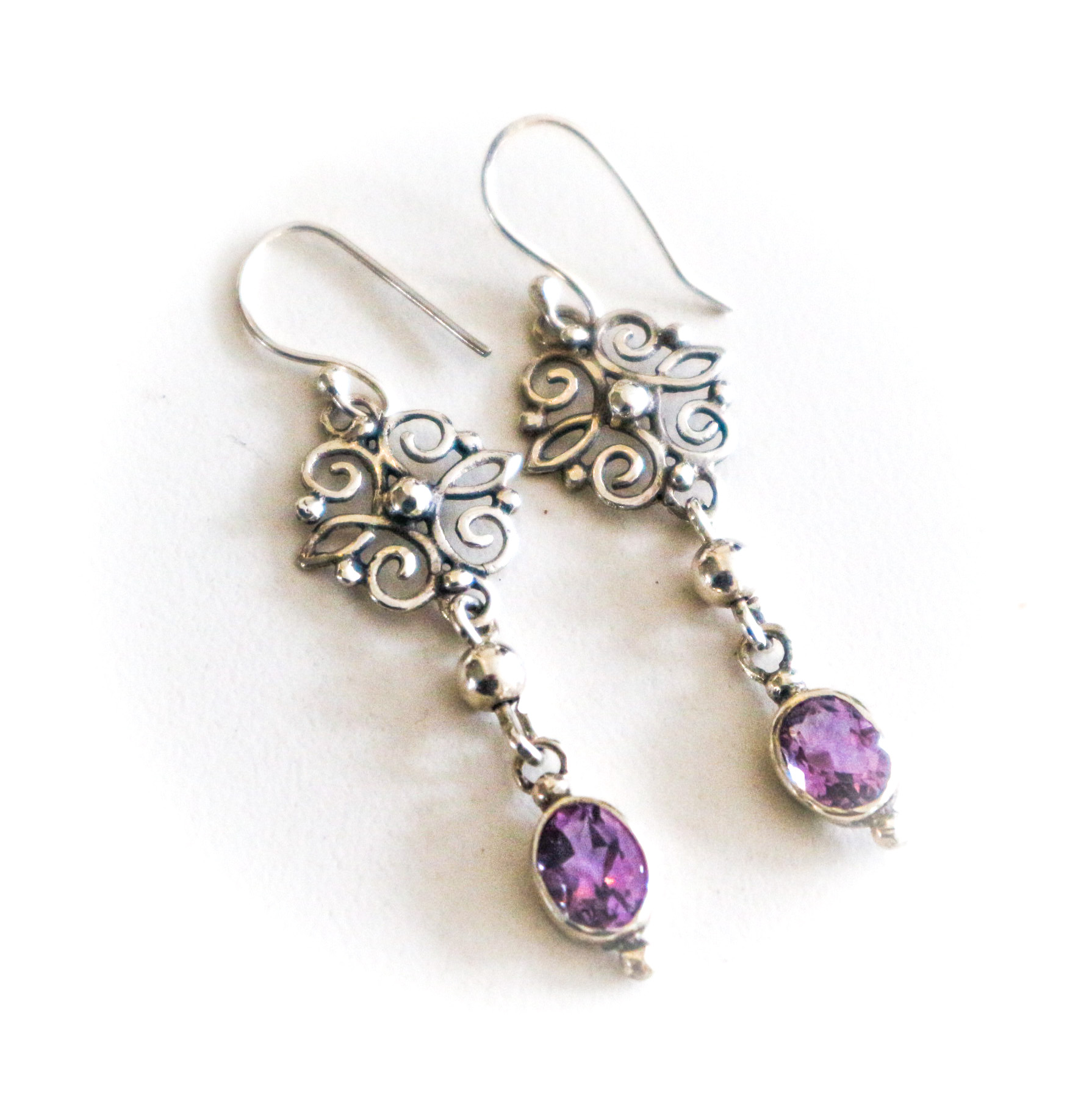 Een paar zilveren oorbellen in Barokstijl met amethysten