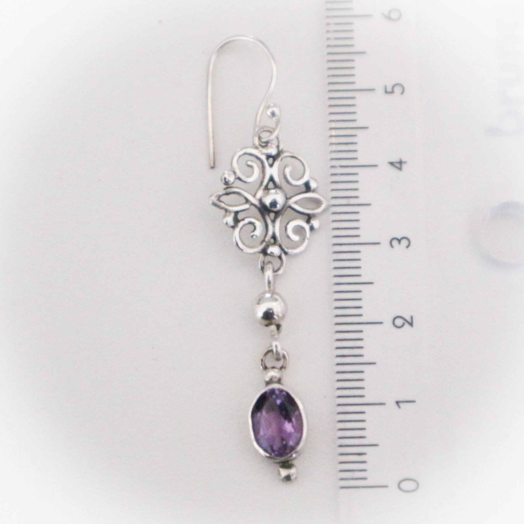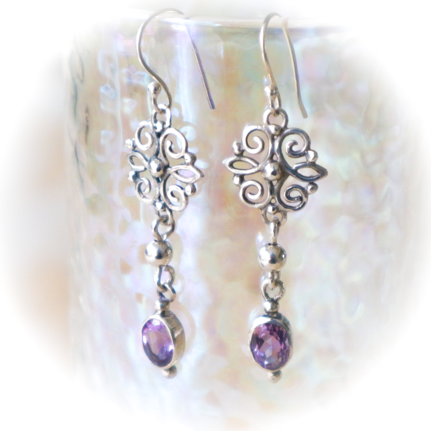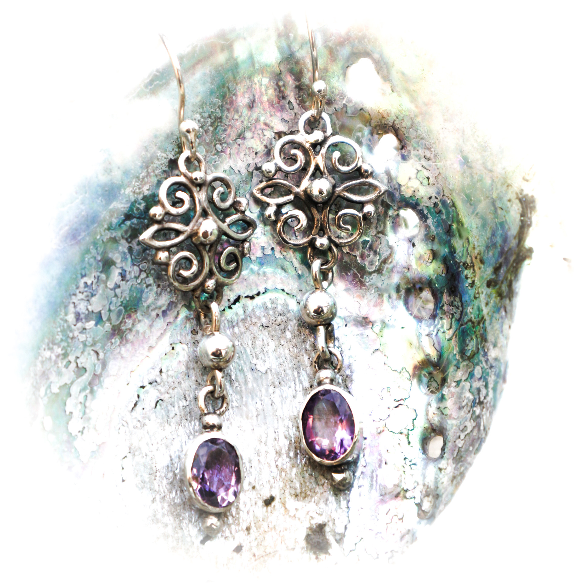 Een paar zilveren oorbellen in Barokstijl met amethysten