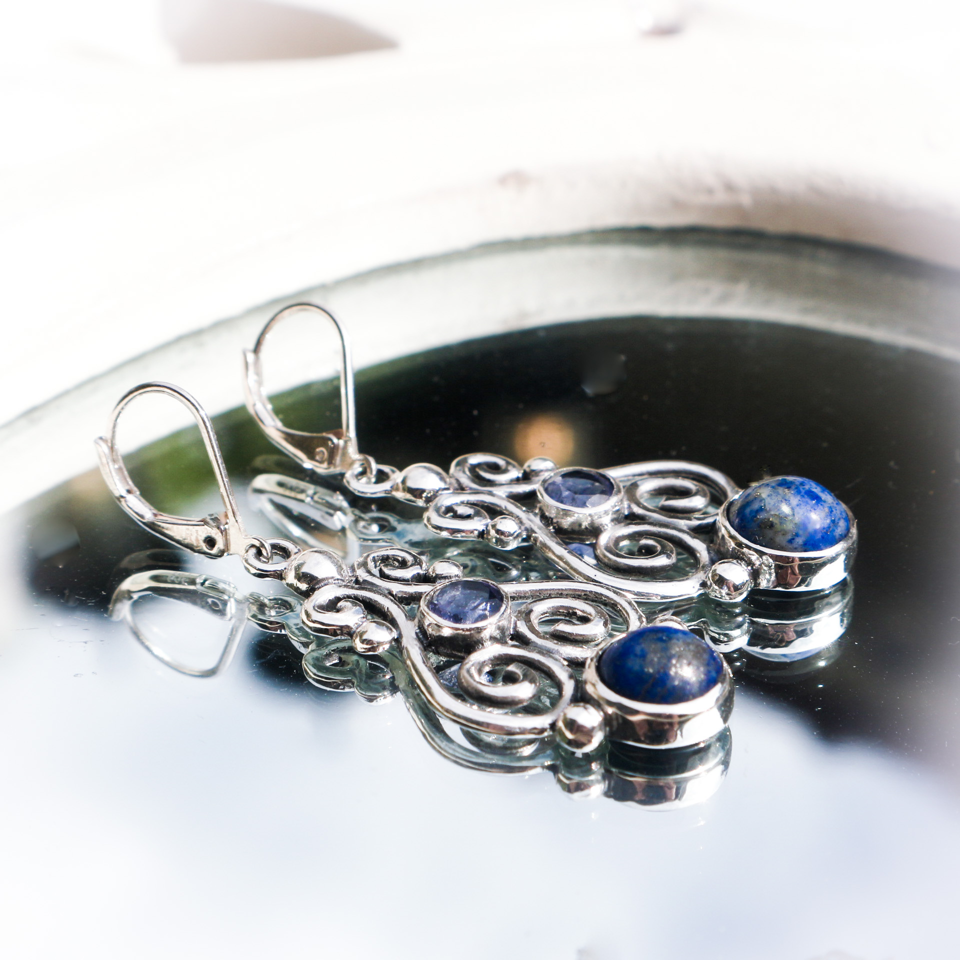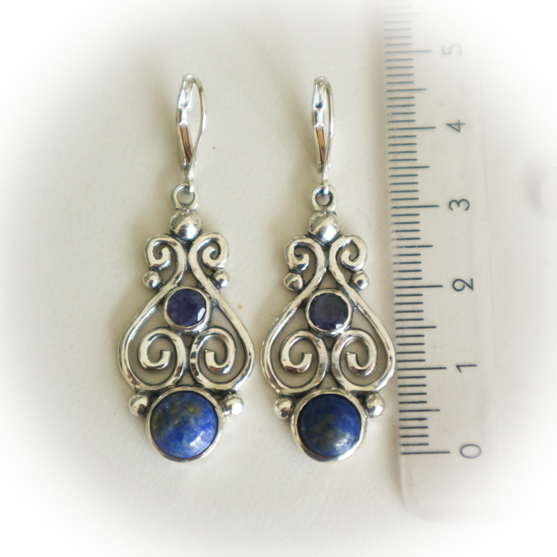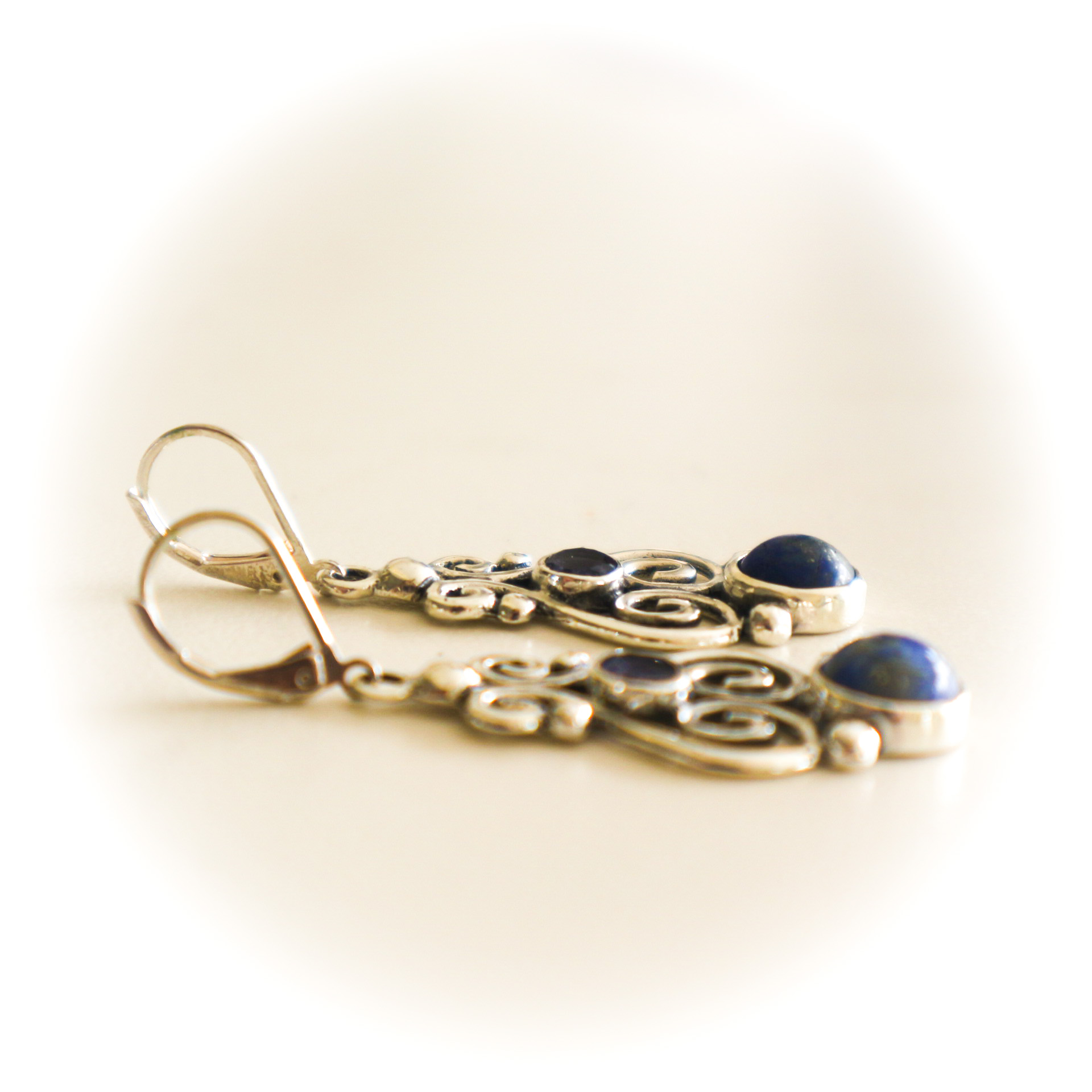 Een paar mooie, blauwe Lapis Lazuli stenen, omgeven door zilveren krullen in een barokke stijl .