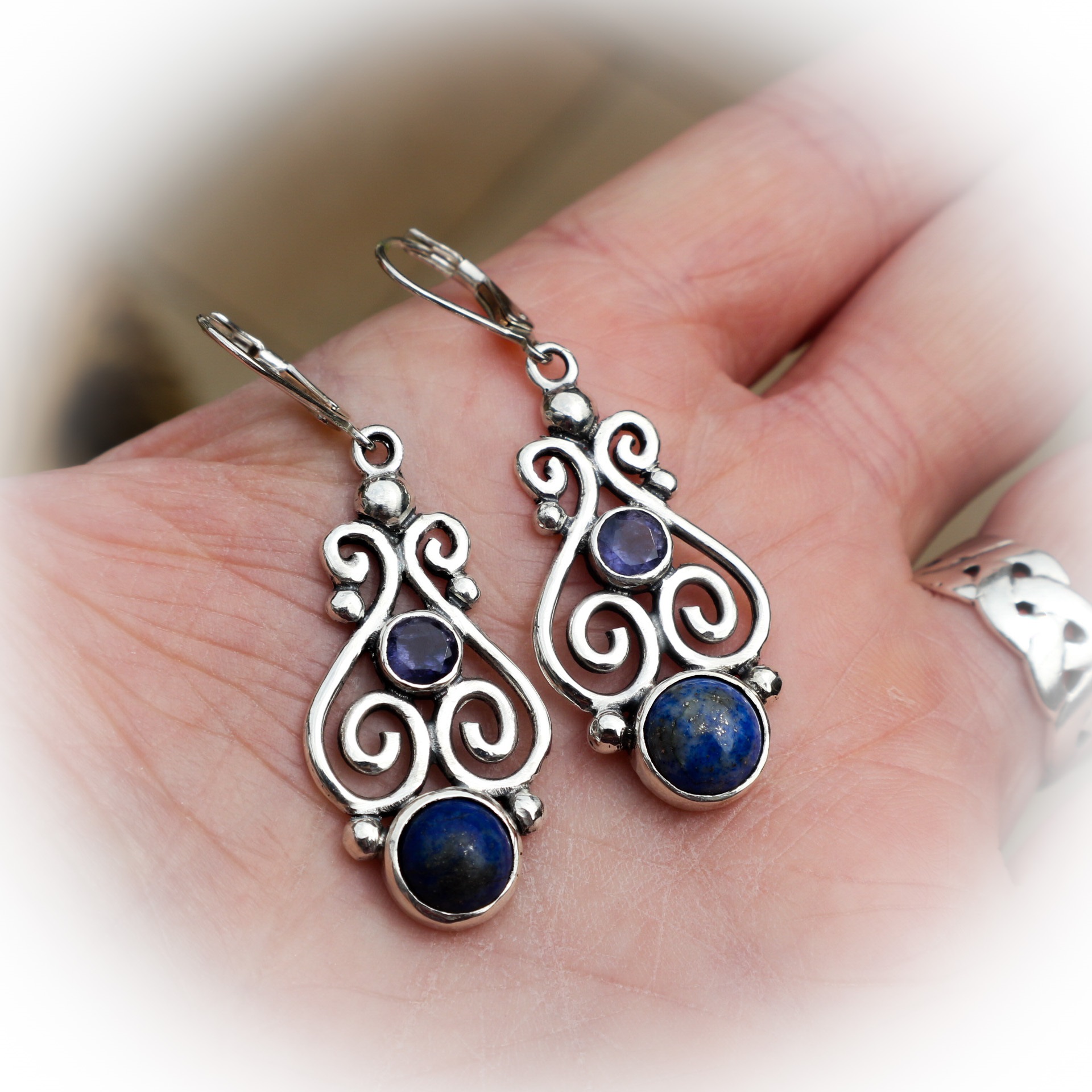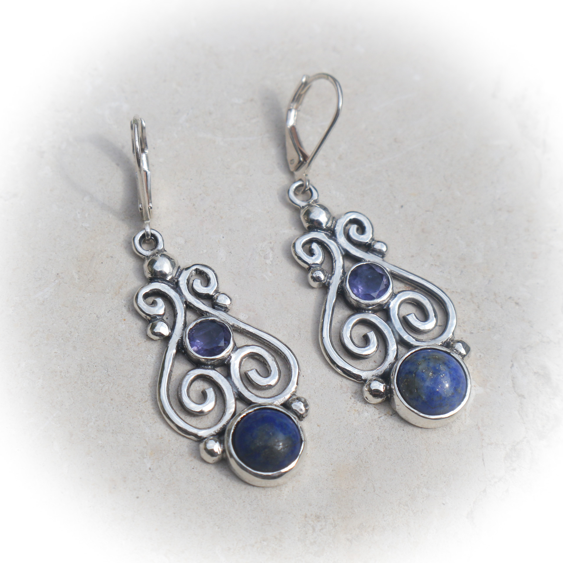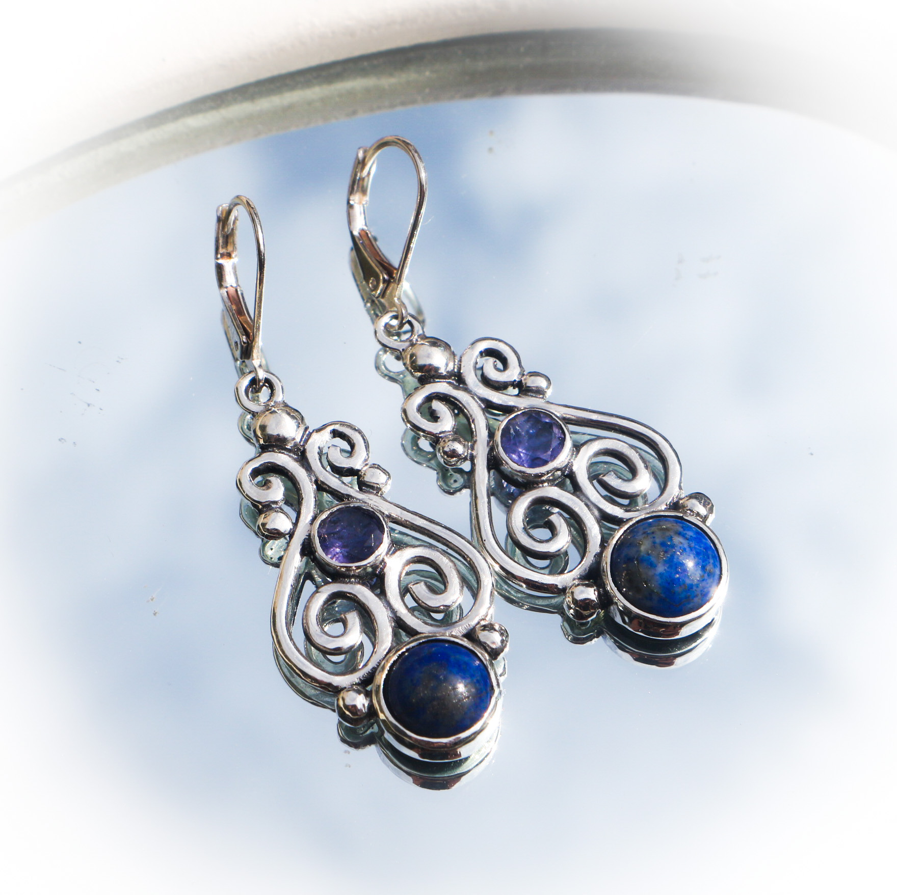 Een paar mooie, blauwe Lapis Lazuli stenen, omgeven door zilveren krullen in een barokke stijl .