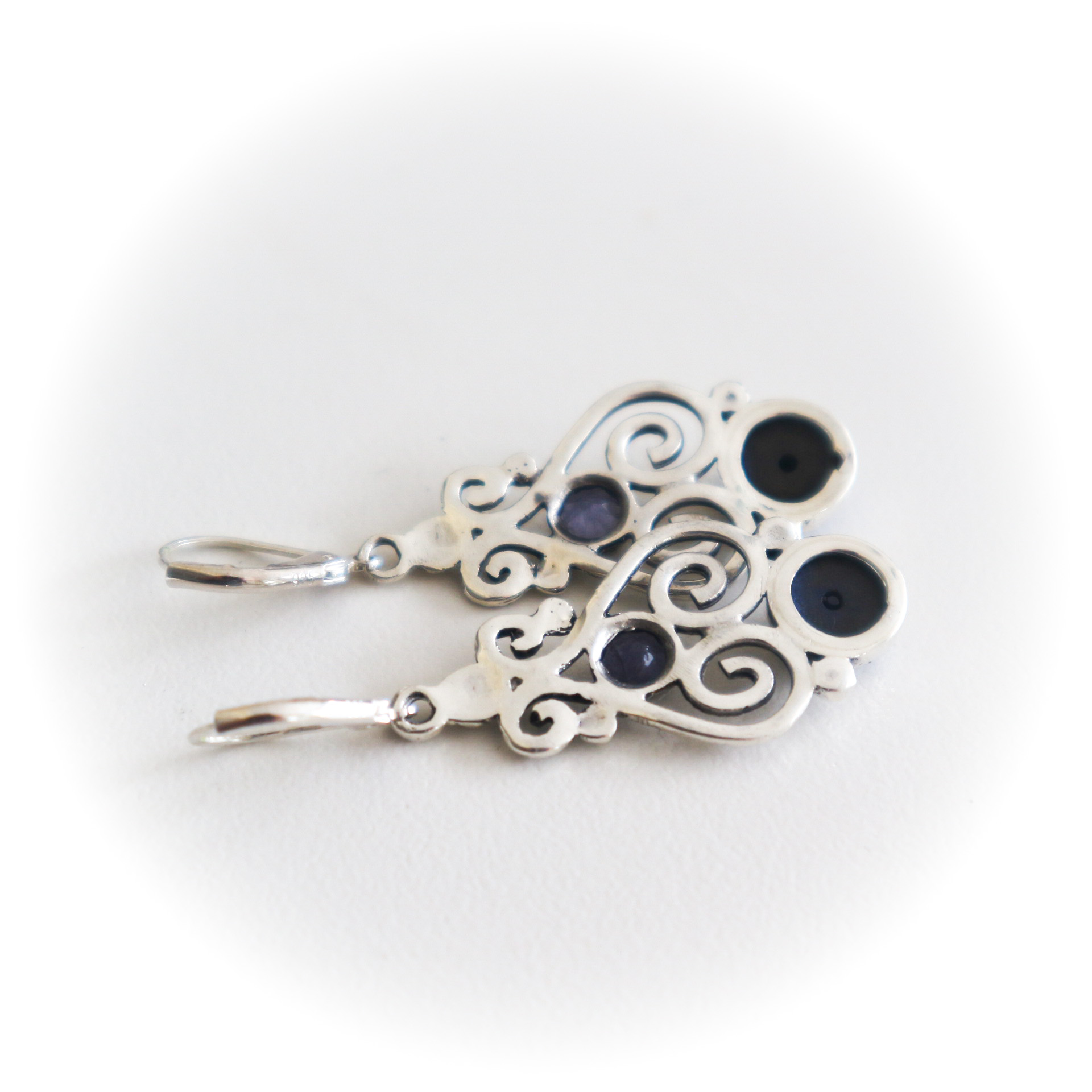 Bovenin de oorbellen een paar kleinere, facetgeslepen violetblauwe steentjes, dit zijn ‘watersaffieren’ , oftewel Ioliet ( formaat 5 mm rond ) .