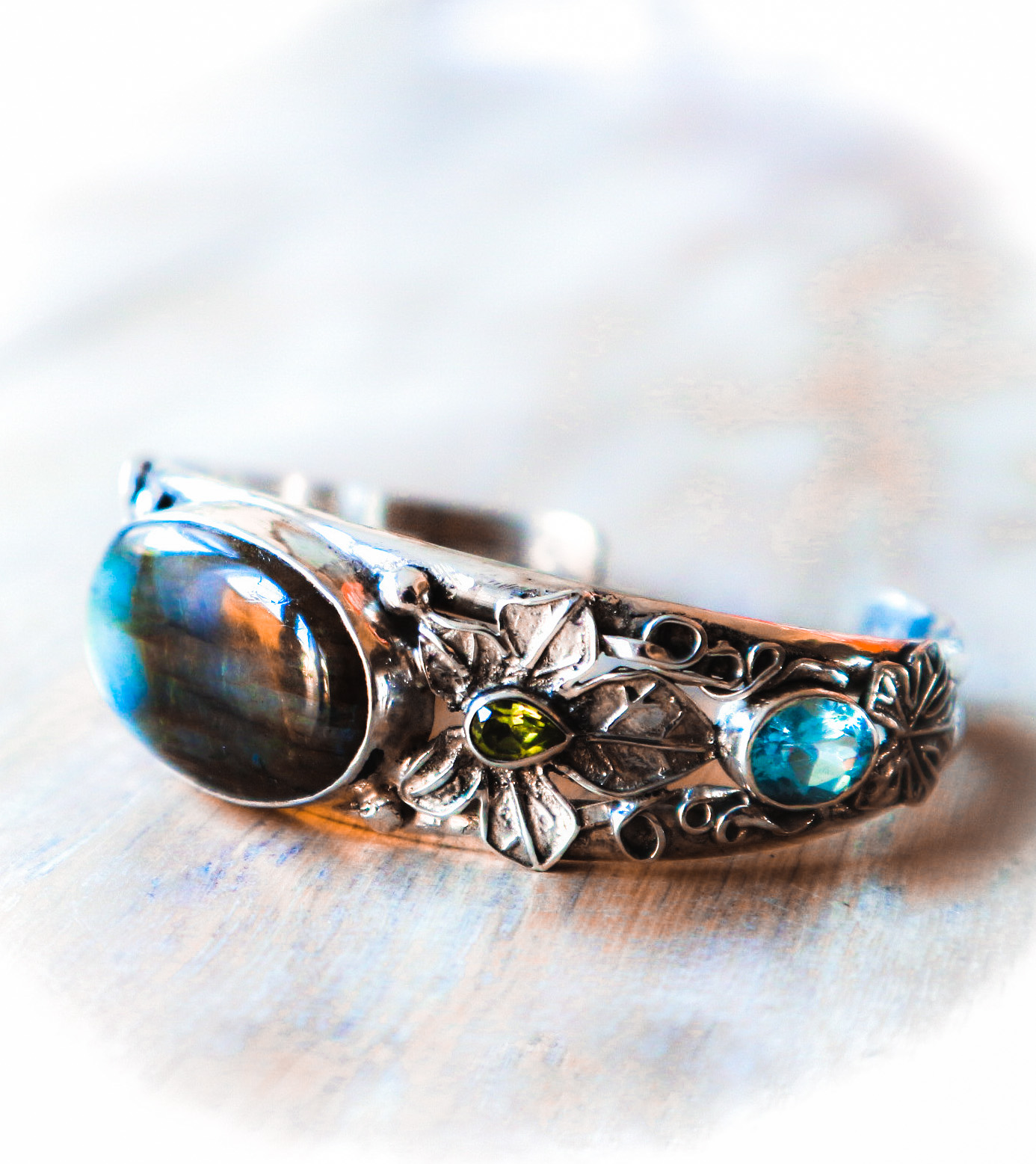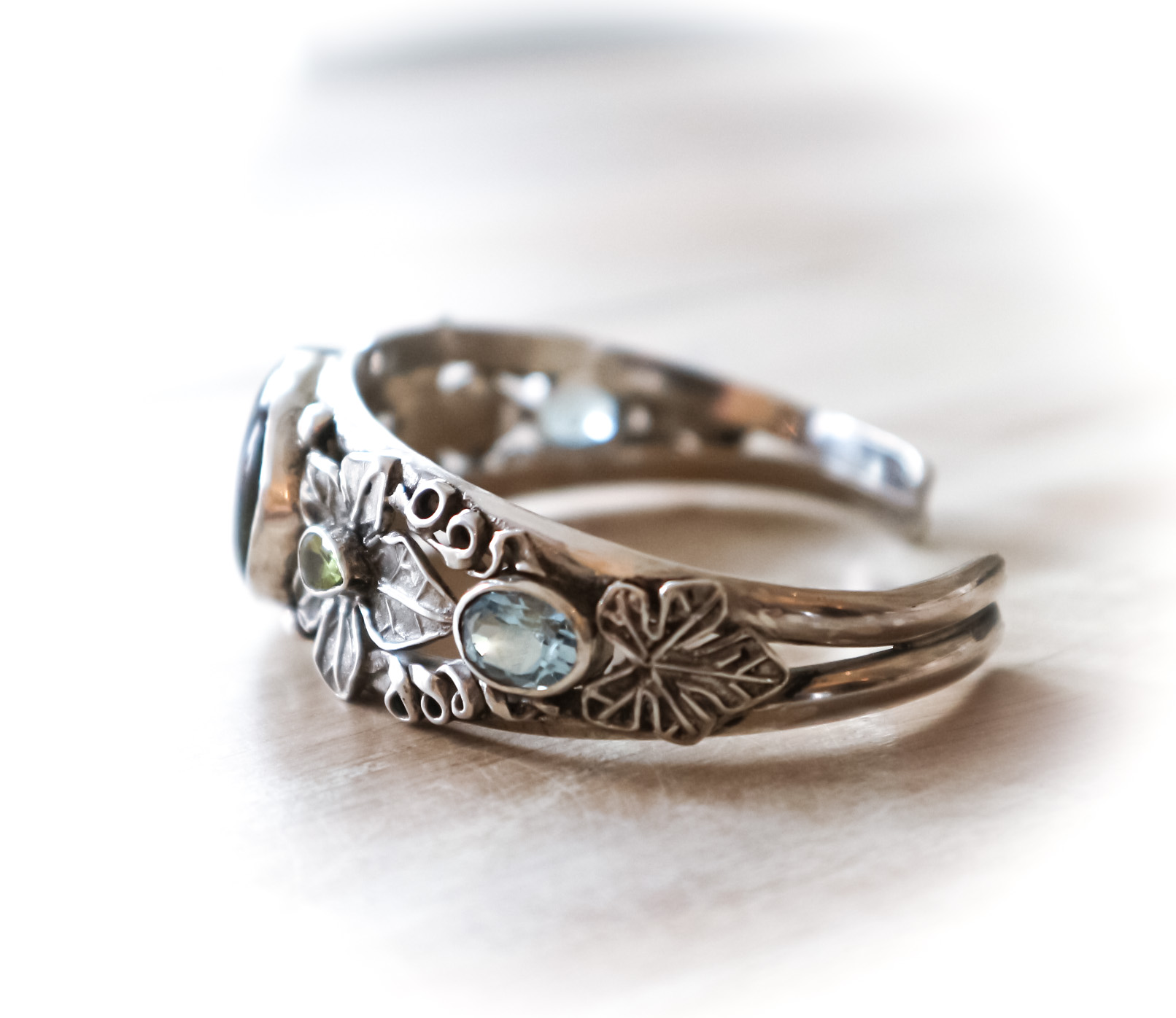 Heel wat uren werk en een behoorlijke hoeveelheid zilver en edelstenen in deze unieke armband .