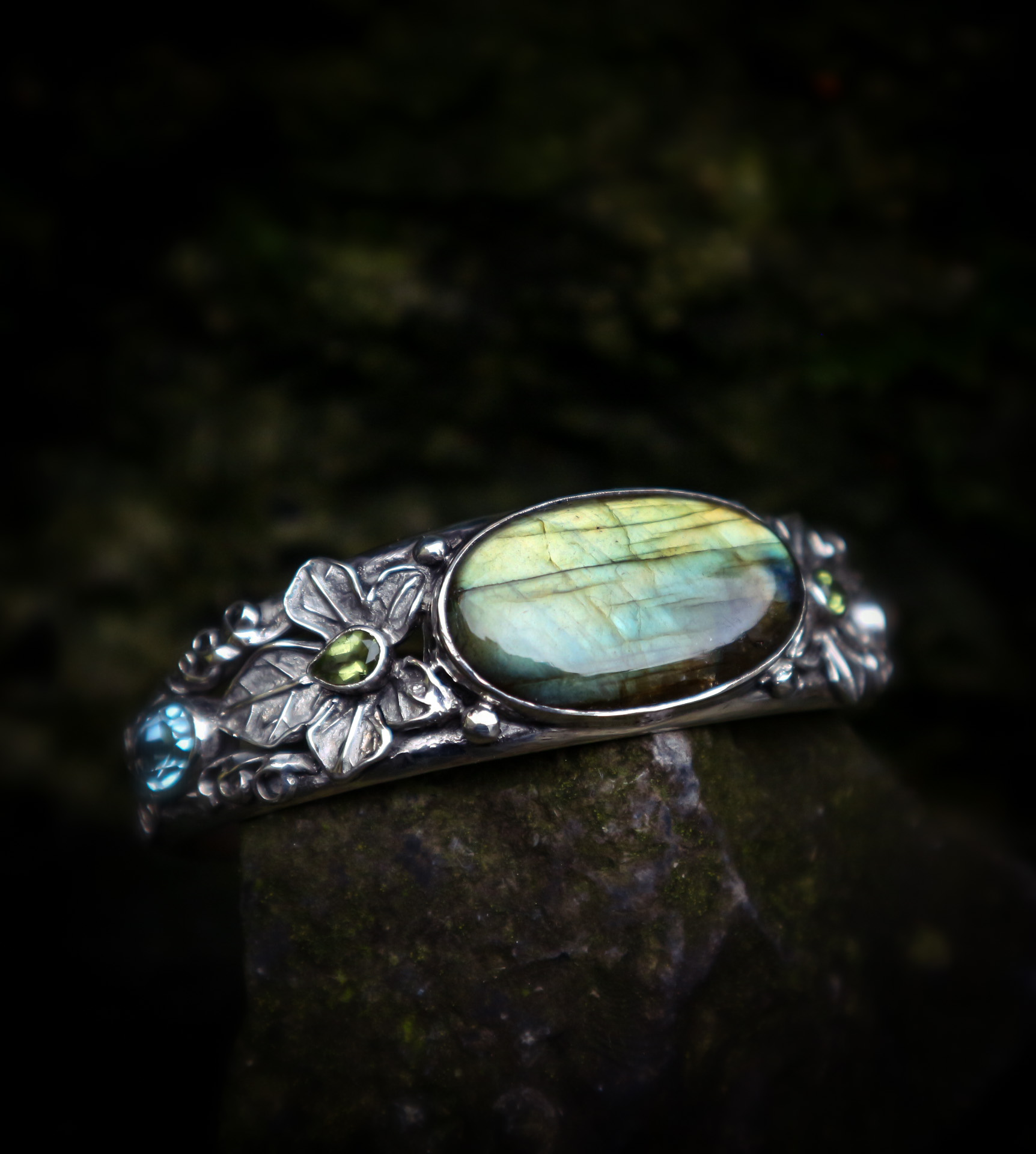 In het midden een prachtige labradoriet (18×35 mm ) die allerlei kleuren heeft, voornamelijk groen en blauw .
