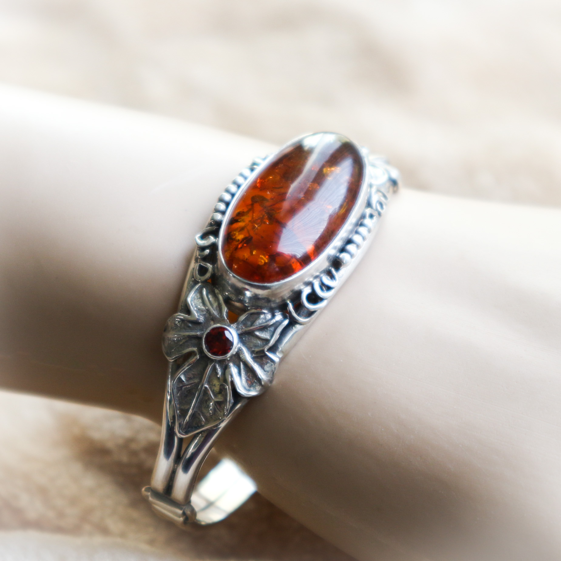 Aan weerszijden van de barnsteen een mooi, gestyleerd blad, met een schitterende facetgeslepen granaat edelsteen van 4 mm rond, verder afgewerkt met diverse fantasie details .
