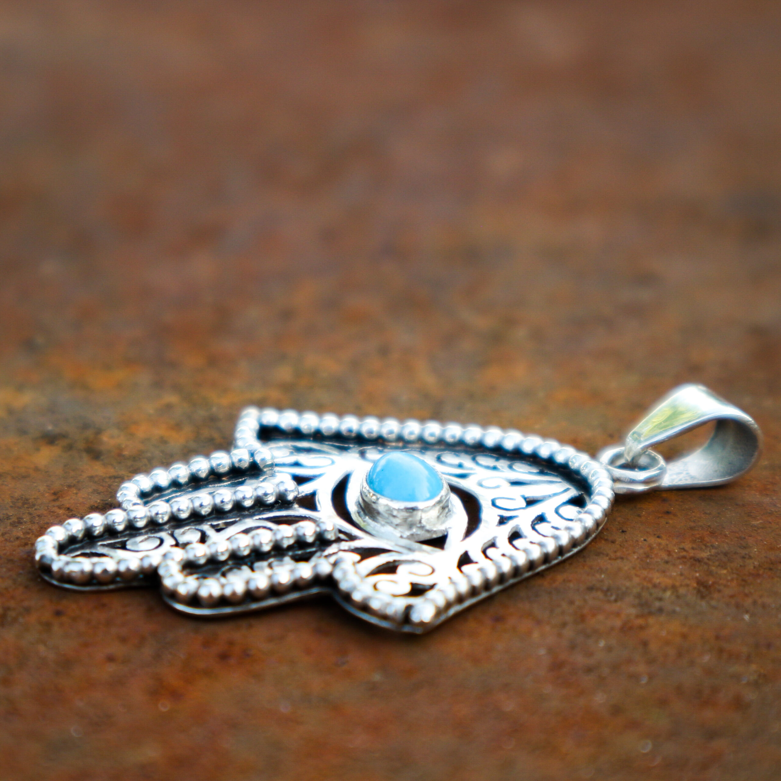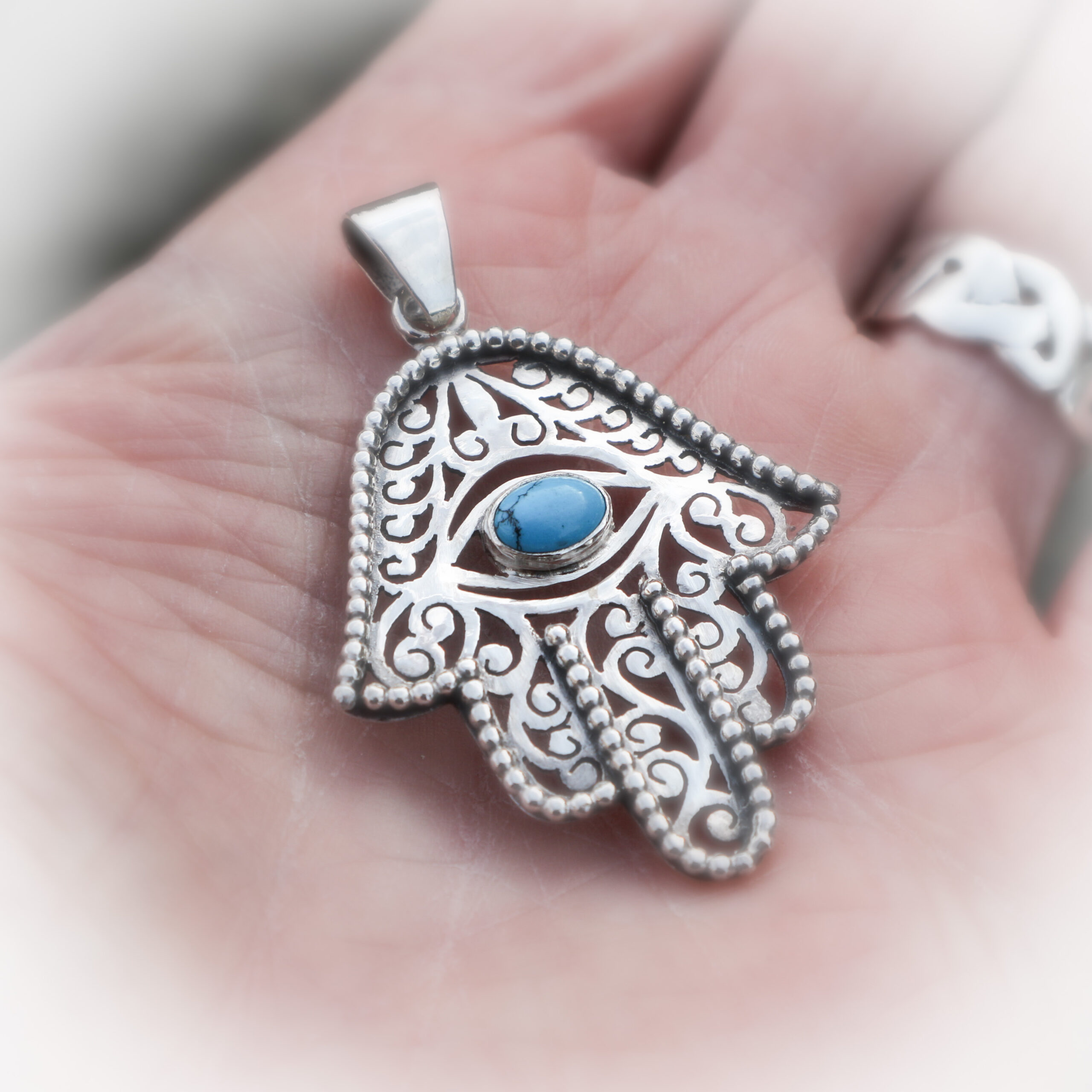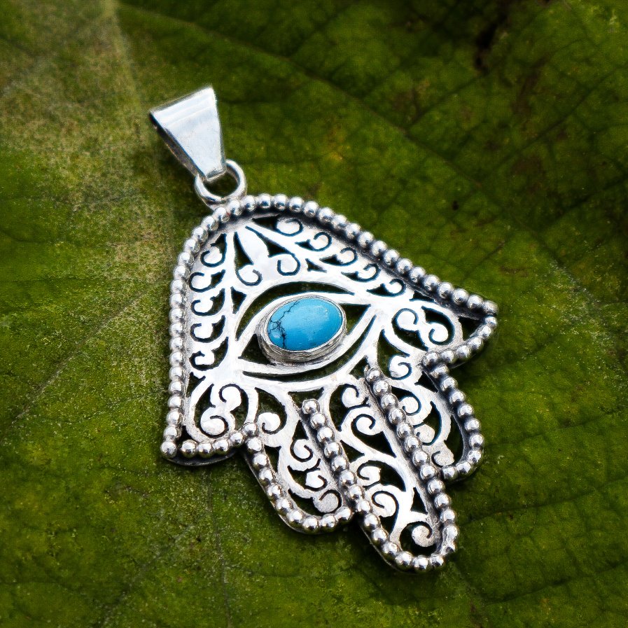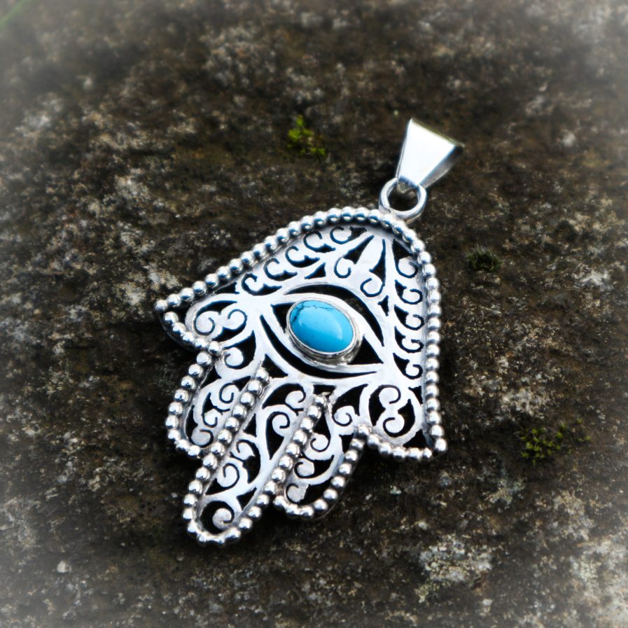 Hanger ‘hand van Fatima’ in zilver met turkoois steentje