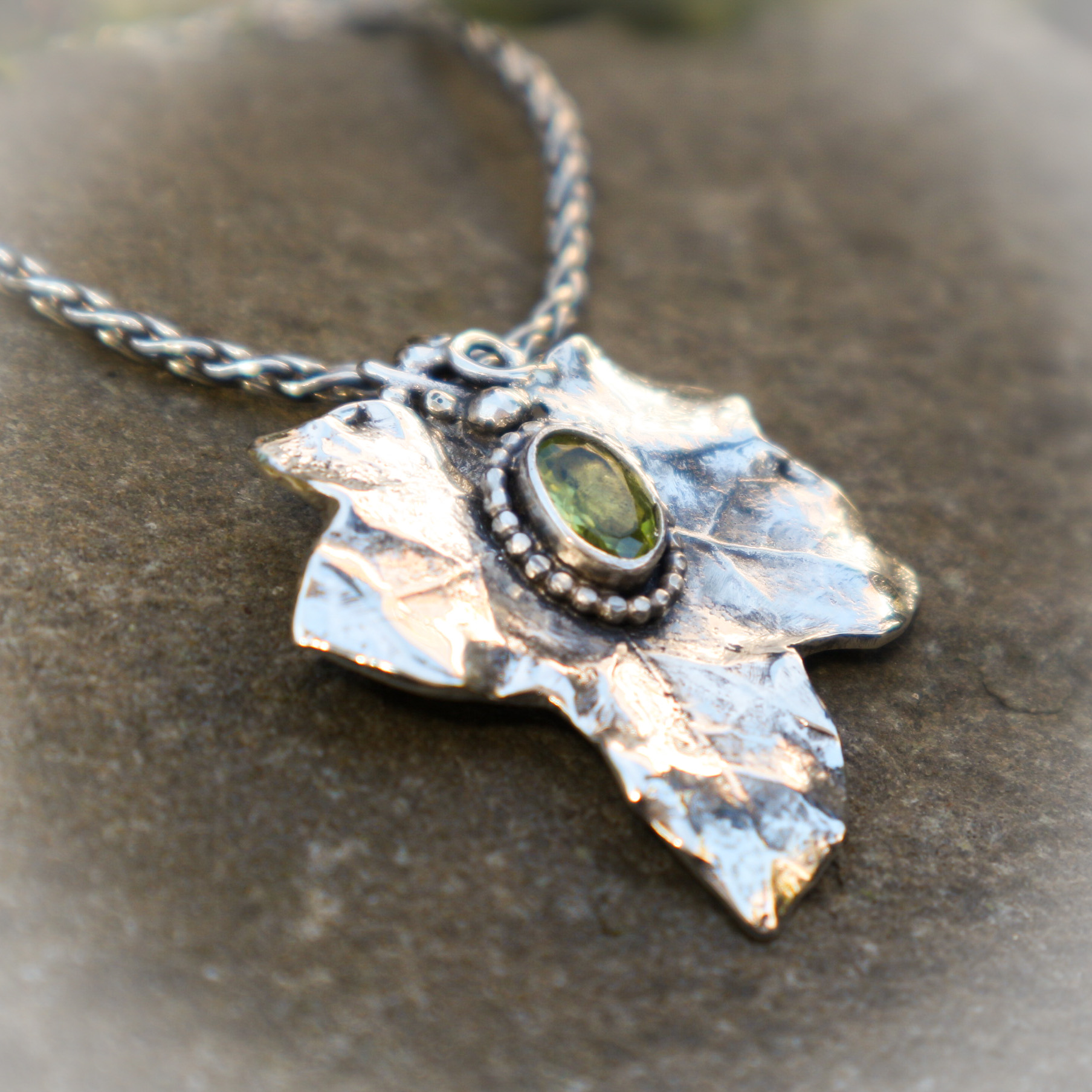 Een echt Klimopblad in zilver met een facetgeslepen peridot steen .