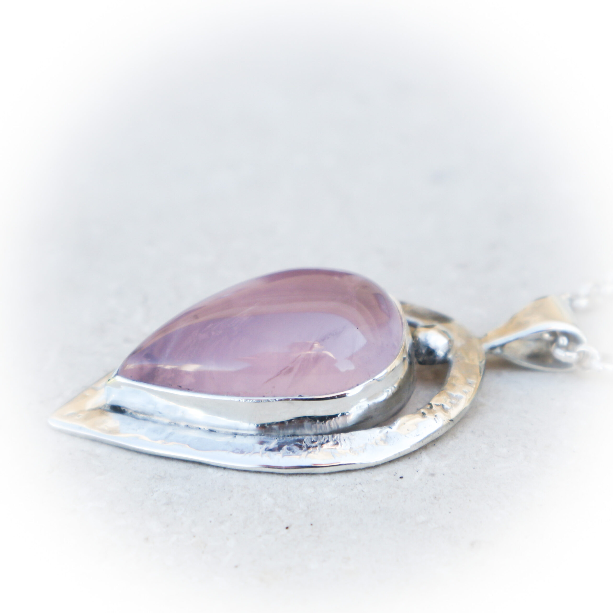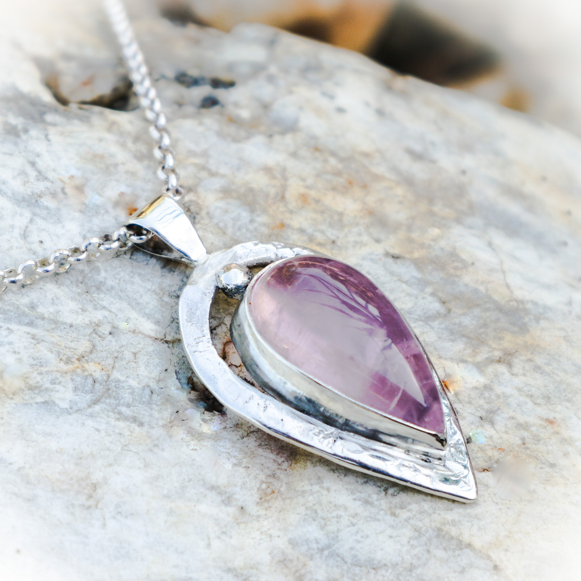 De zilveren zetting loopt in een sierlijke boog om de steen heen, en is ruw/gehamerd van oppervlak .