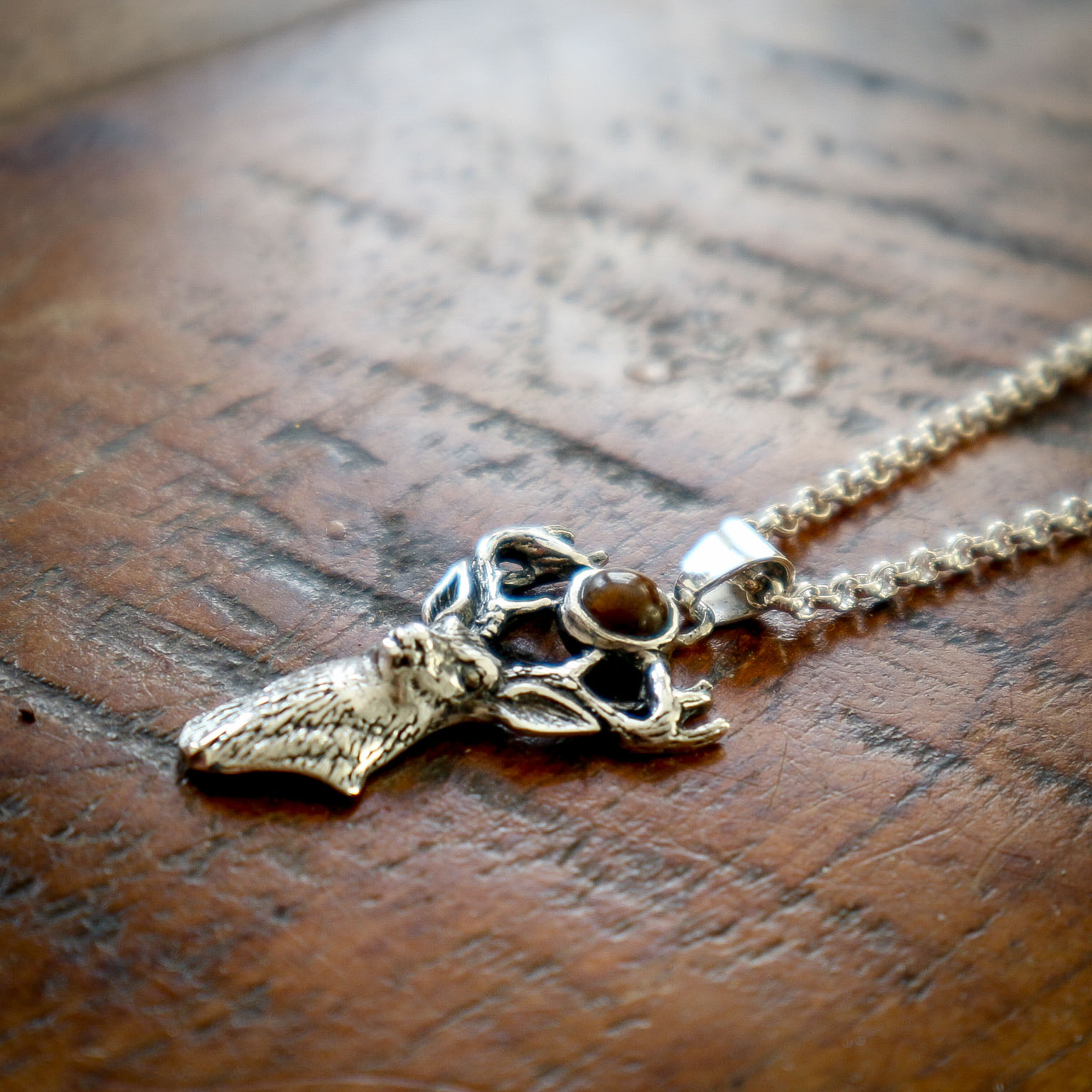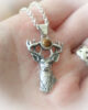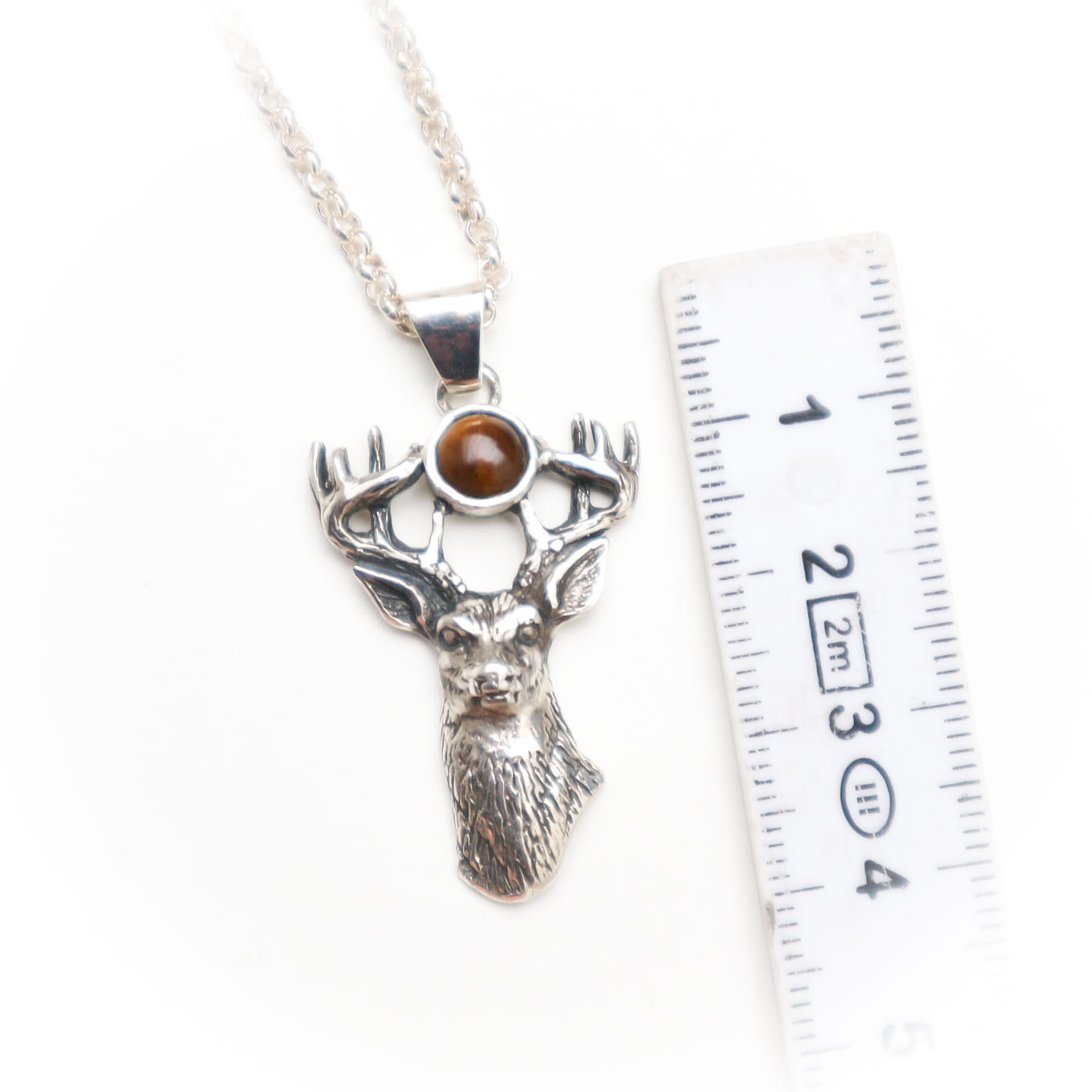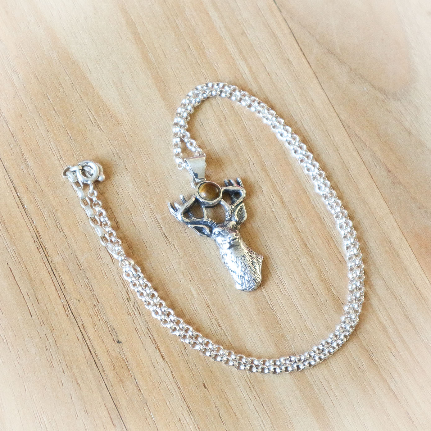Een zilveren hert met een tijgeroogje tussen zijn gewei .