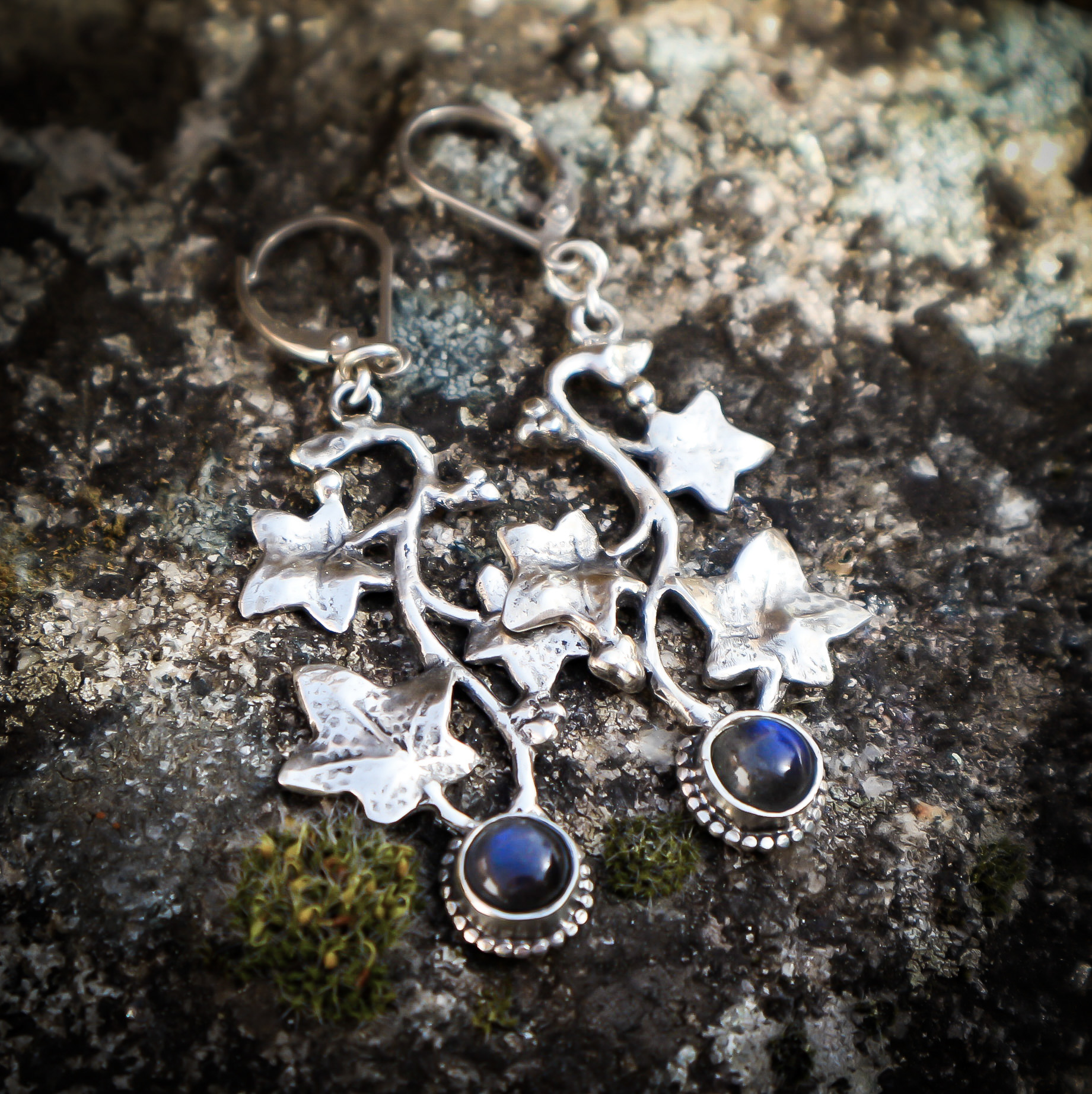 Een bijzonder en elegant paar oorbellen, een combinatie van klimopblaadjes met labradoriet stenen .