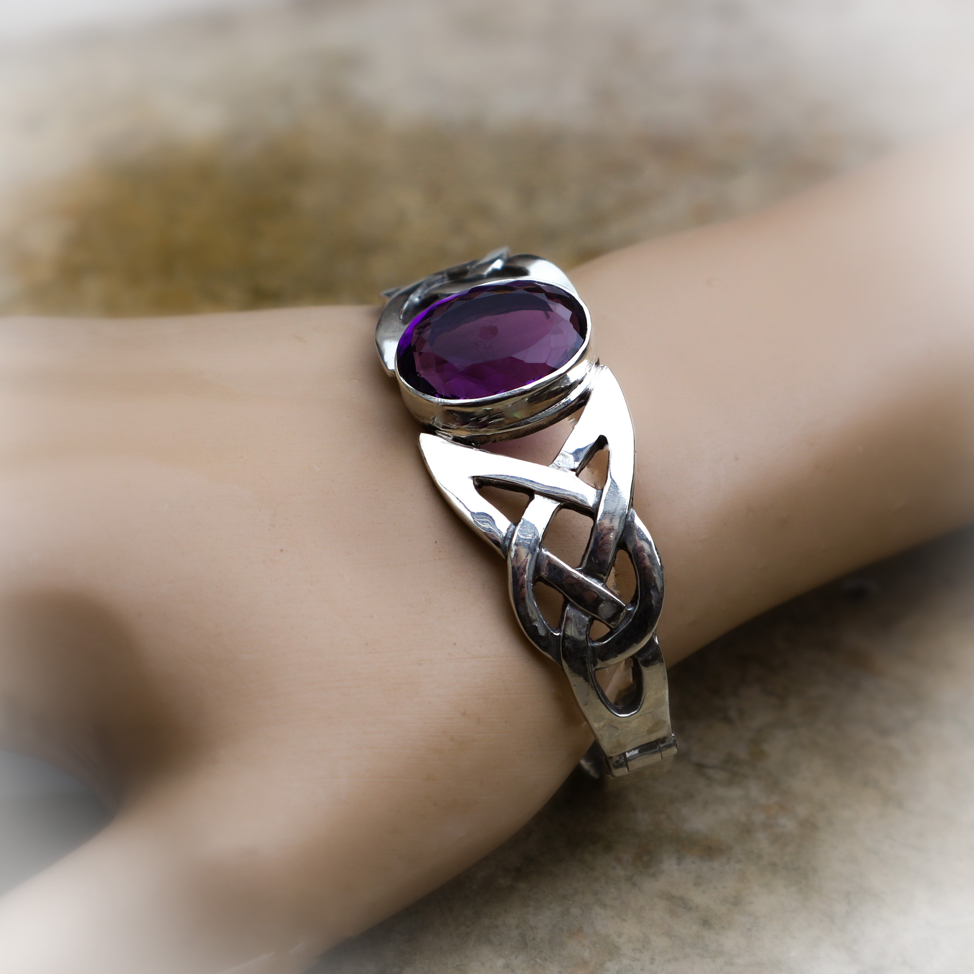 De blikvanger in deze armband is een facetgeslepen amethyst steen met een geweldig mooie, dieppaarse kleur van een behoorlijk formaat ; 14×18 mm .