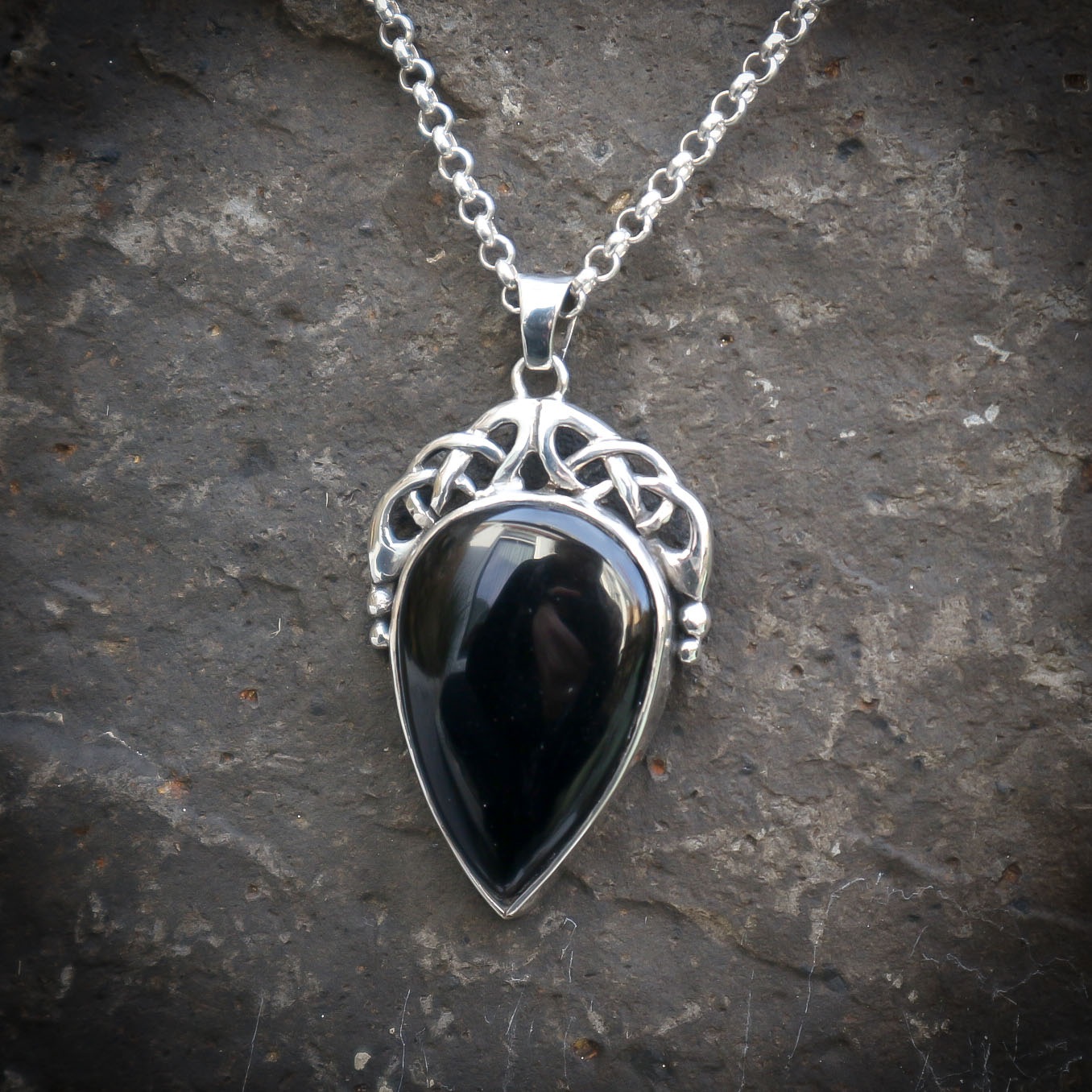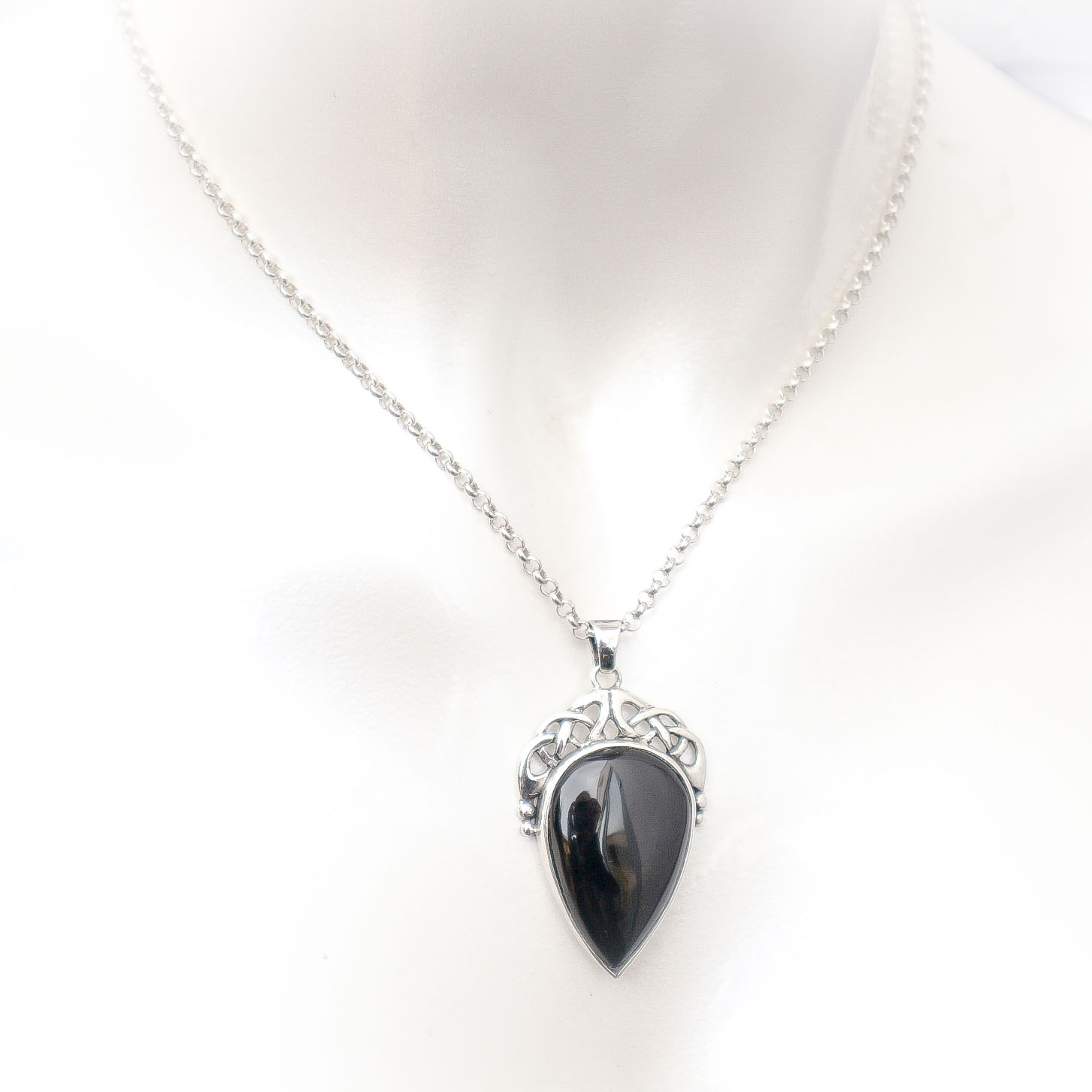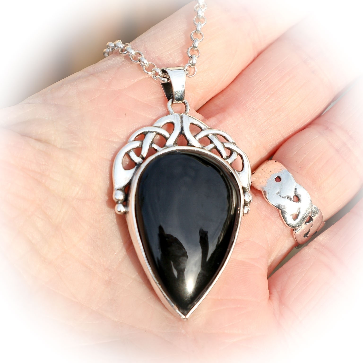 Rondom de steen een sierlijk keltisch vlechtwerk patroon in zilver .