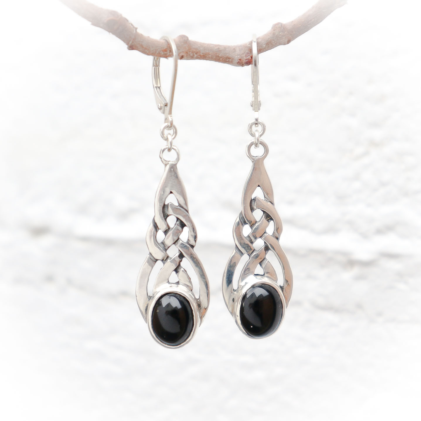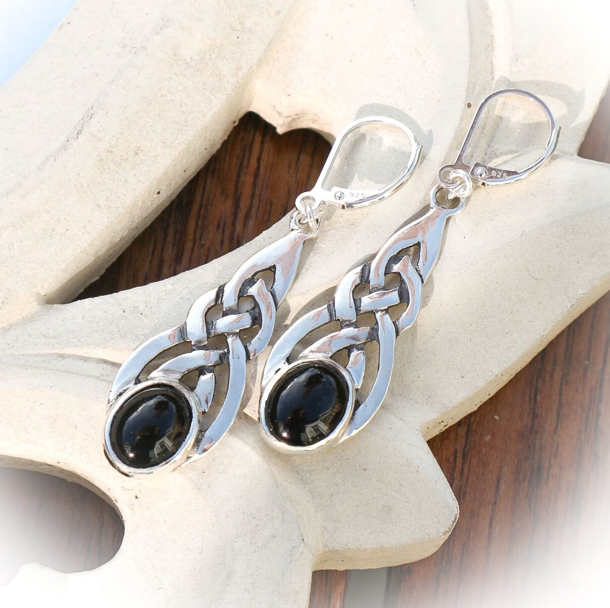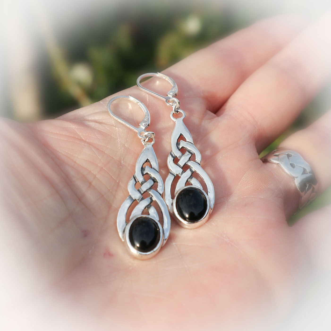 Een prachtig paar handgemaakte, keltische oorbellen met zwarte stenen .