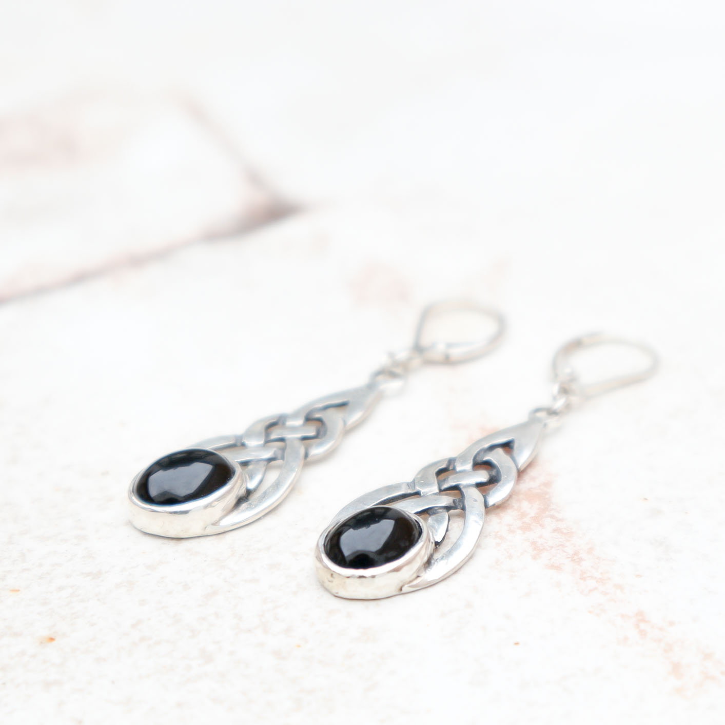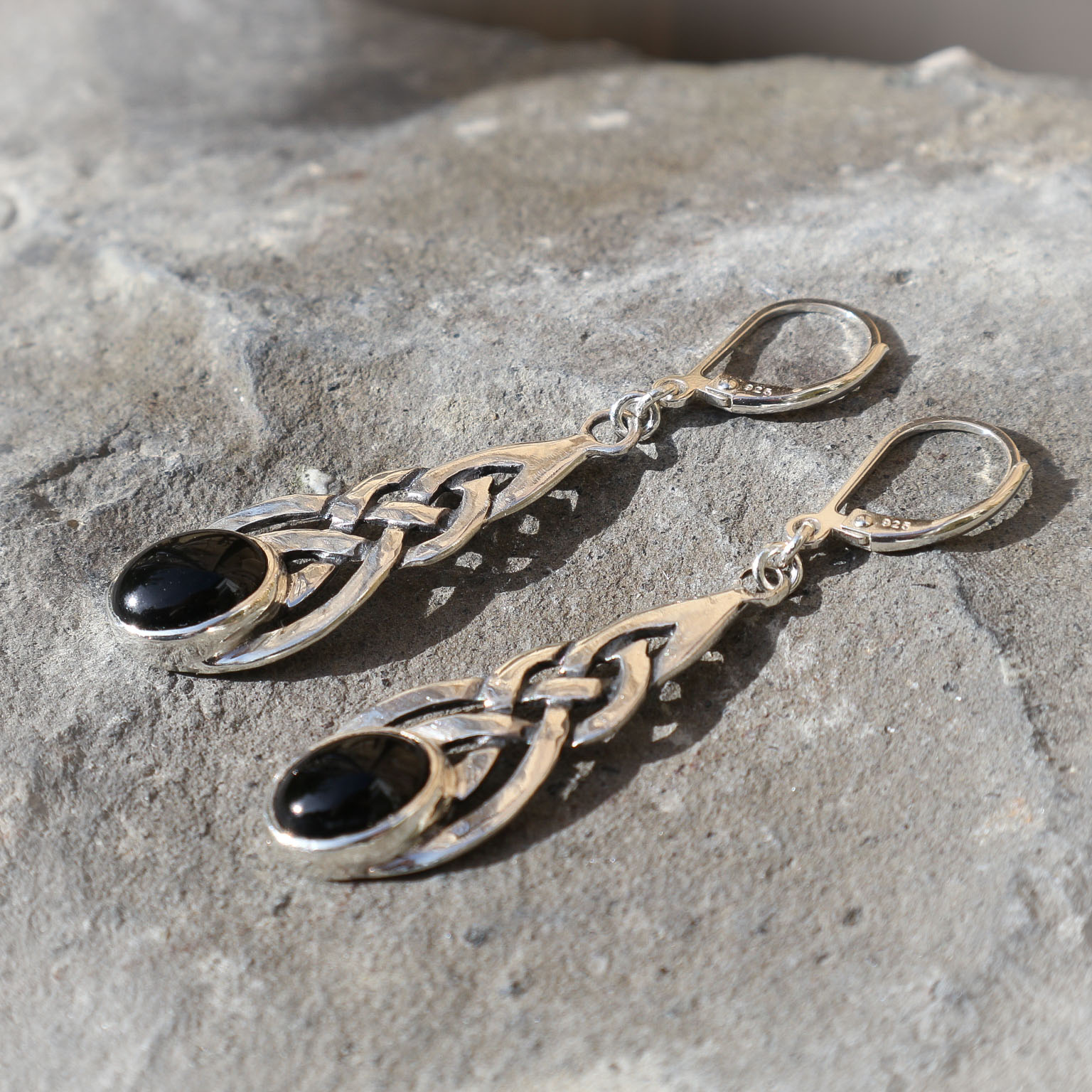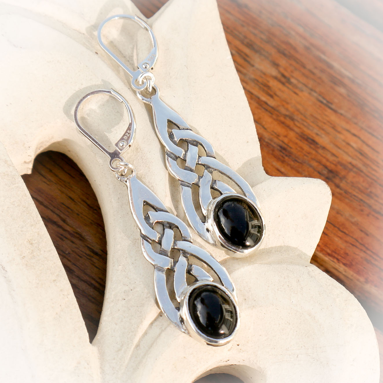 Een prachtig paar handgemaakte, keltische oorbellen met zwarte stenen .