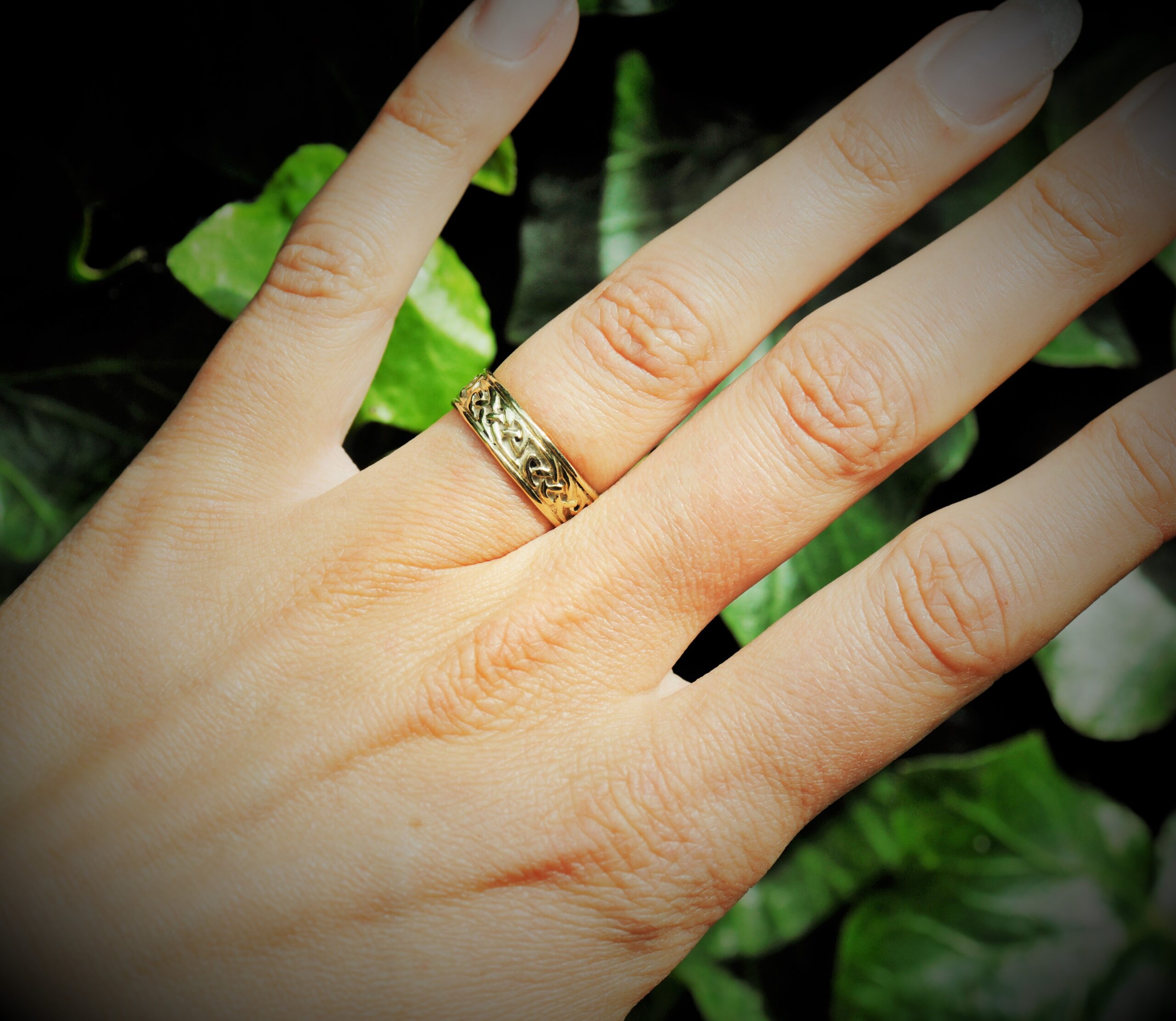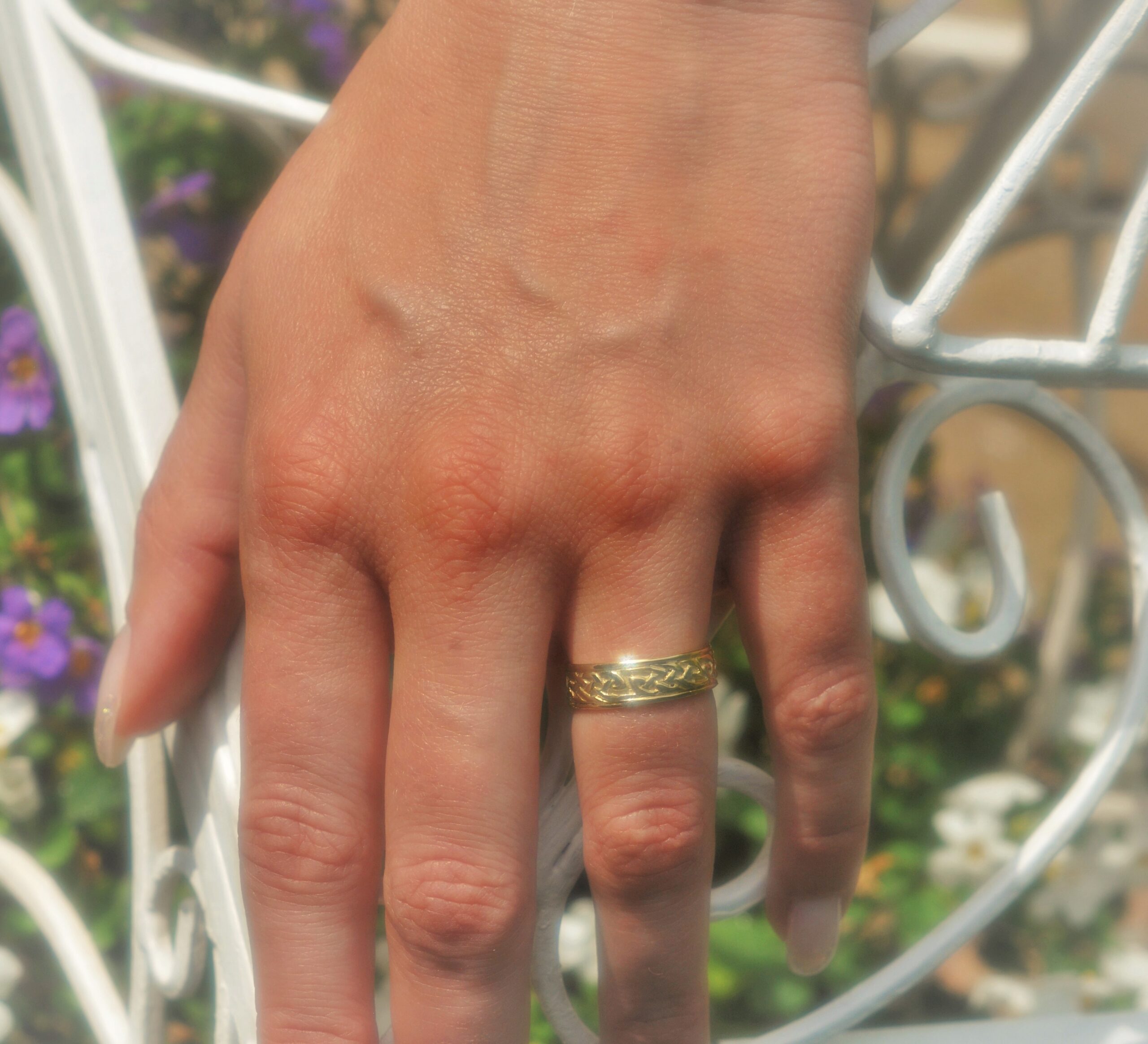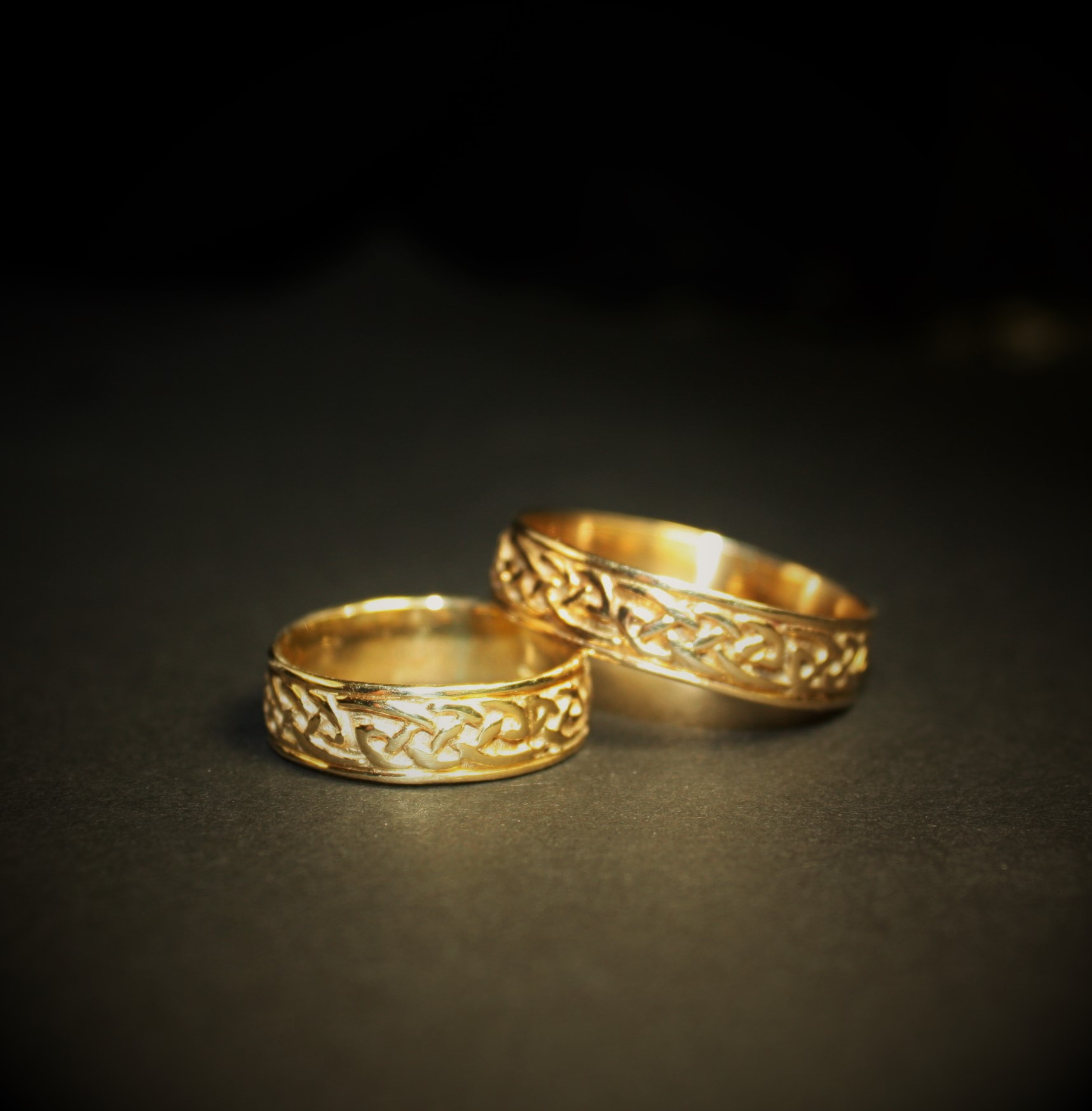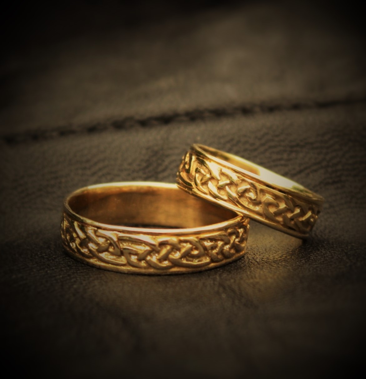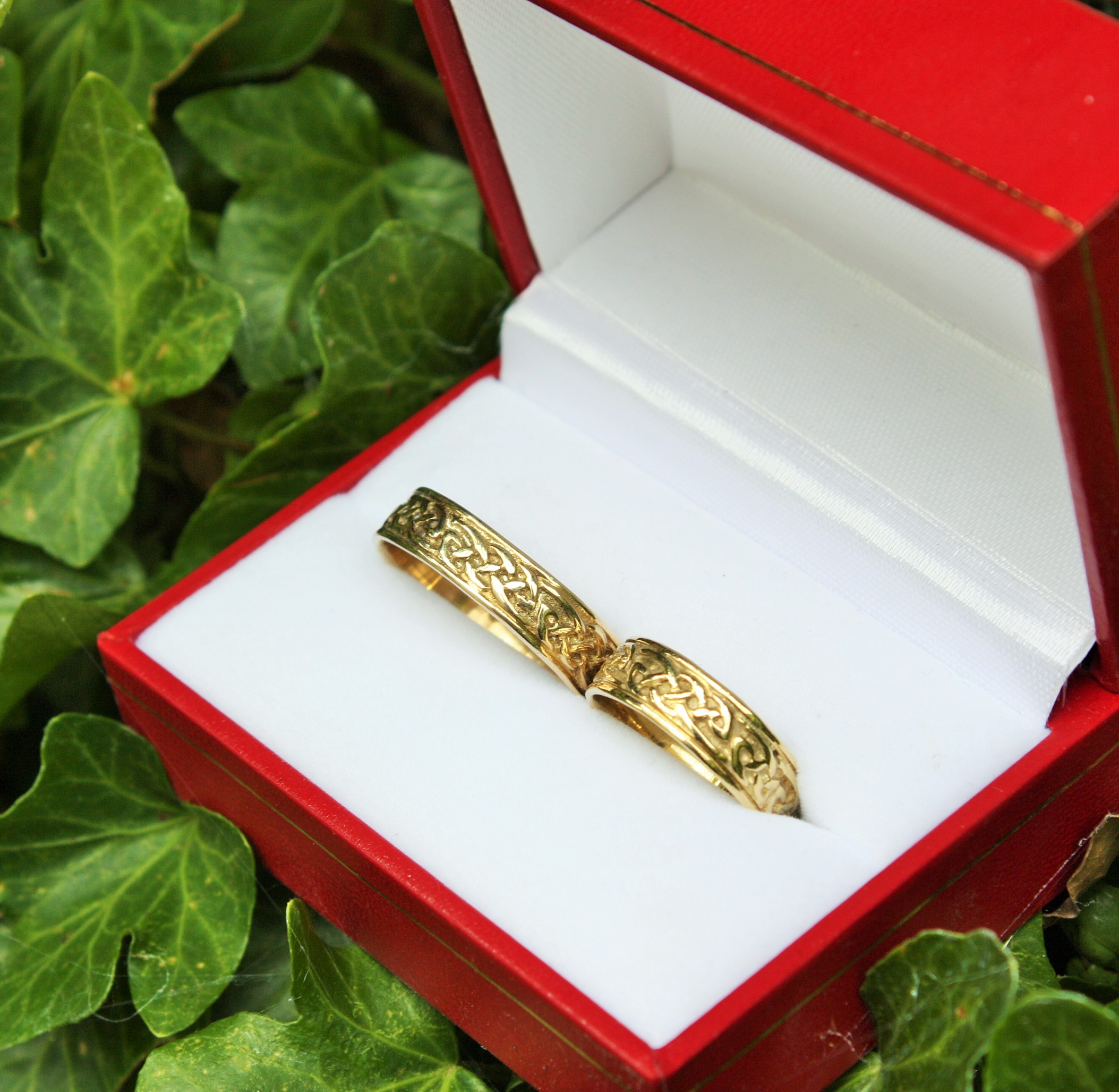 Een hele mooie set keltische trouw- of verlovingsringen ; “Eternity” . Gemaakt in ons eigen atelier in 14 kt goud .