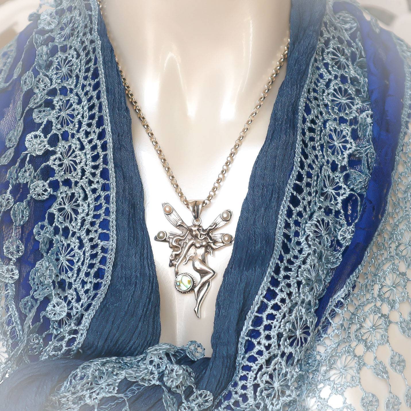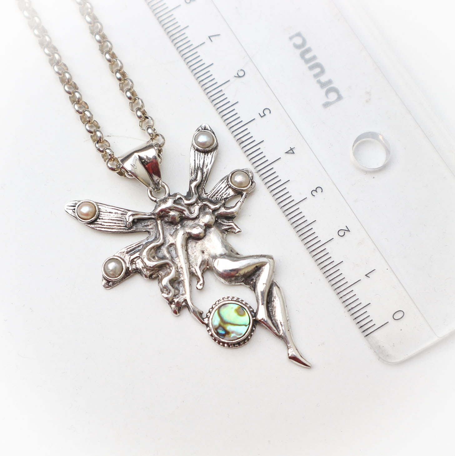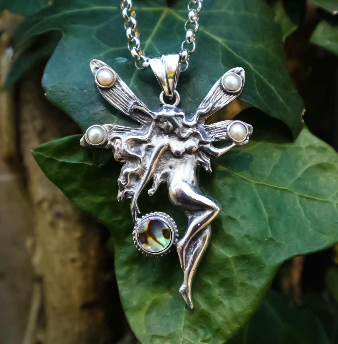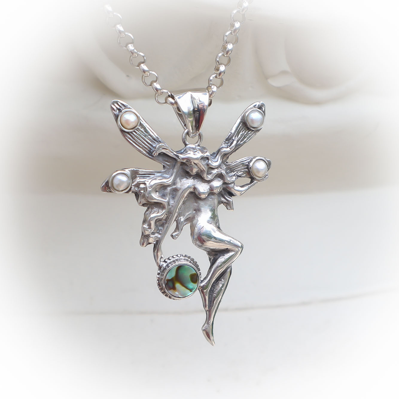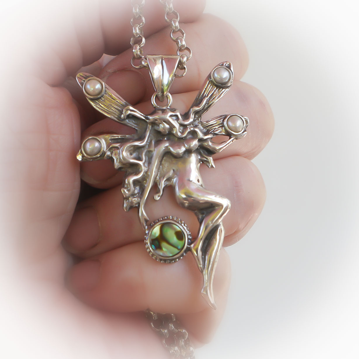 Dit is een Art Nouveau replica hanger van een elf, met in haar vleugels echte pareltjes,
