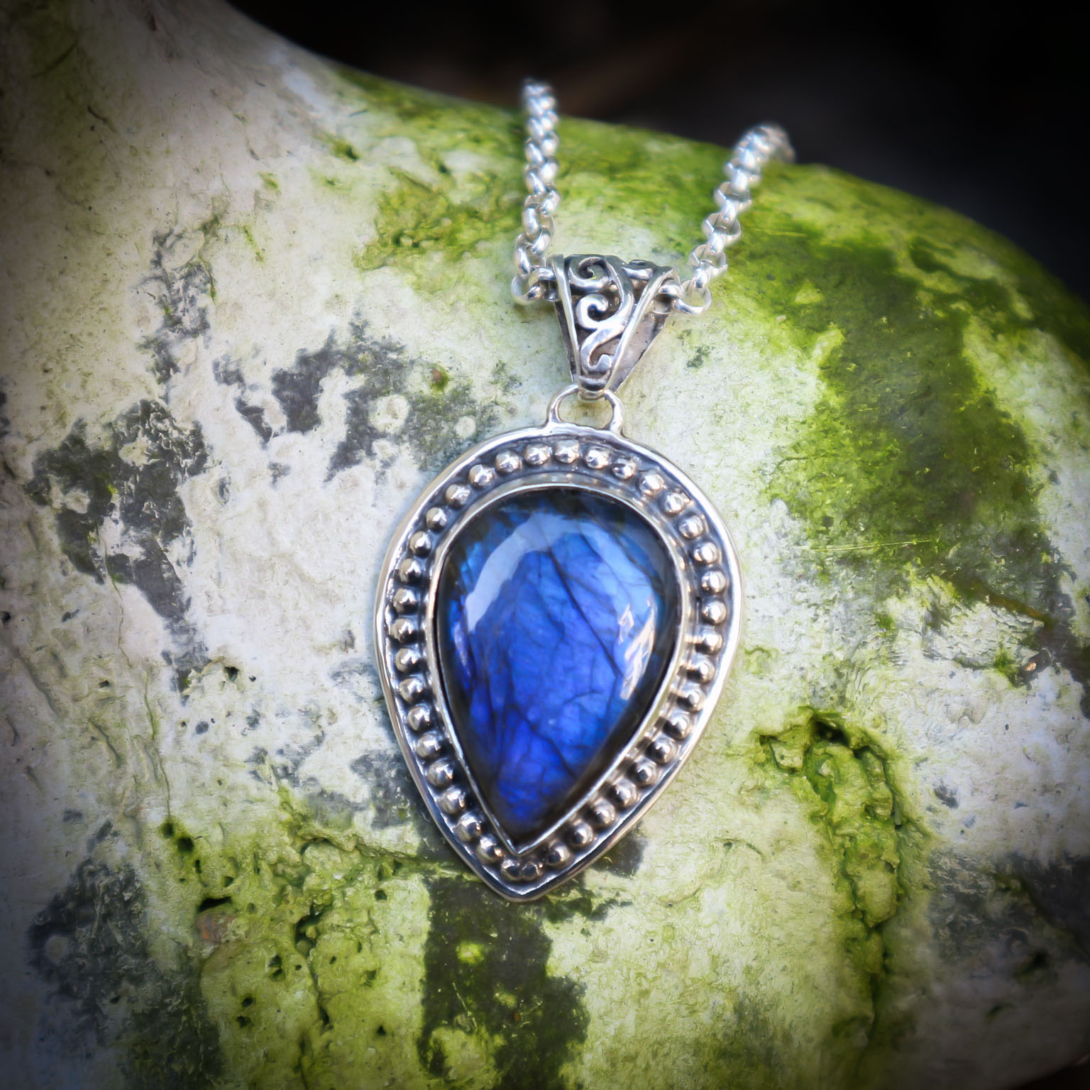 In het midden schittert een grote donkerblauwe labradoriet in druppelvorm, de steen heeft een prachtige blauwe kleur die wisselt met de lichtinval.