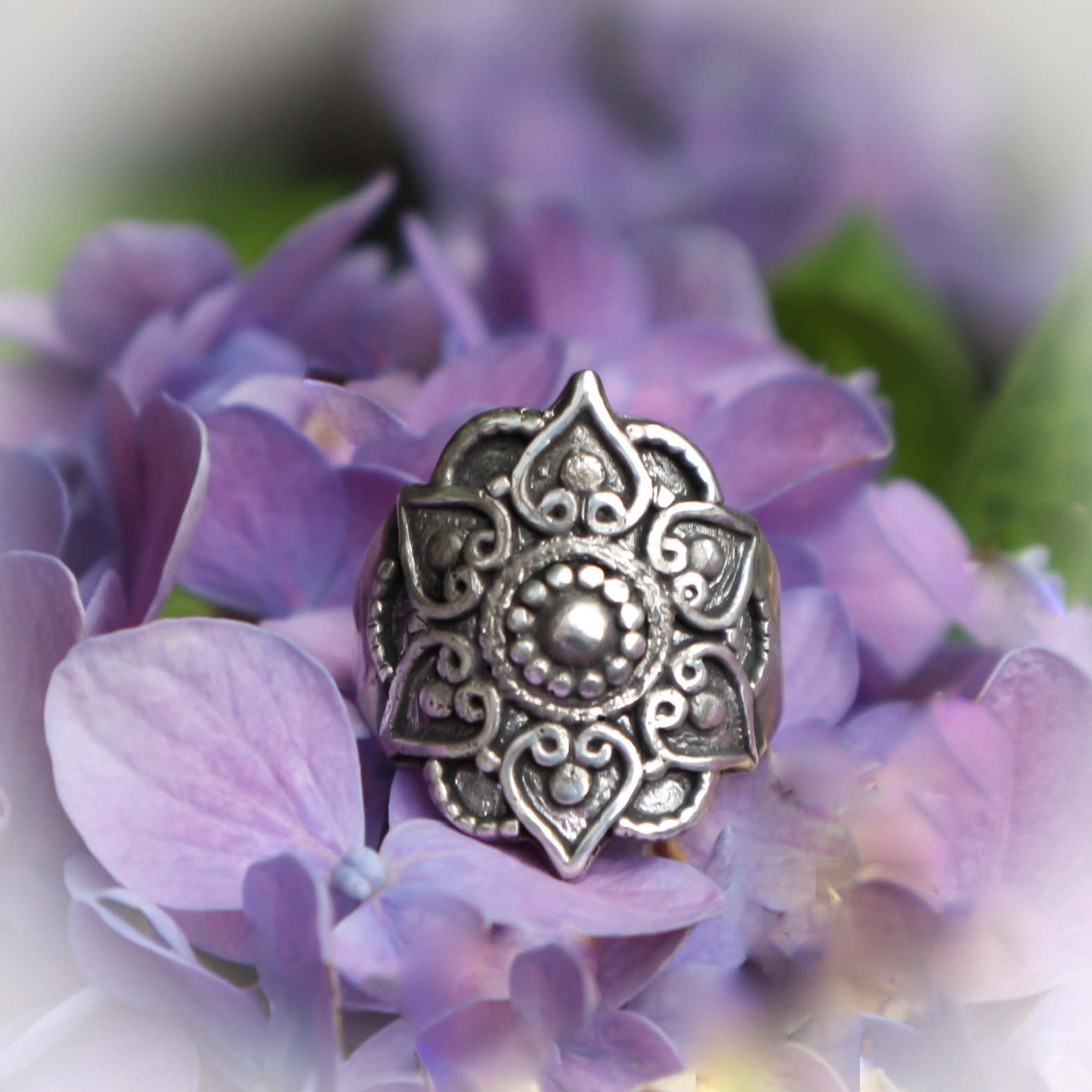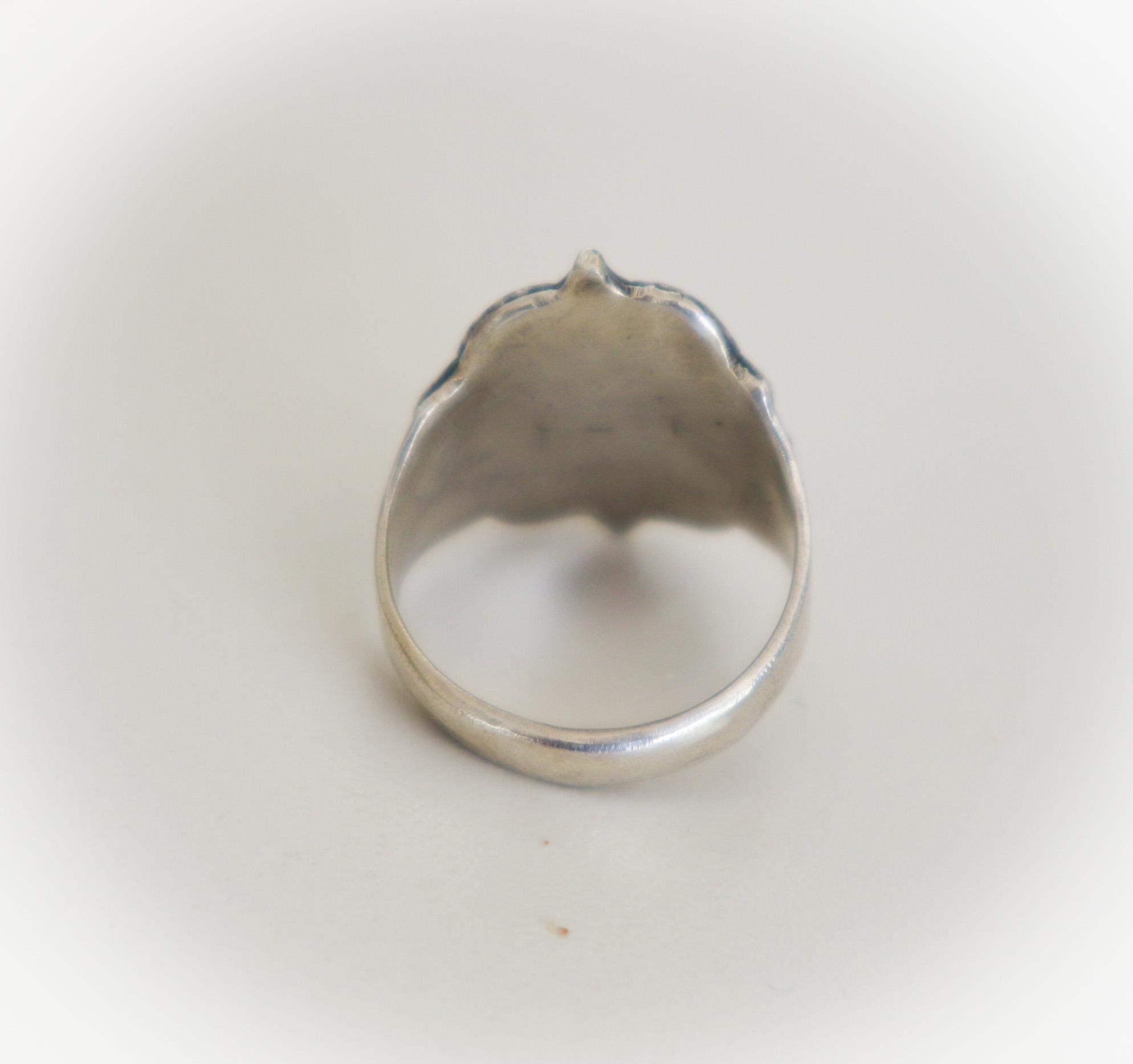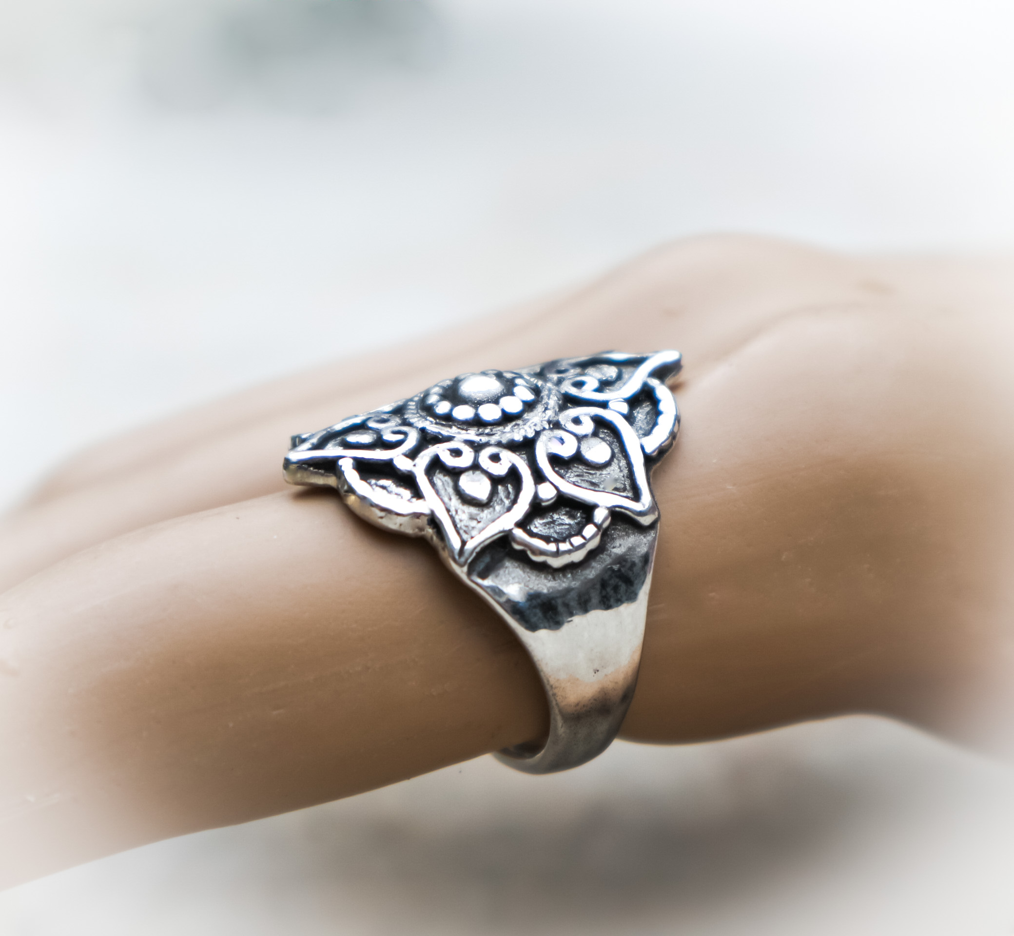 De dieper gelegen delen in de ring zijn donker gepatineerd, waardoor het ontwerp duidelijker en mooier uitkomt .