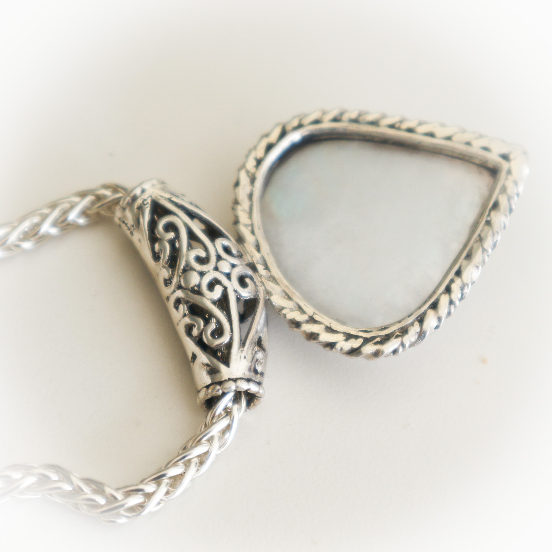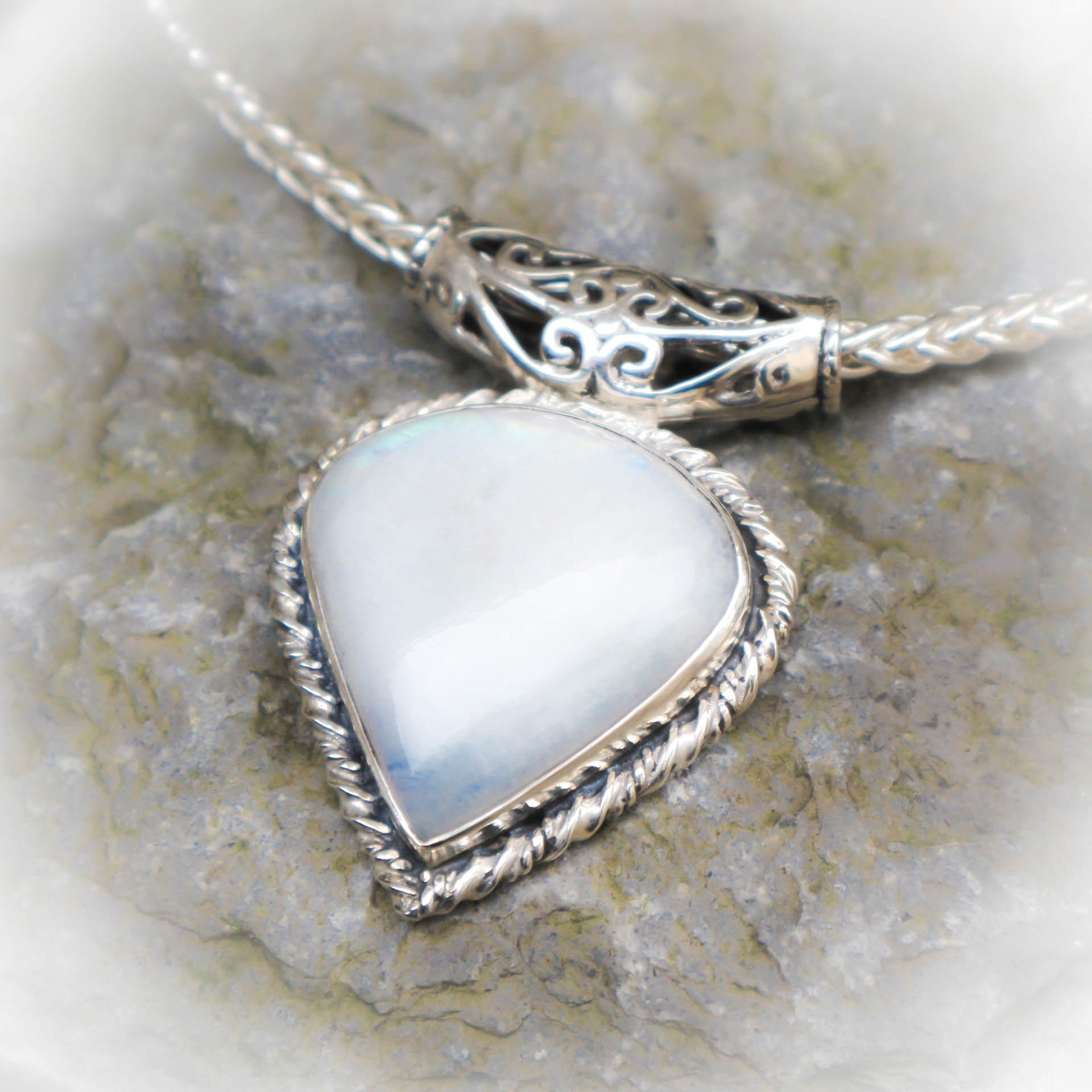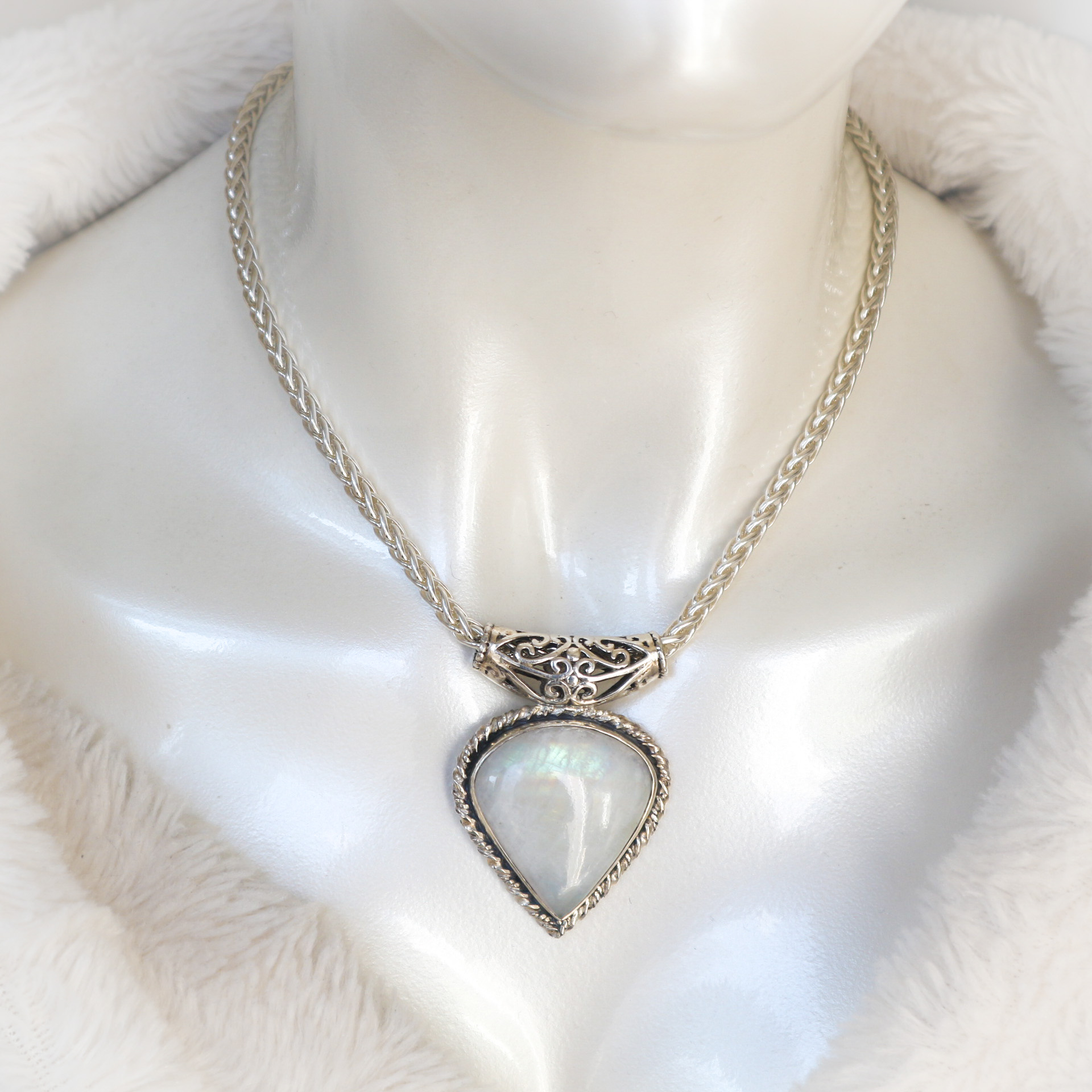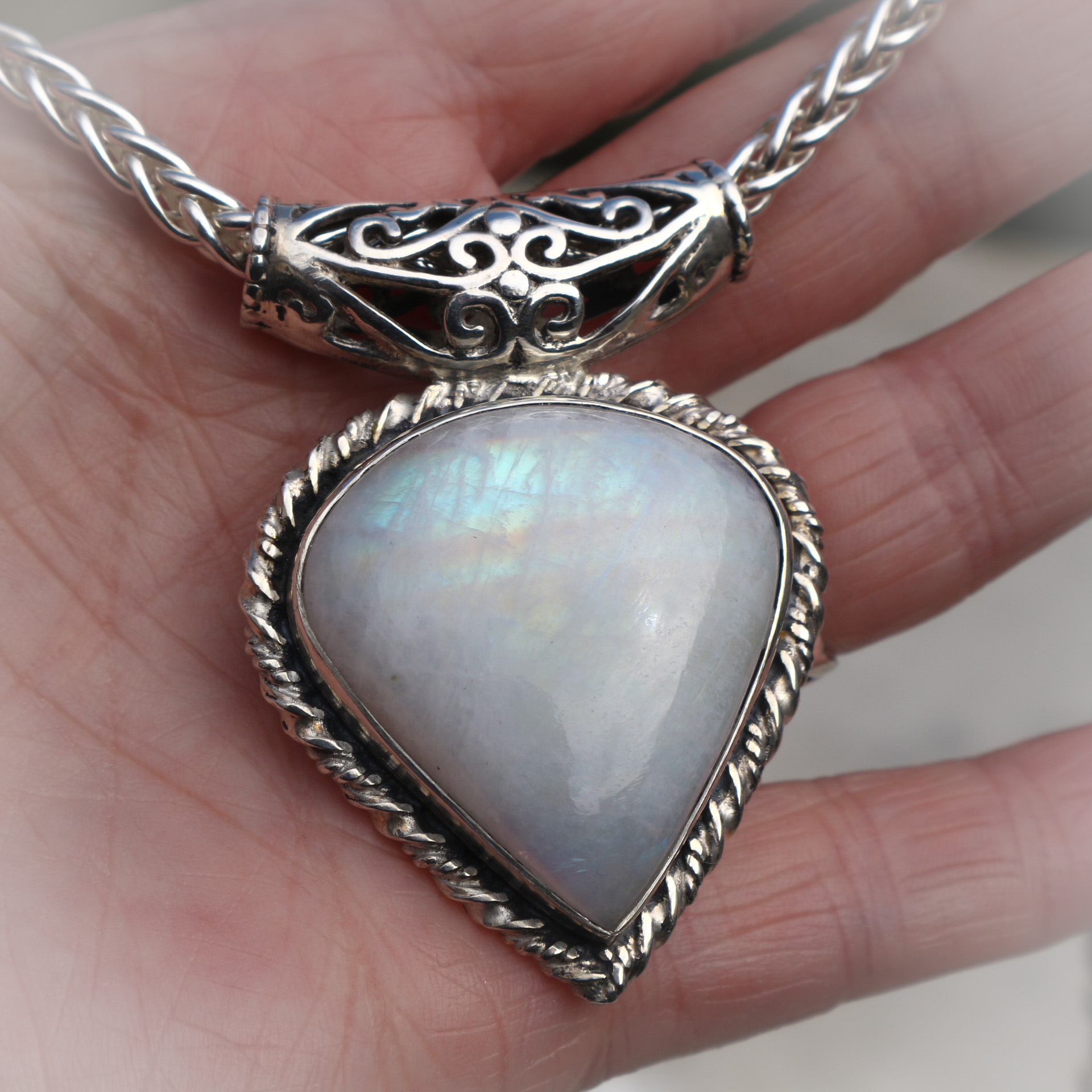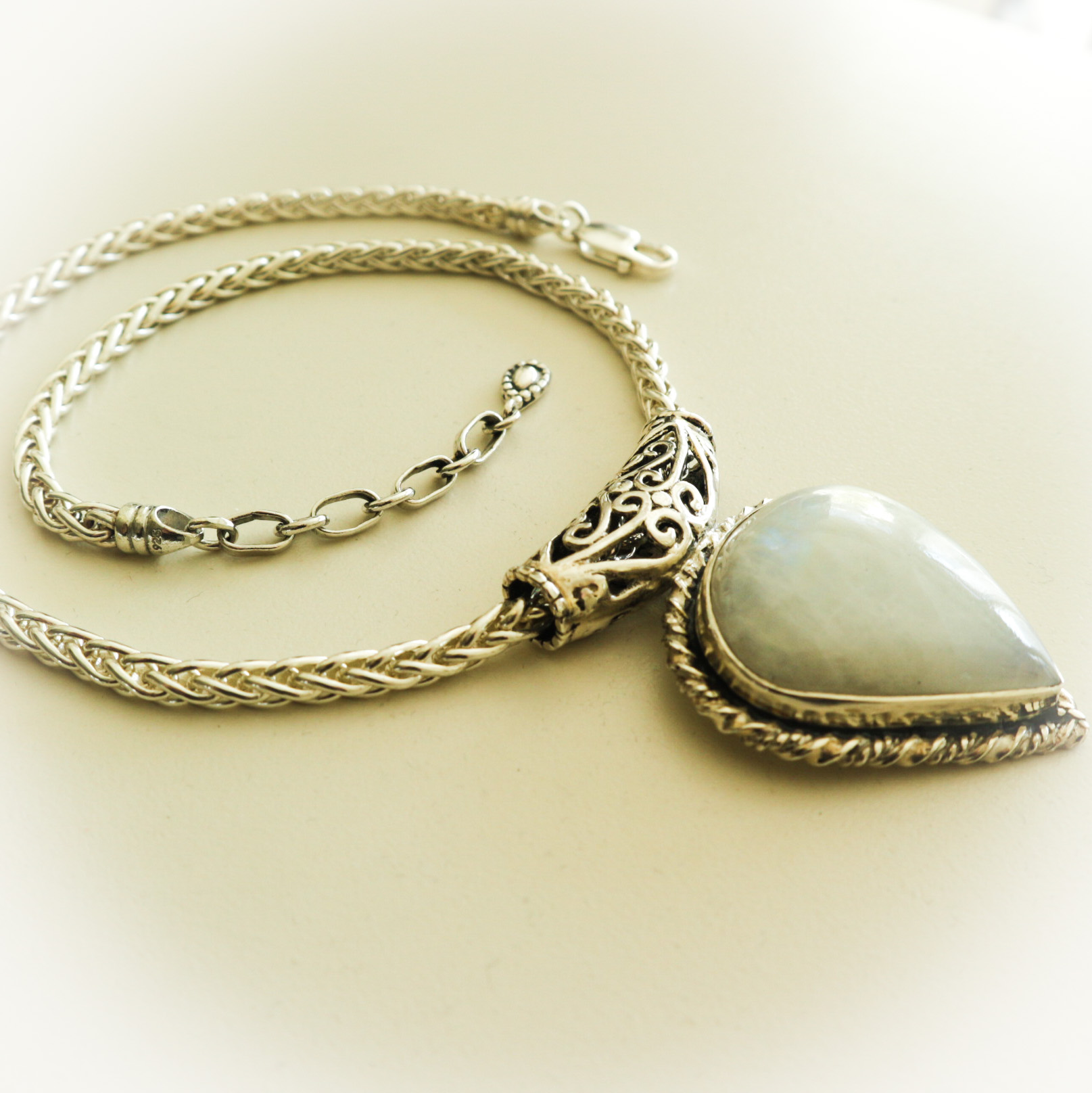 Een hele grote regenboogmaansteen, geslepen in een druppelvorm vormt het middelpunt van deze prachtige halsketting .