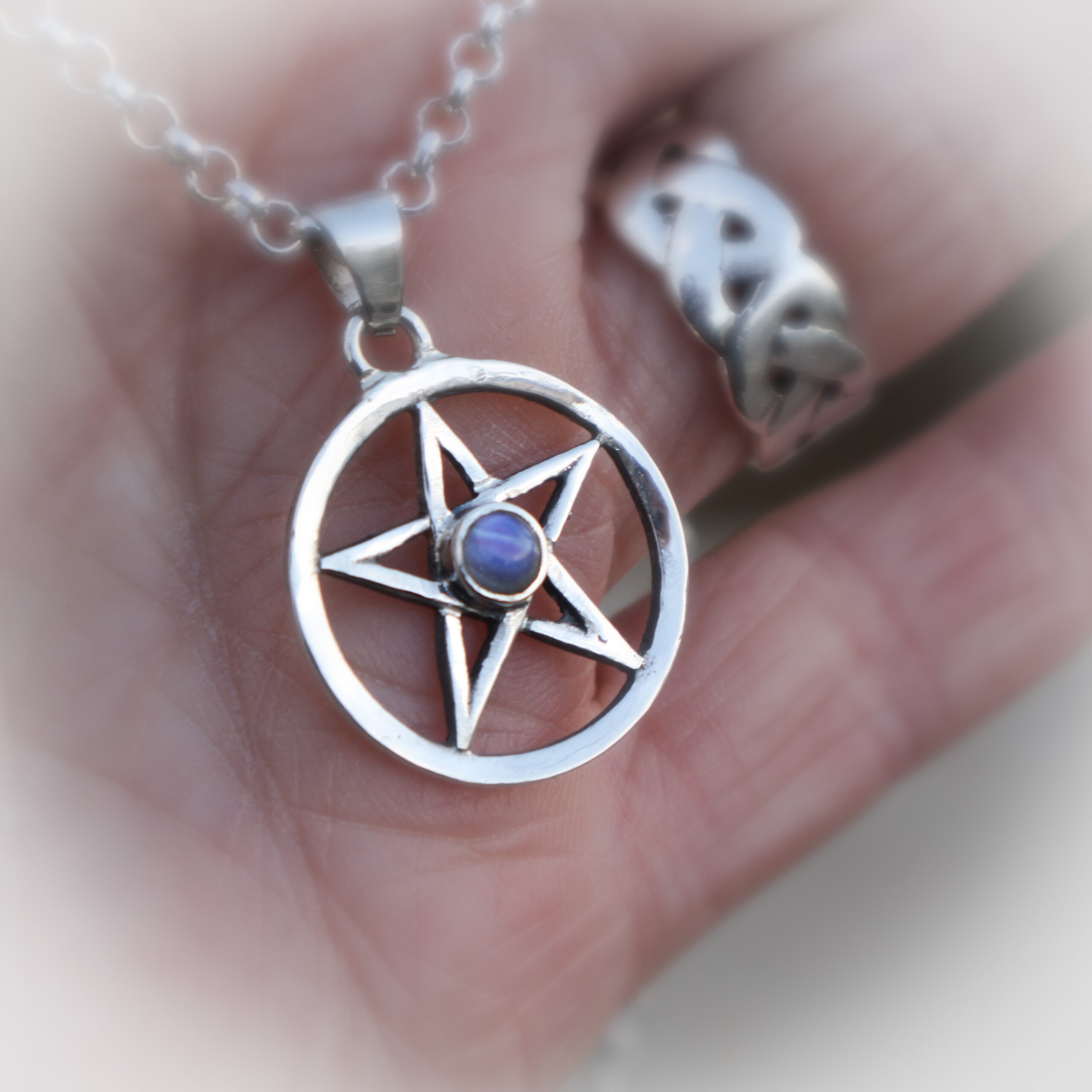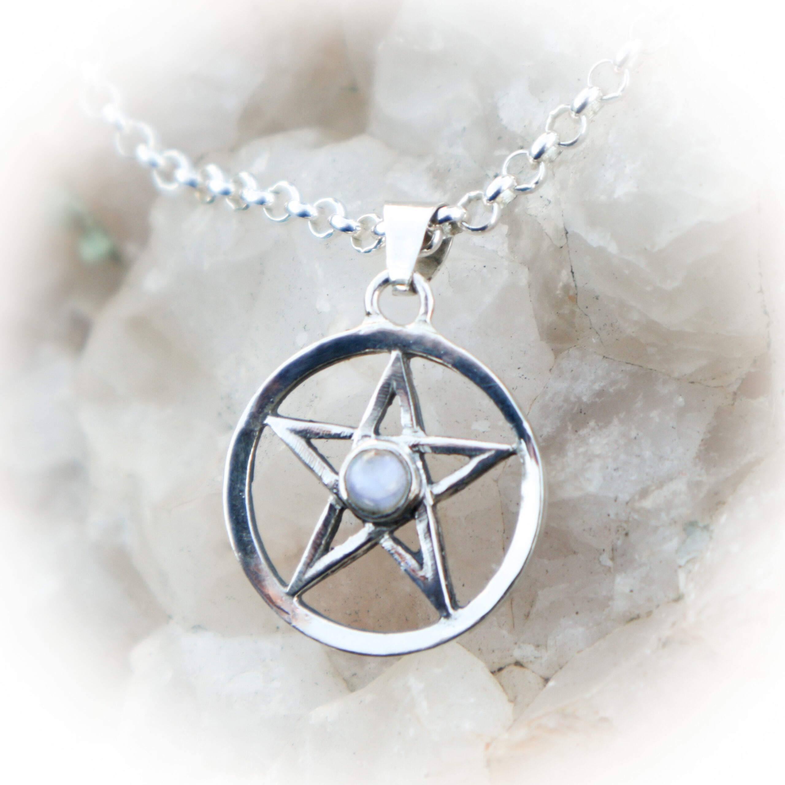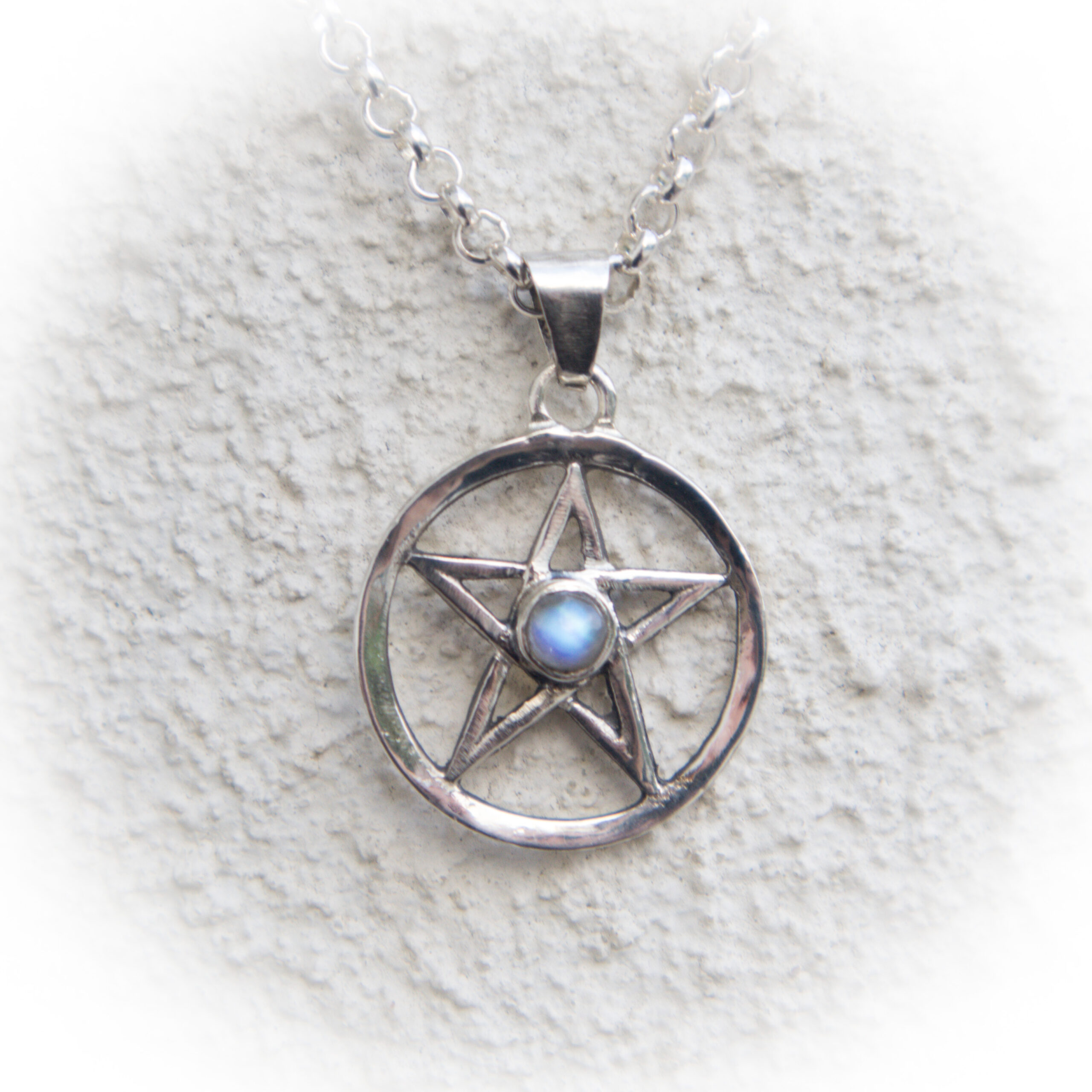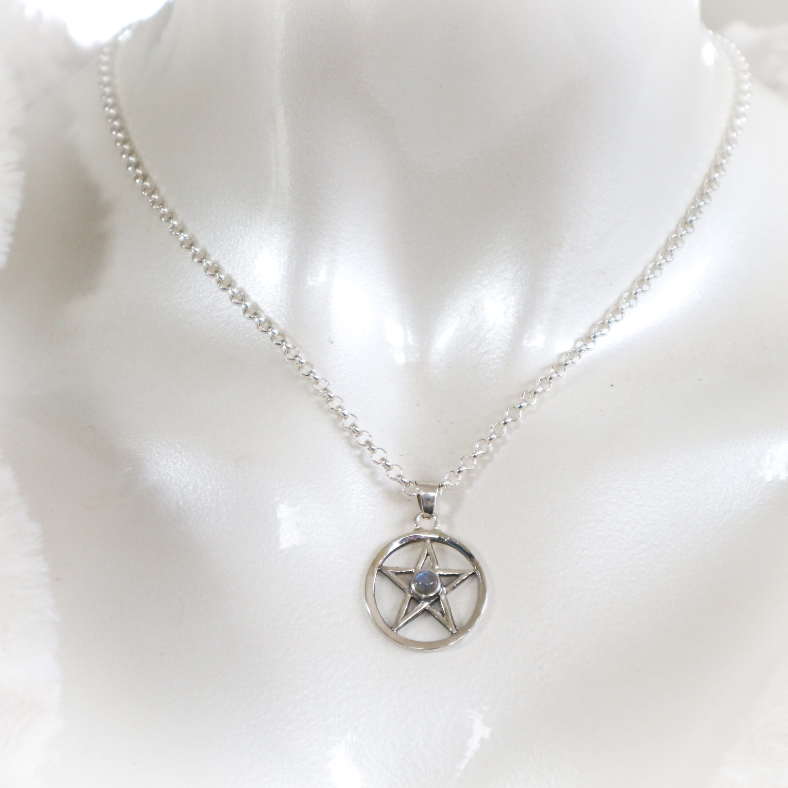 Een pentagram hanger in sterling zilver met als middelpunt een maansteen .