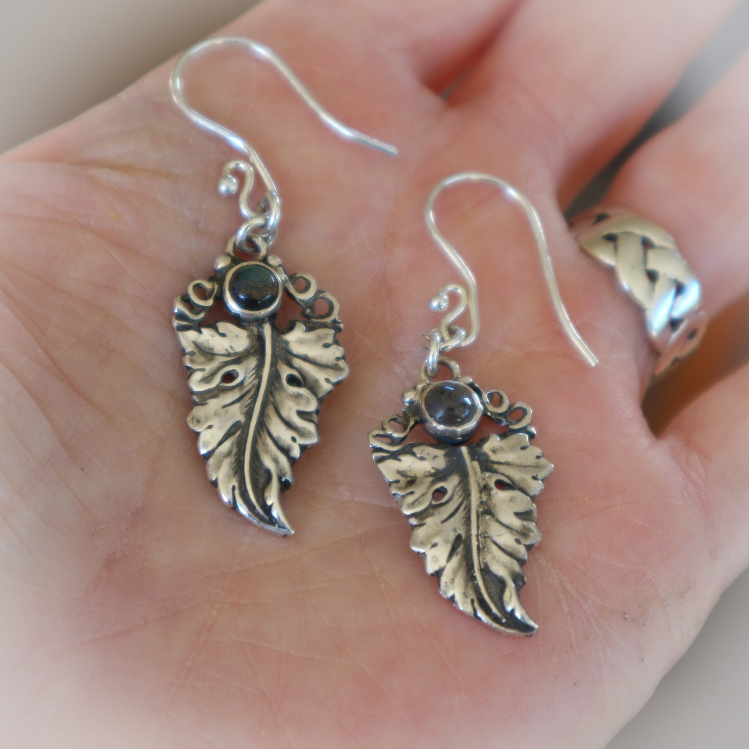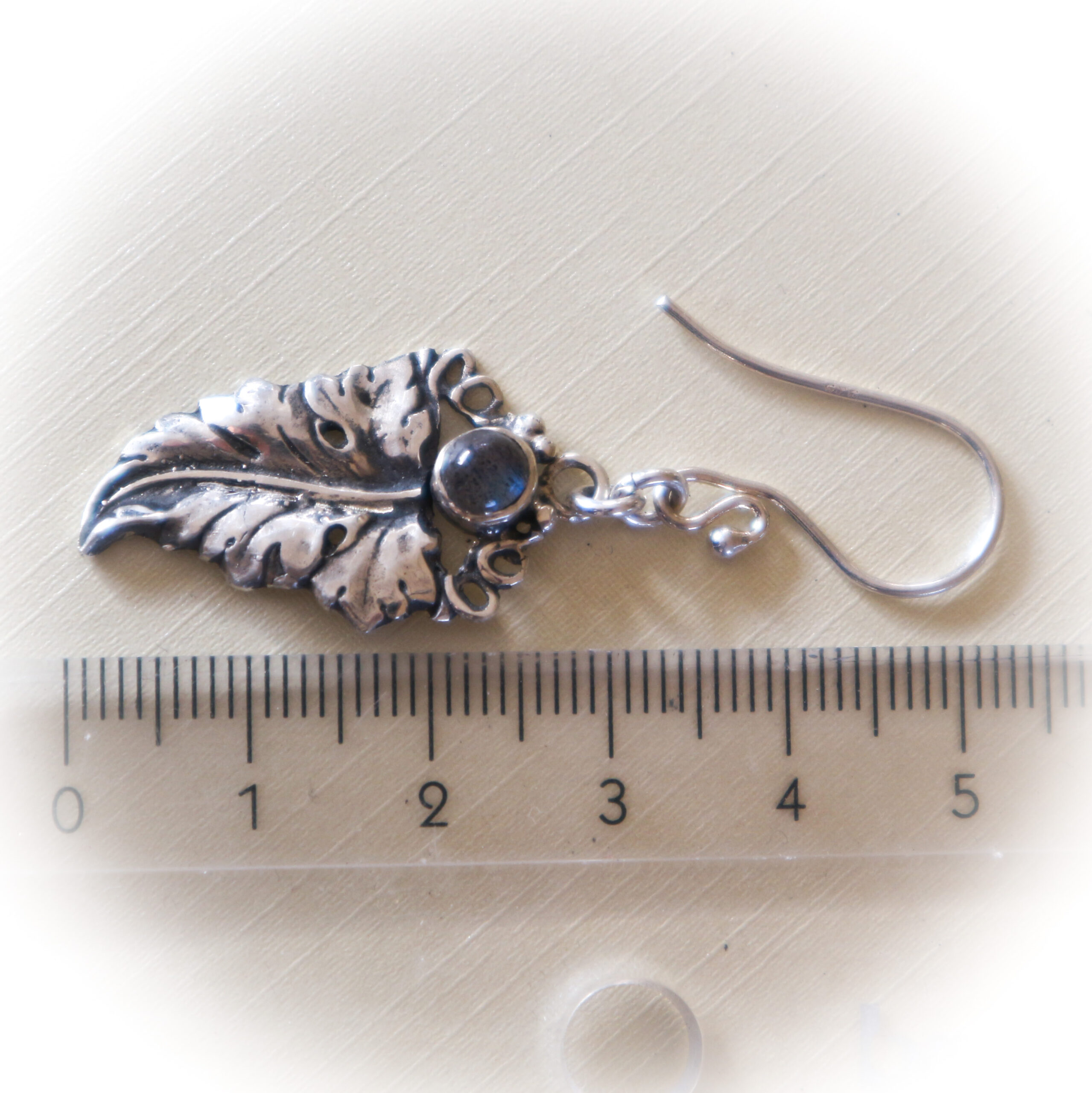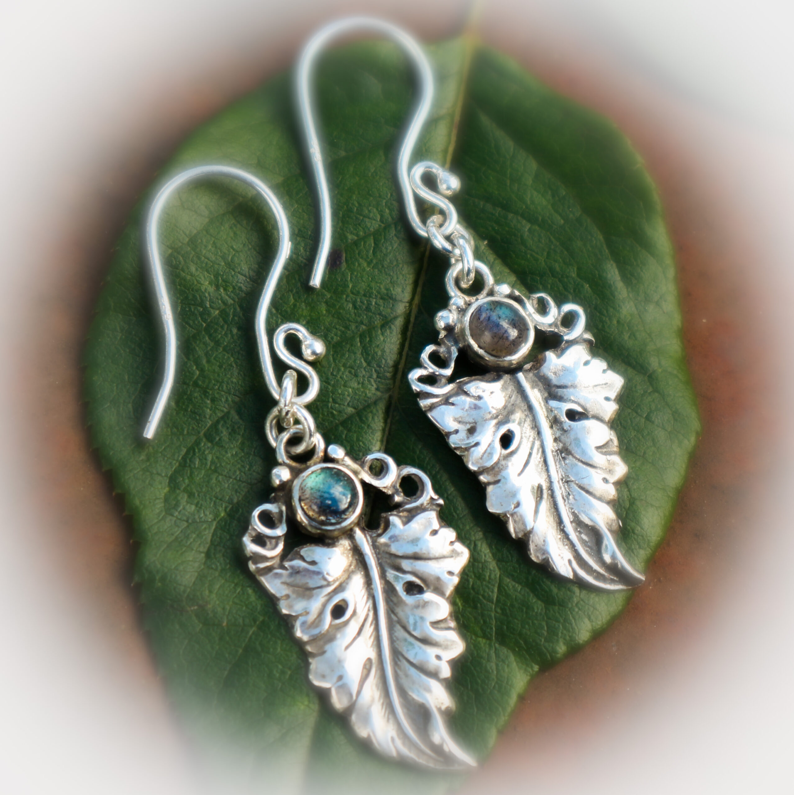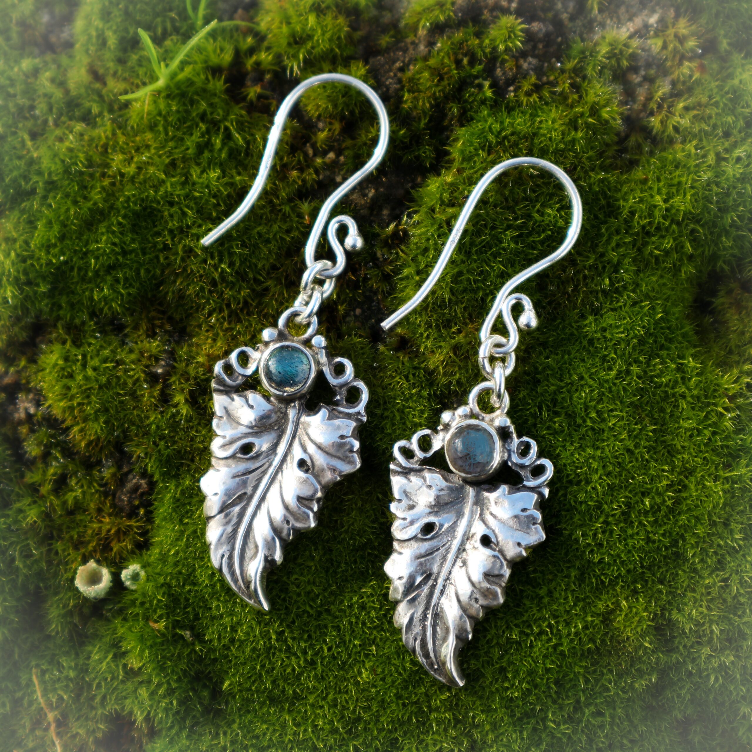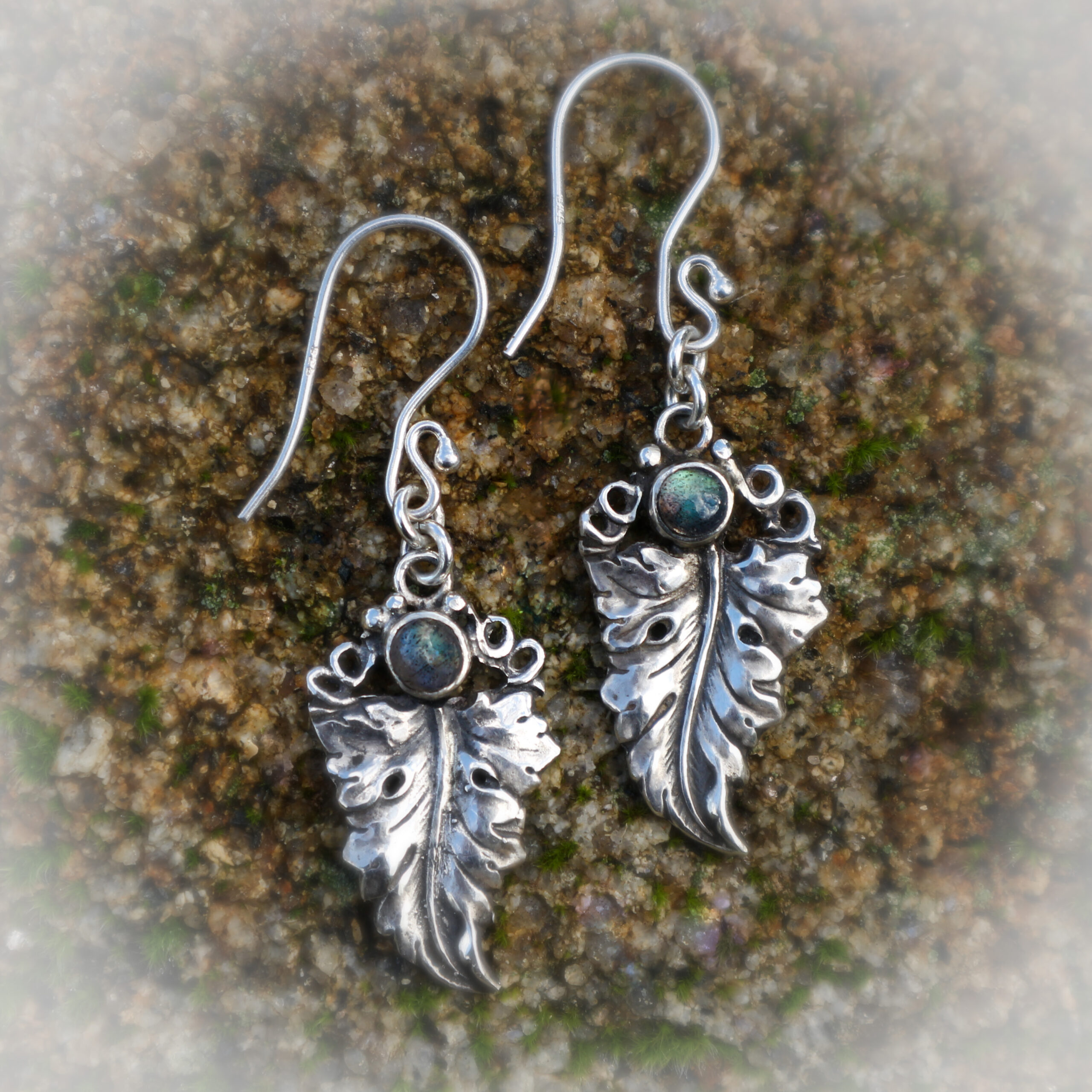 De prachtig gevormde bladeren hebben een labradoriet edelsteentje als blikvanger .