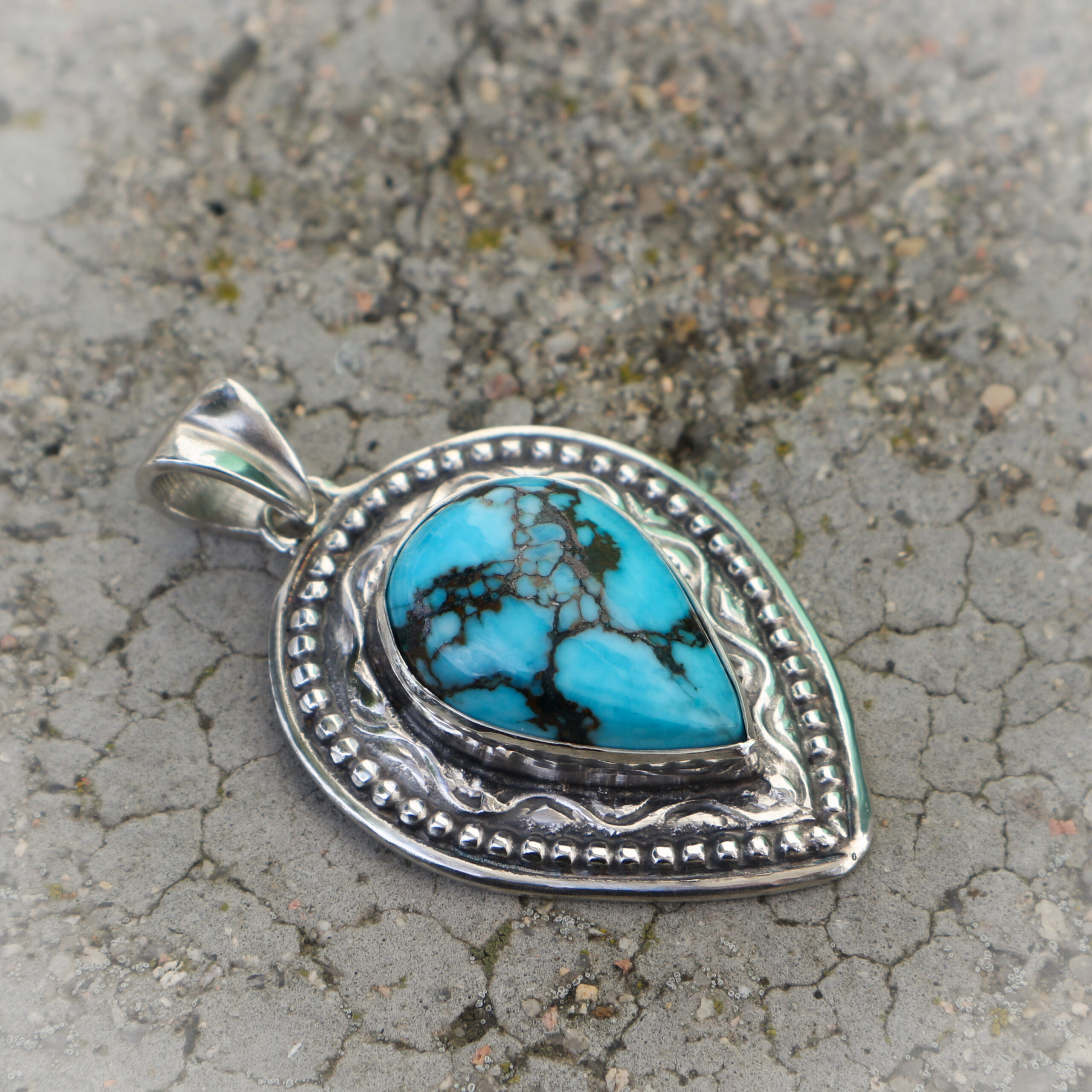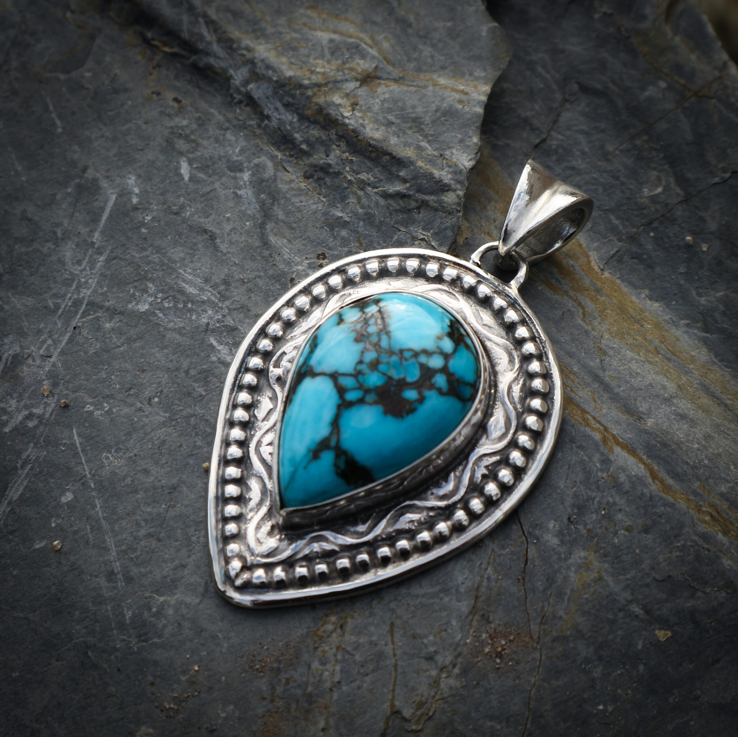 Deze turkoois heeft een mooie, hemelsblauwe kleur, met zwarte aders. Dit heet ook wel een spinnenweb-patroon. Die donkere aders gelden als bewijs van de echtheid van turkoois.