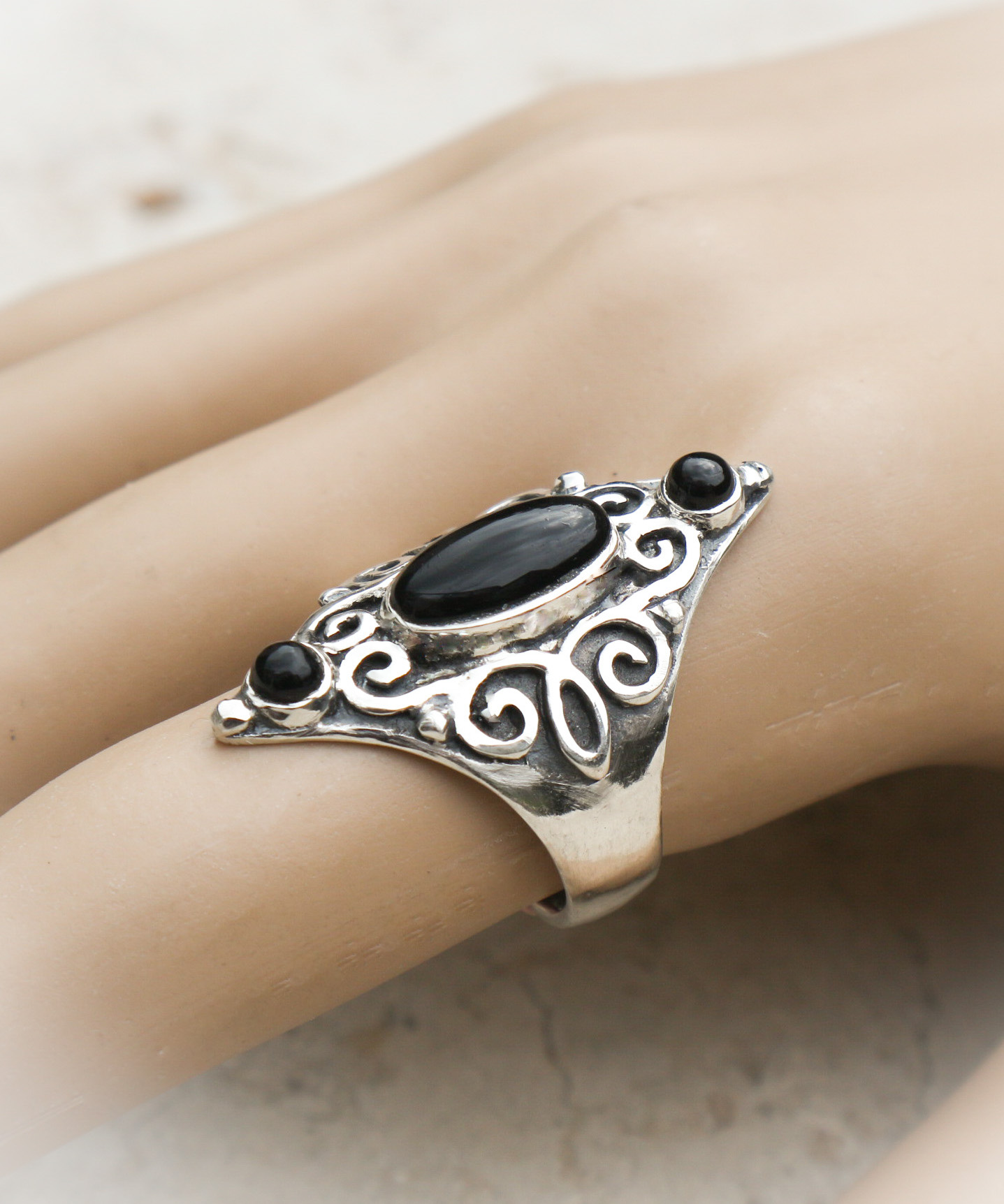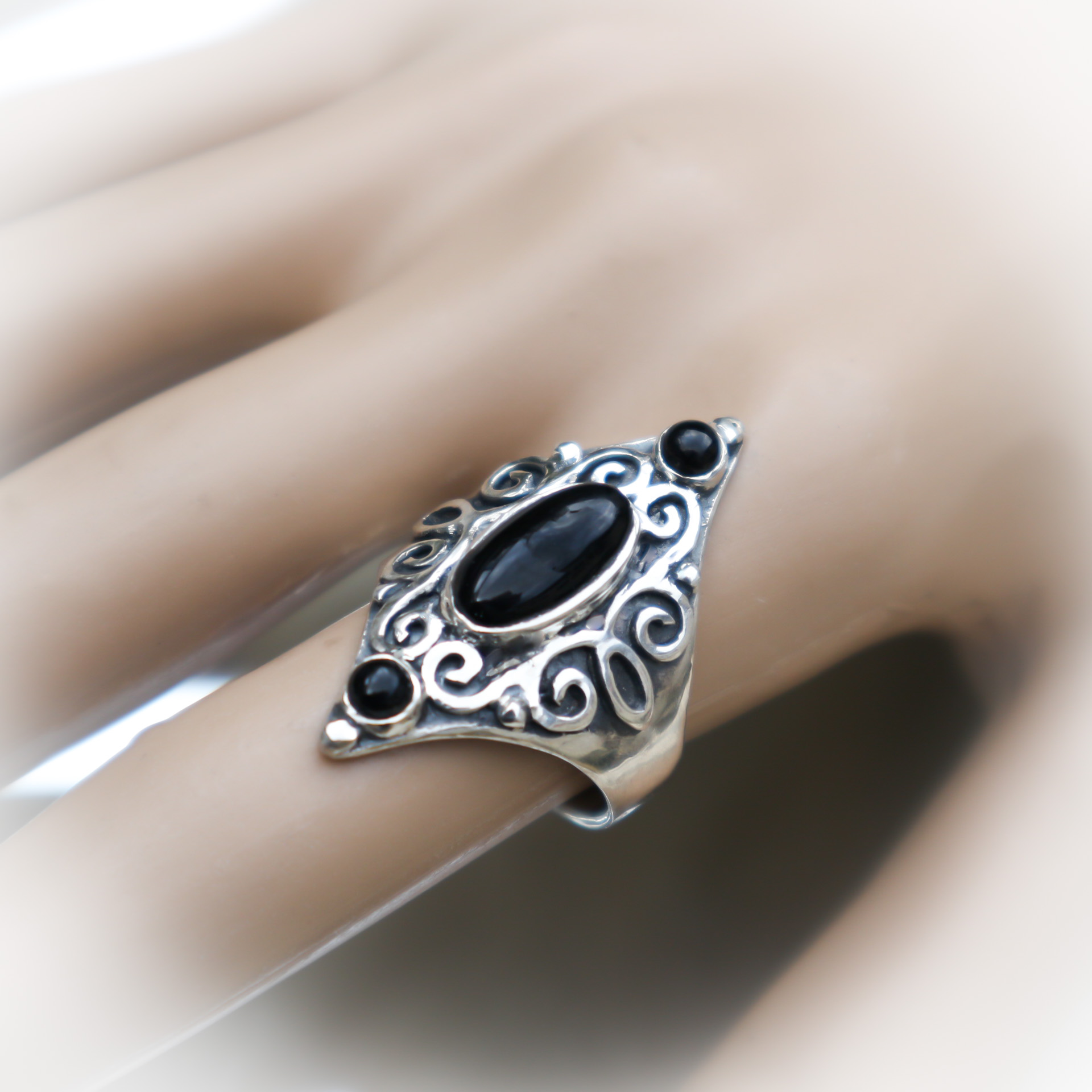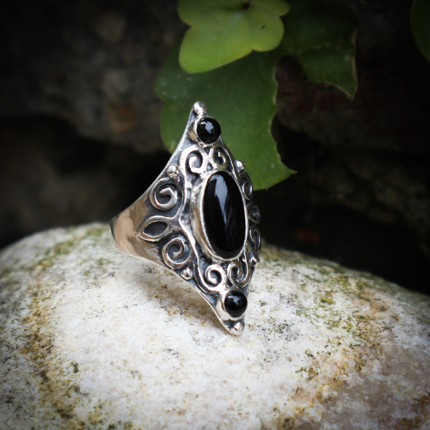 De ring heeft drie zwarte ( onyx ) stenen, formaat van de middelste steen is 6×11 mm .