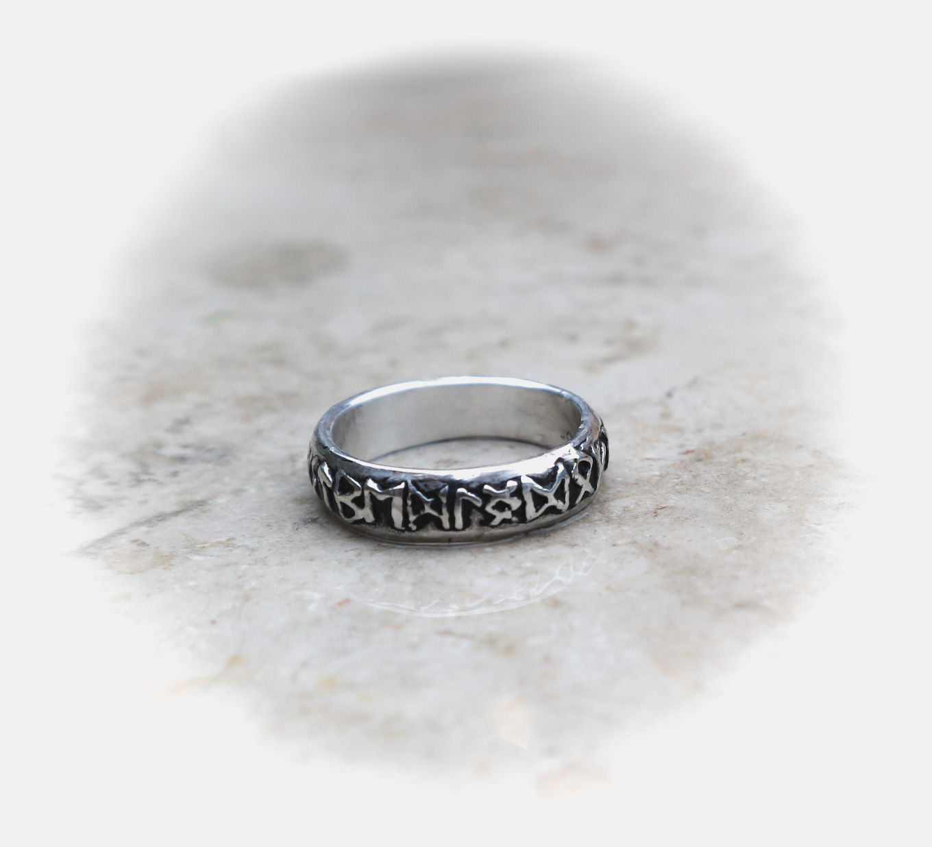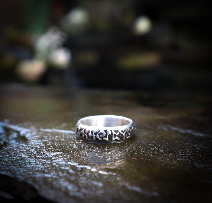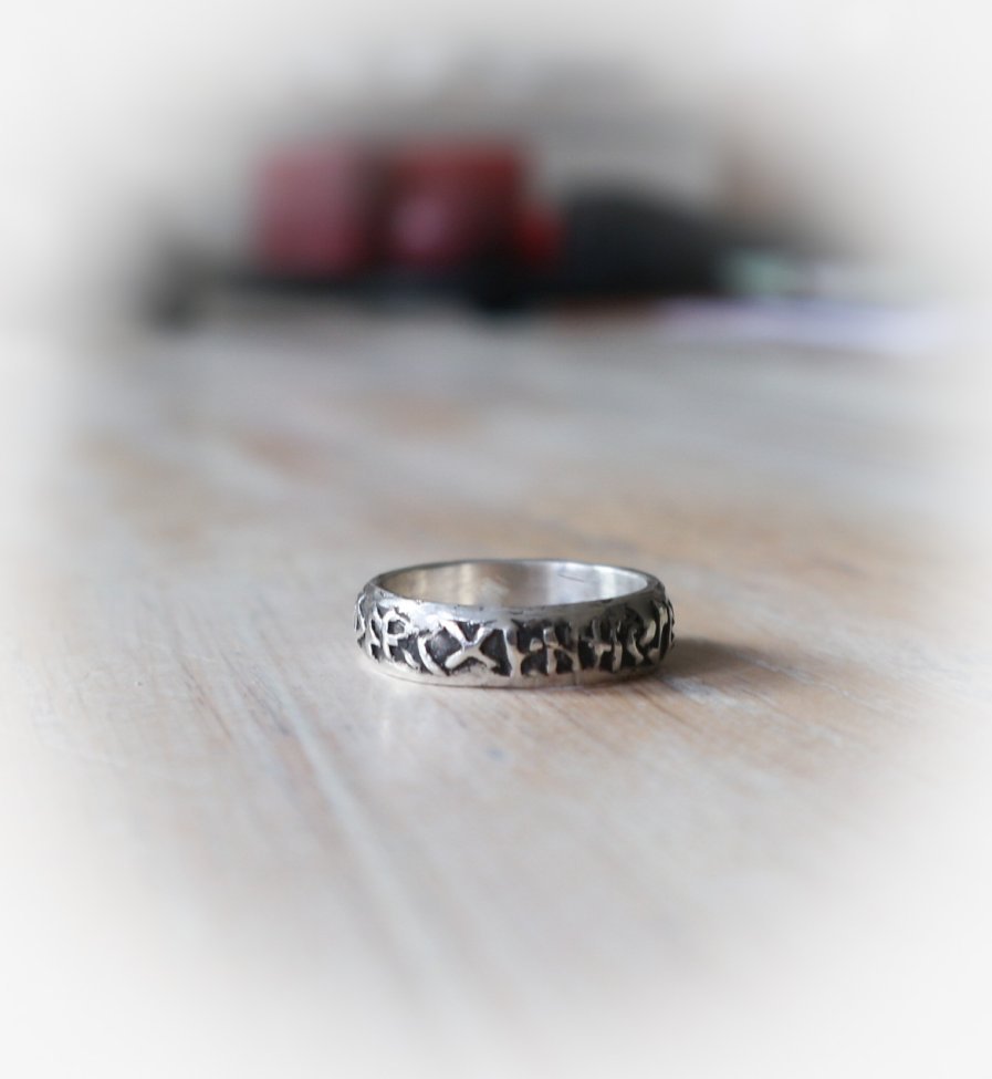 Een handgemaakte, zilveren (925-sterling) ring met het runenalfabet, oftewel Futhark