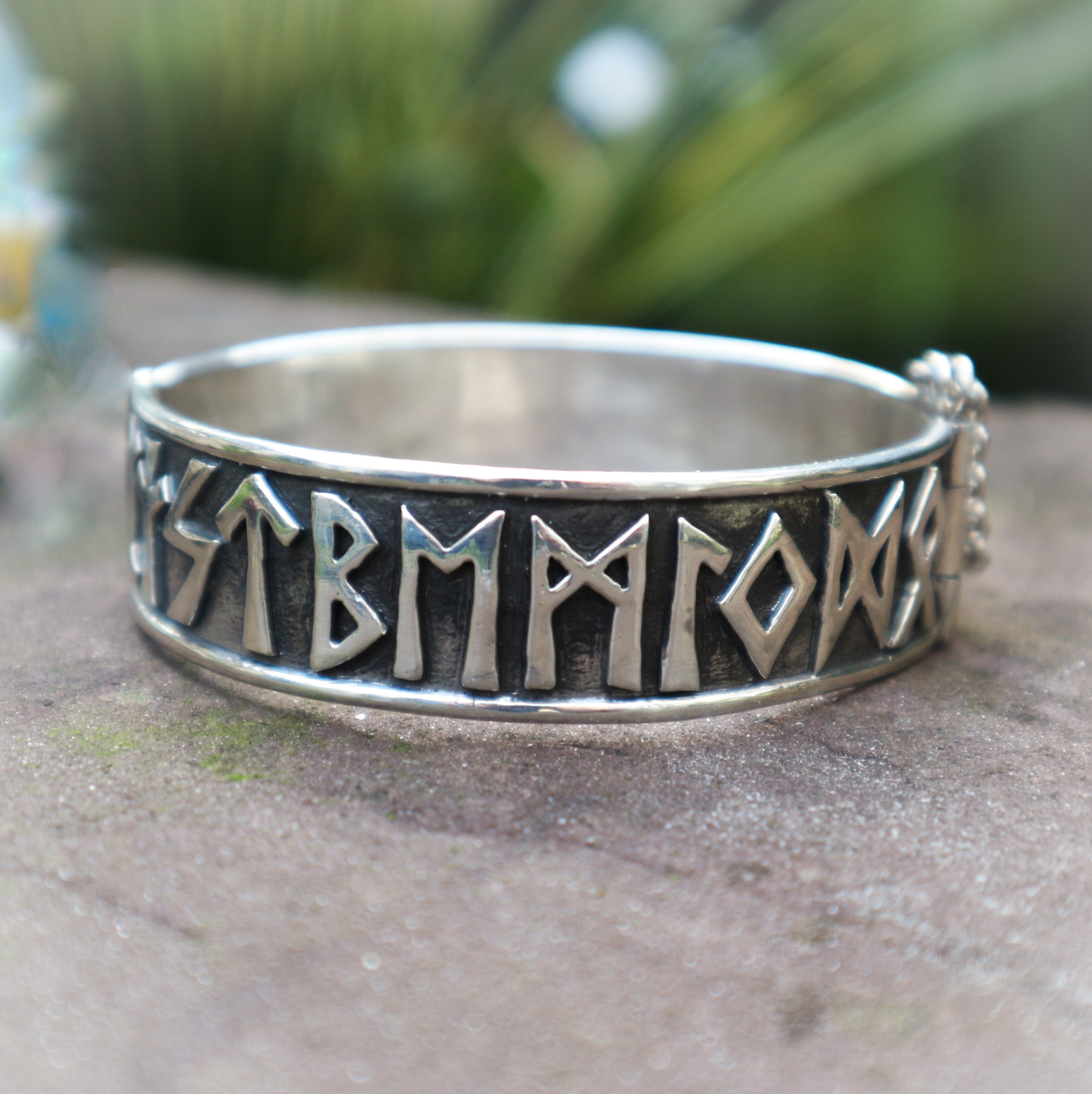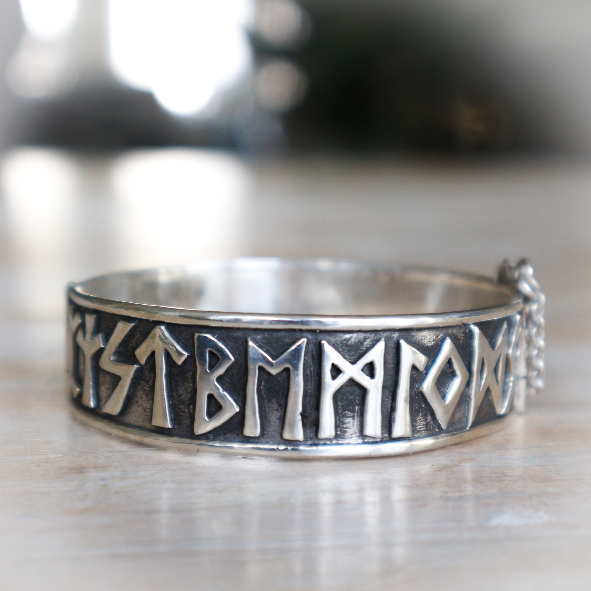 Een handgemaakte, zilveren (925-sterling) armband met het runenalfabet, oftewel Futhark