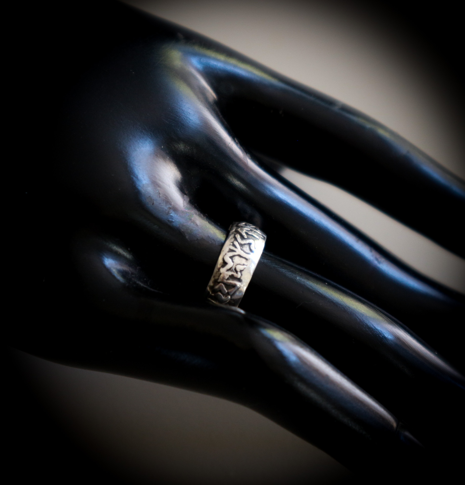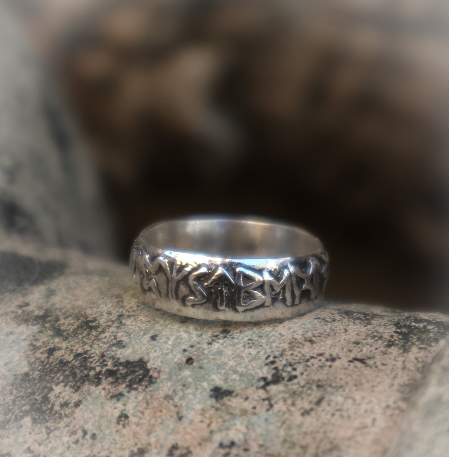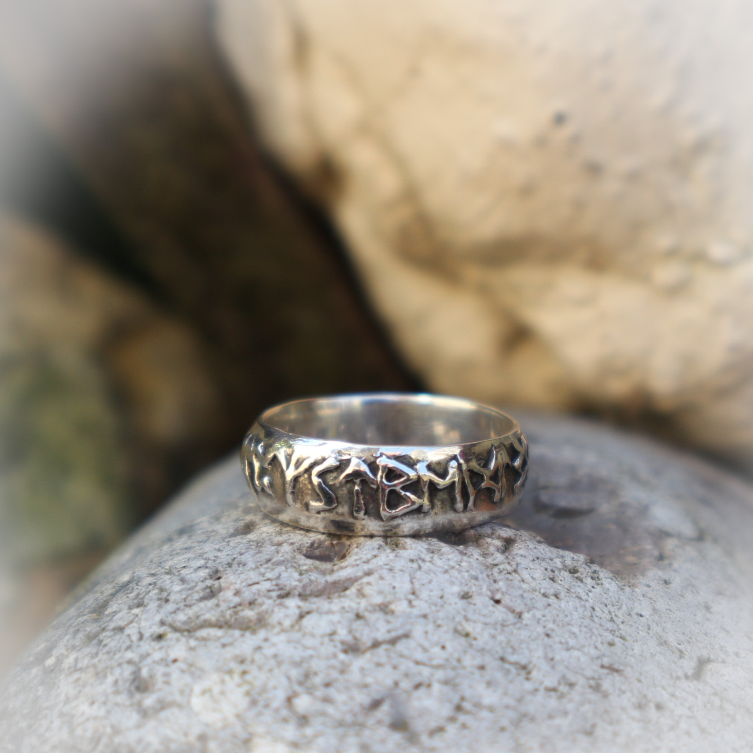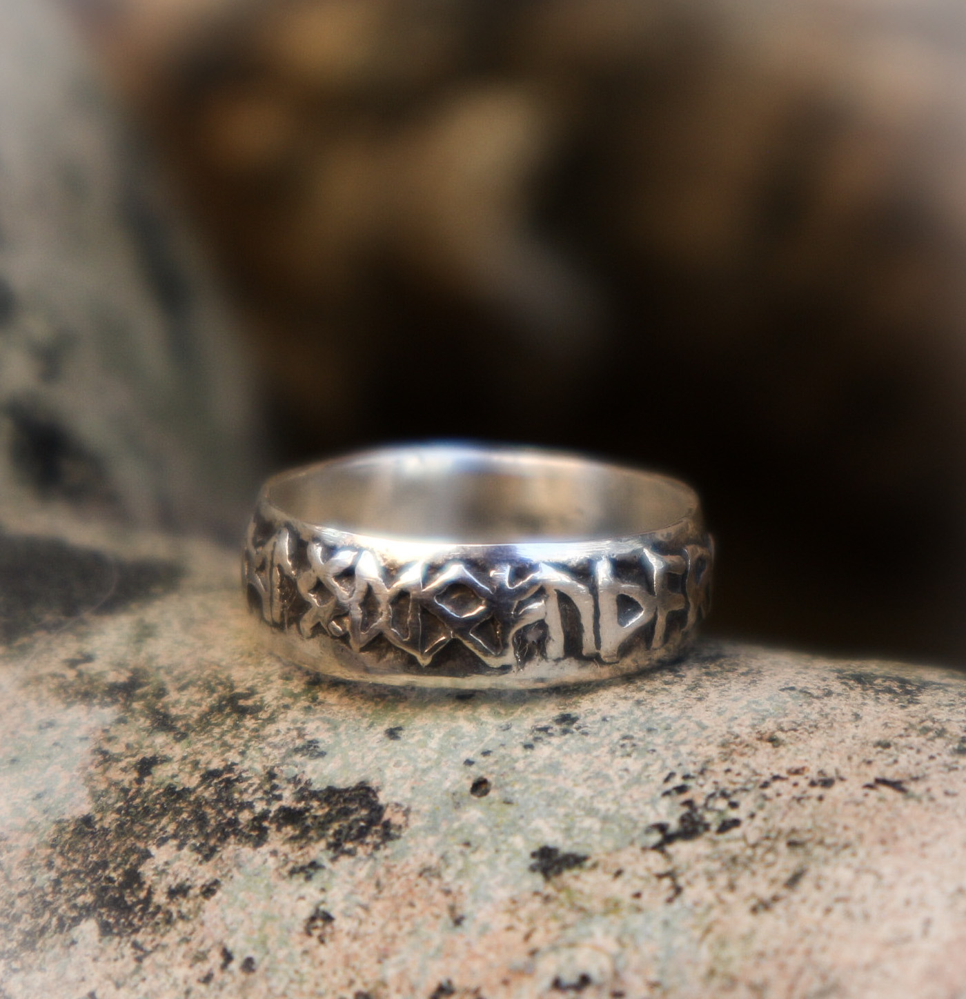 Een handgemaakte, zilveren (925-sterling) ring met het runenalfabet, oftewel Futhark .