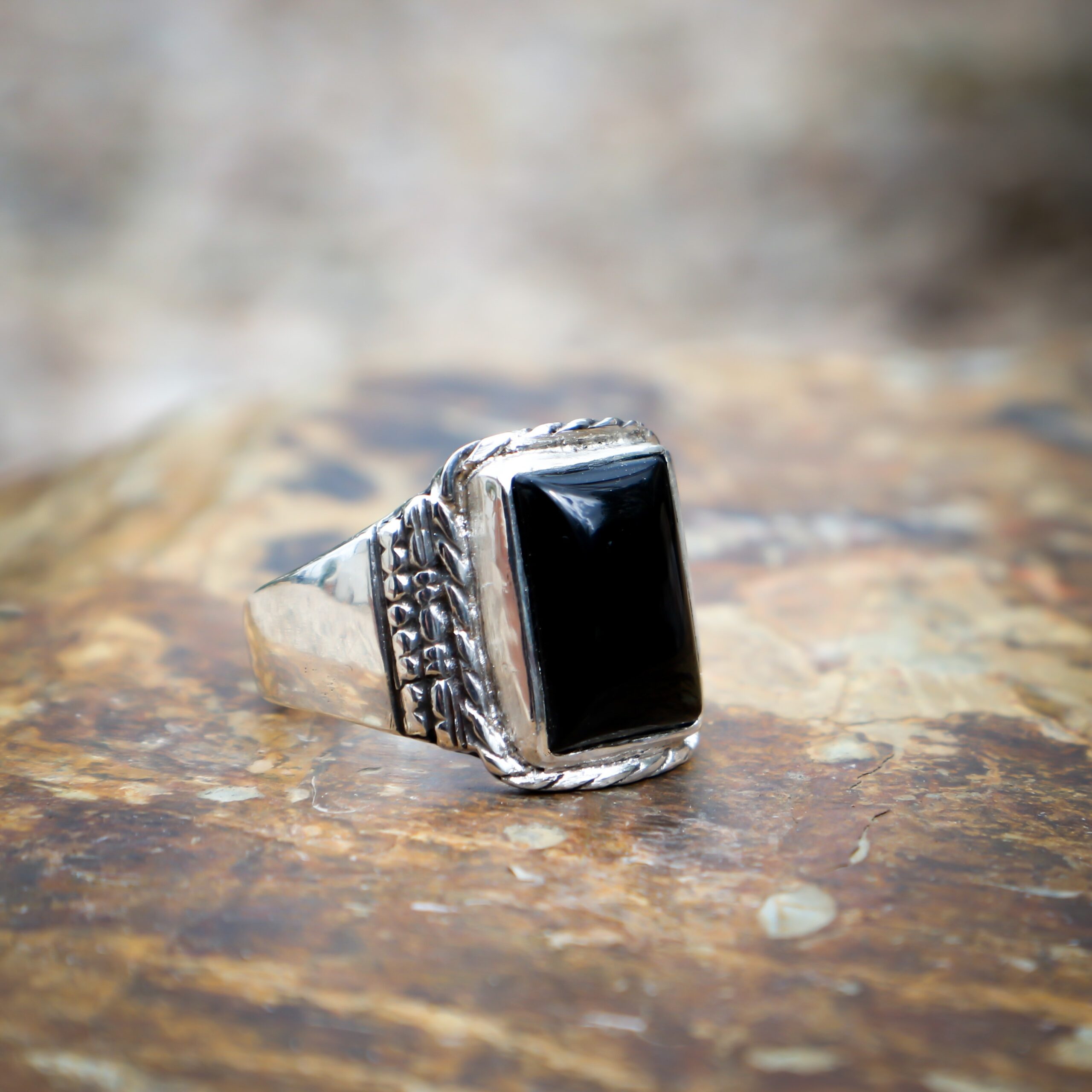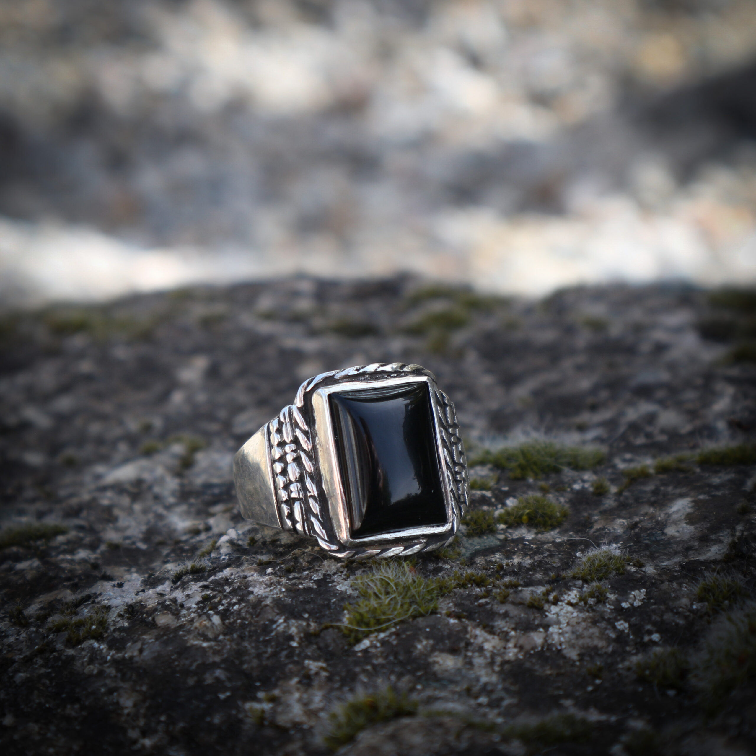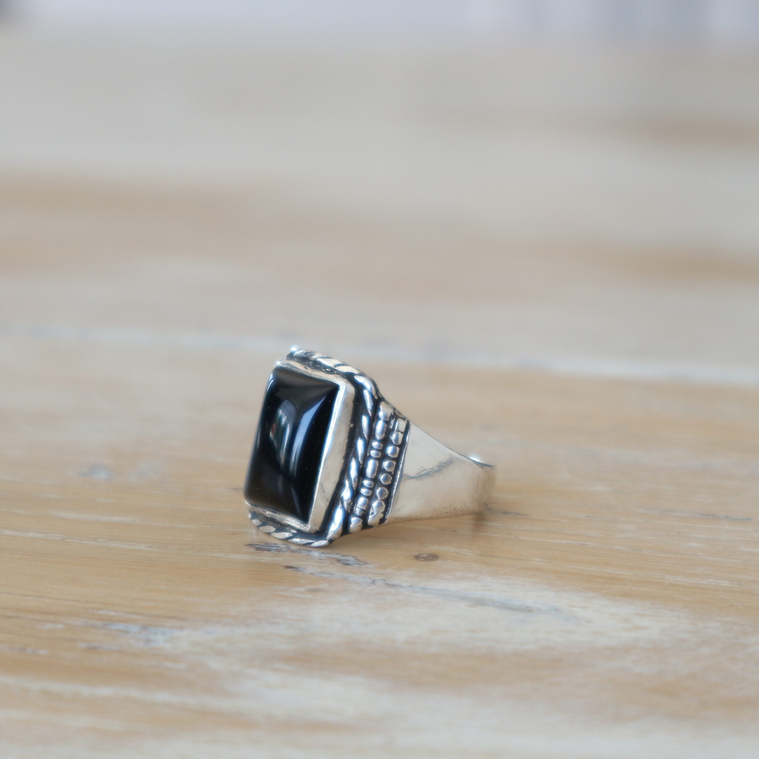 De ring heeft een mooie, rechthoekige zwarte steen, een onyx .