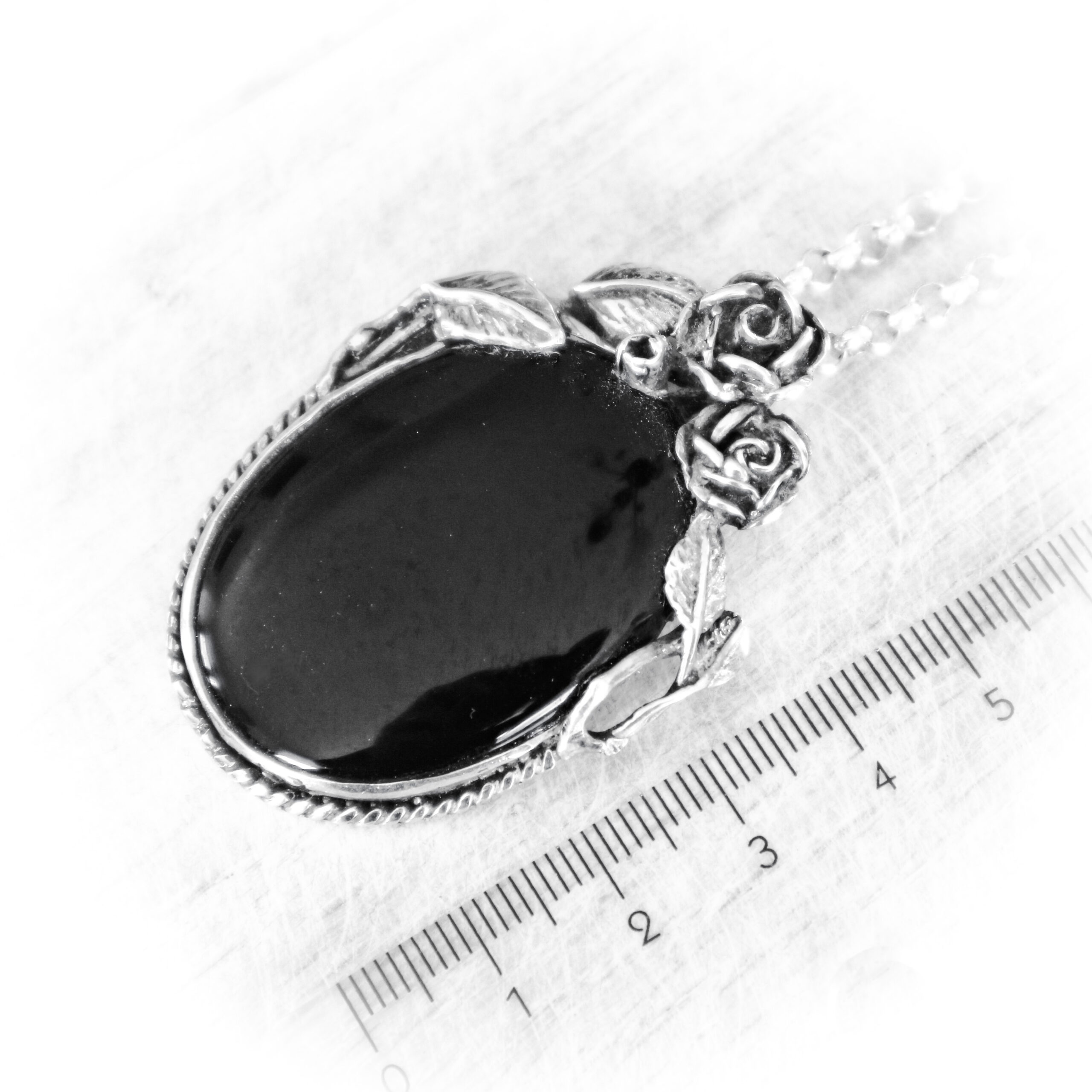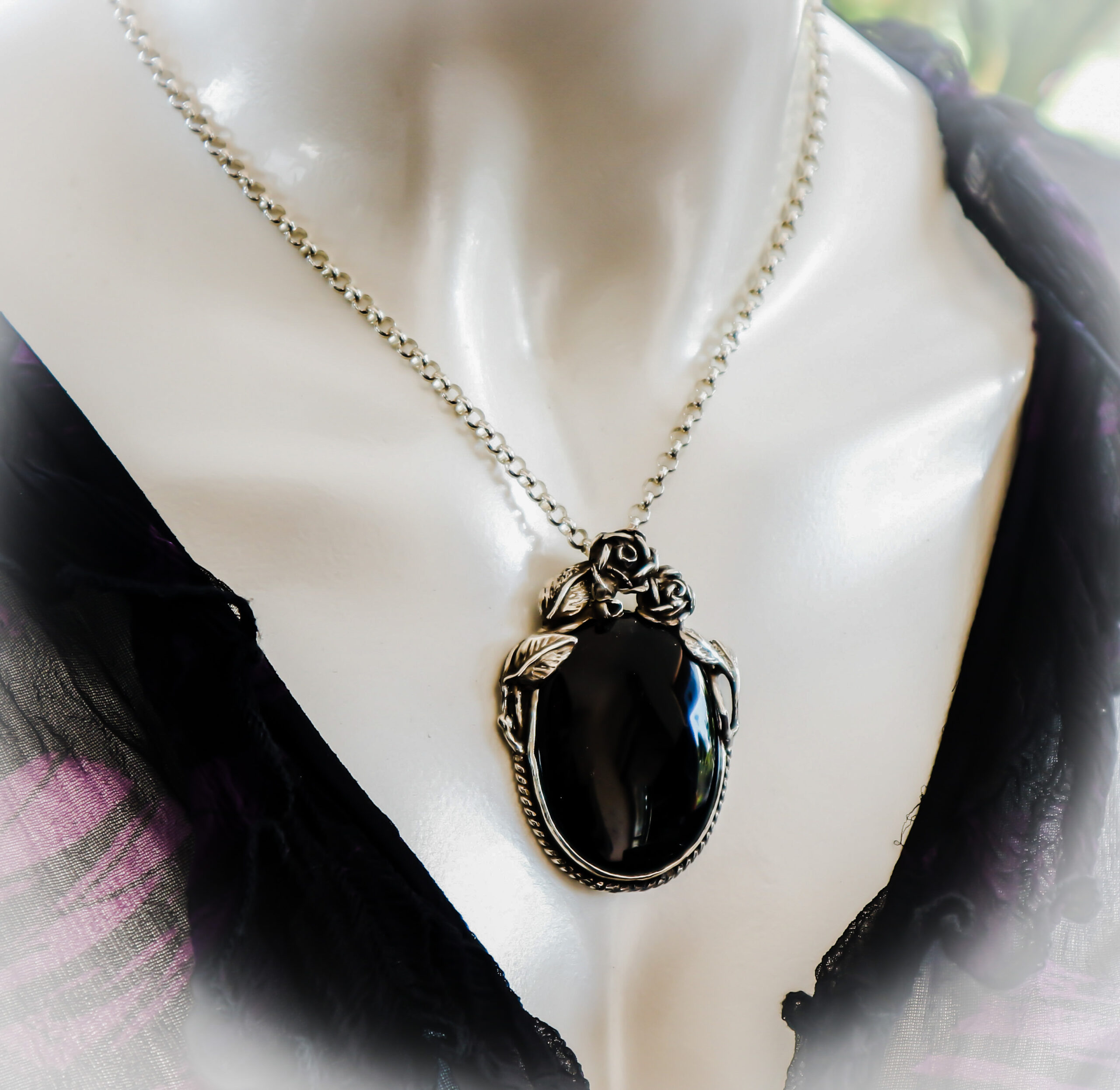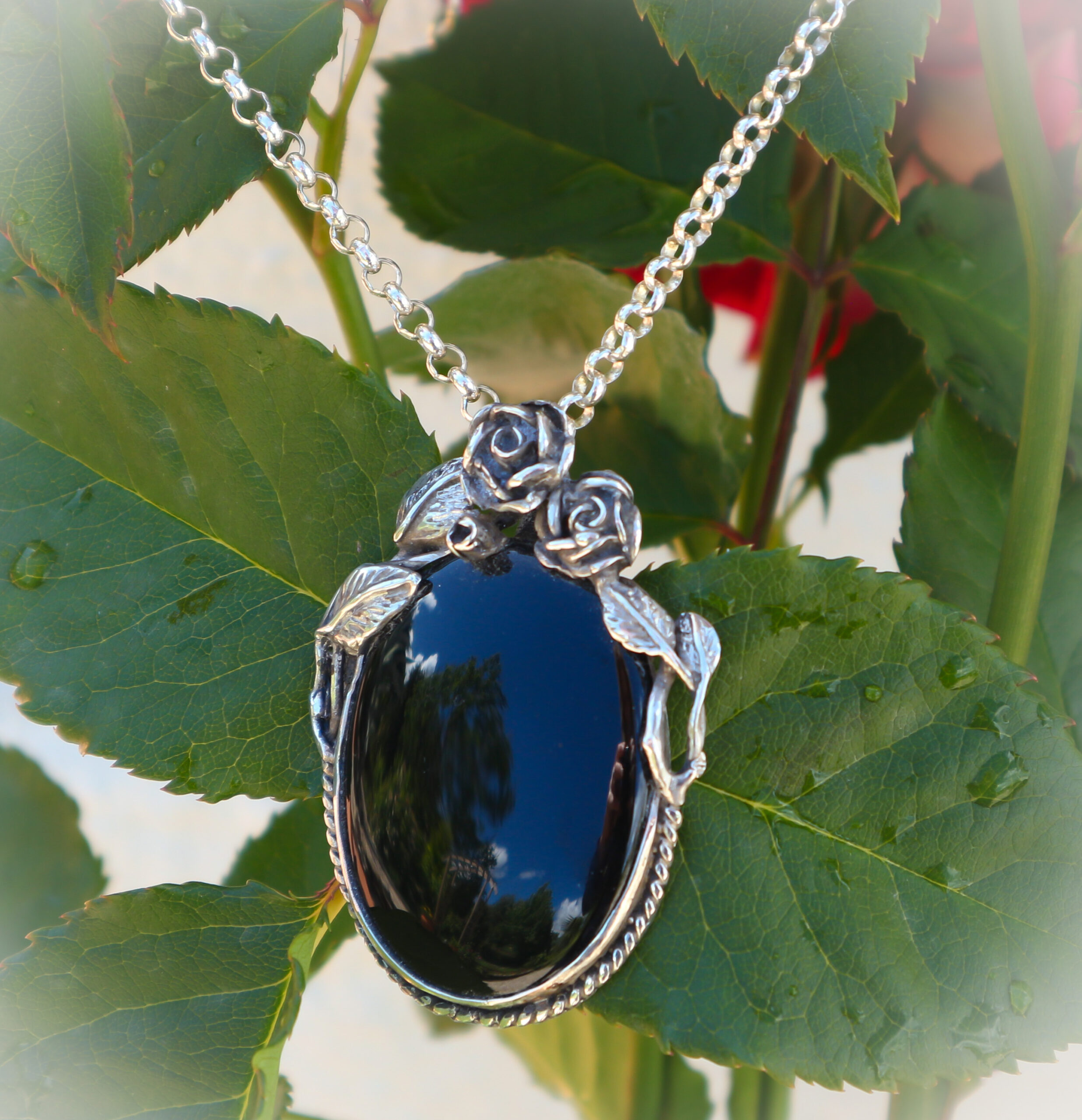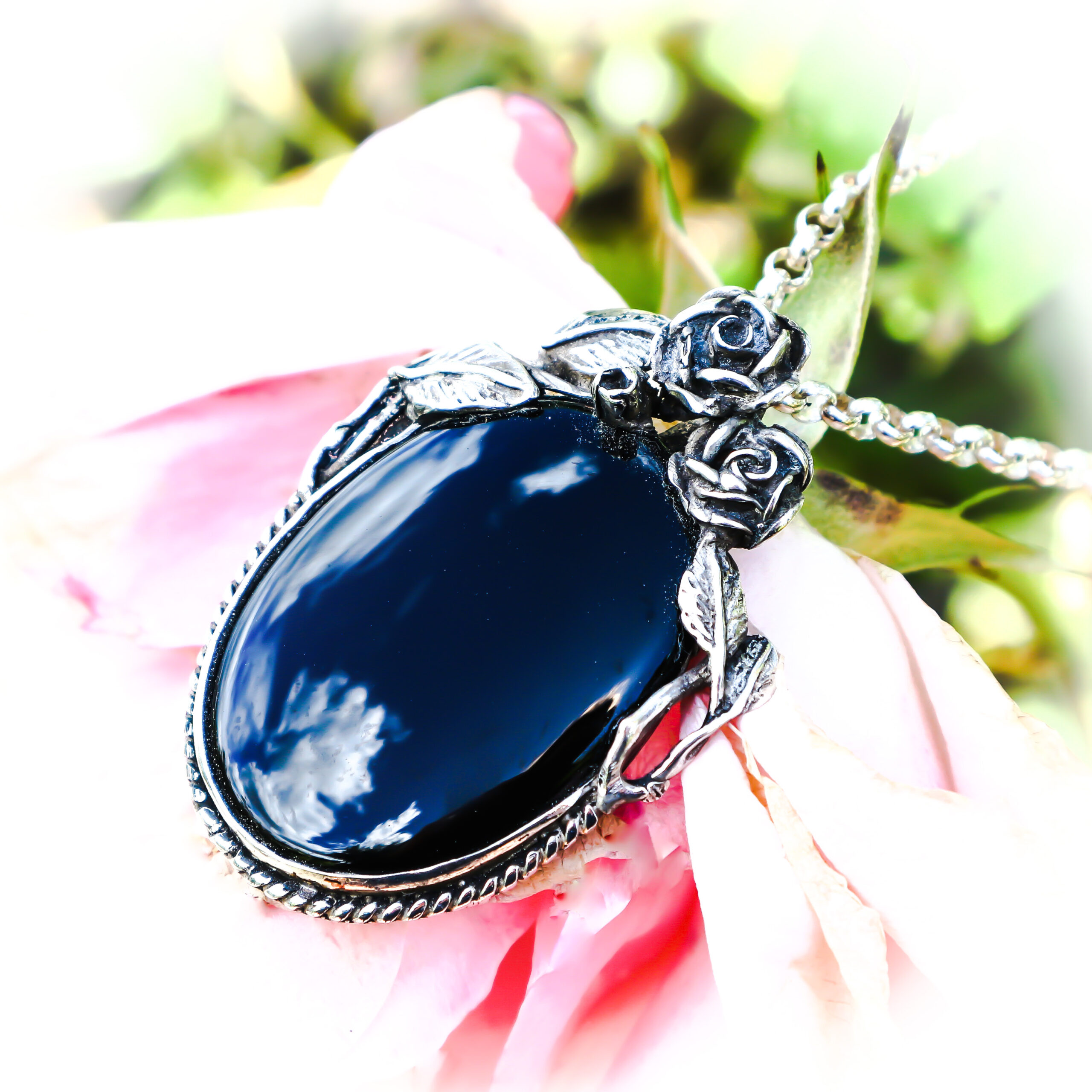 Het middelpunt van de hanger is een grote, betoverende, cabochon geslepen, grote onyx edelsteen, gezet in zilver en versierd met subtiel gevormde rozen en rozenblaadjes in sterling zilver en een mooi getorsde, zilveren rand .