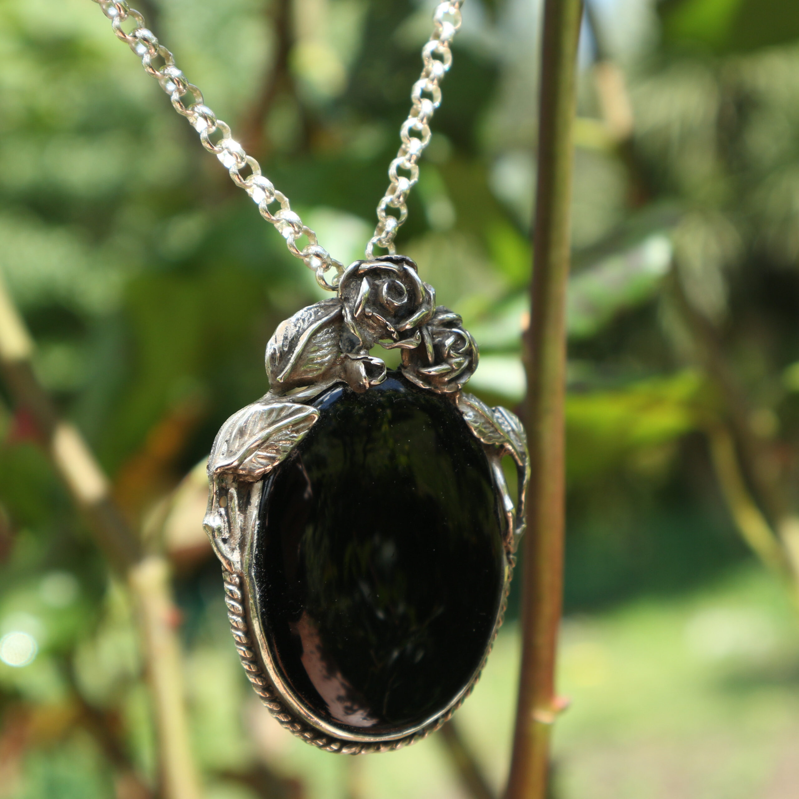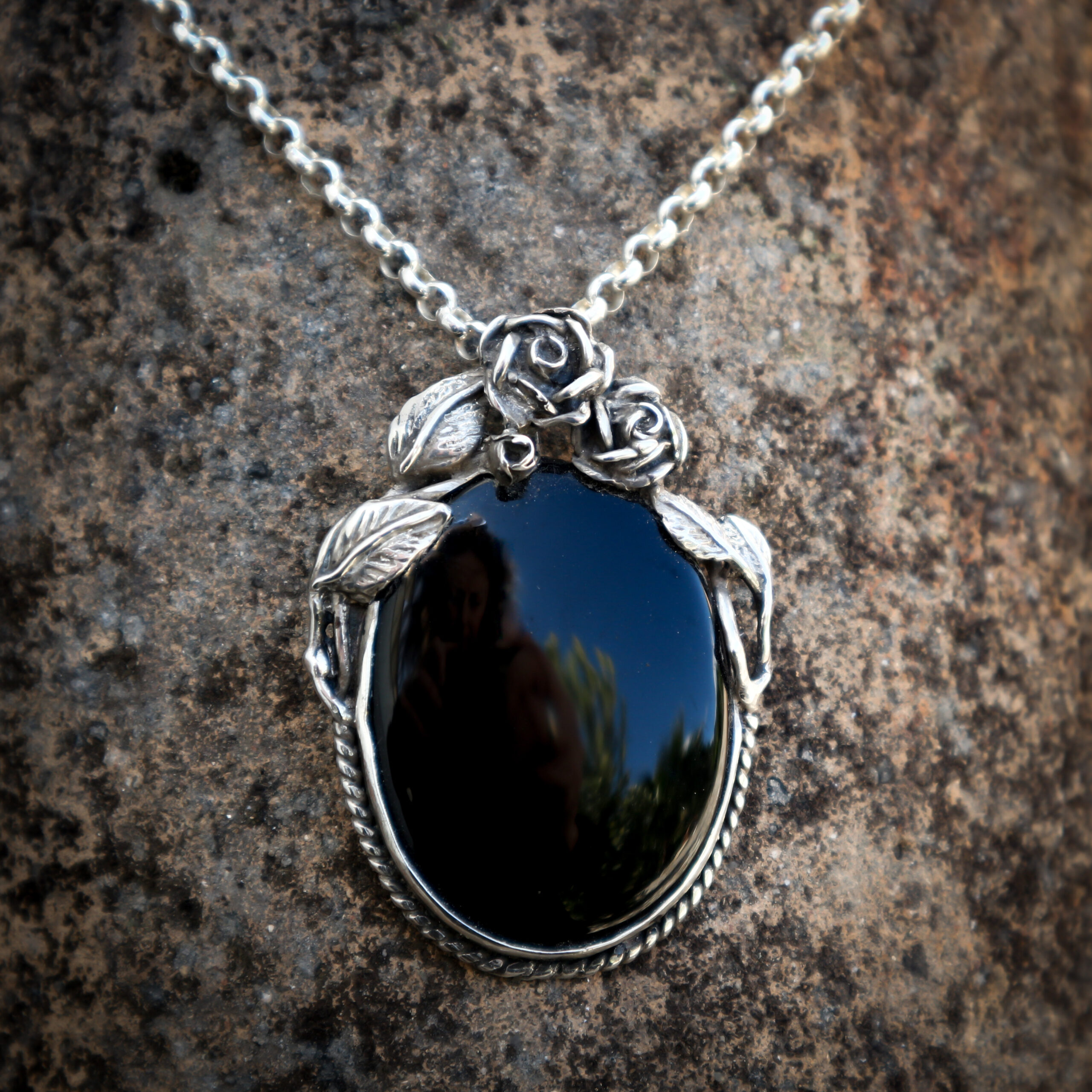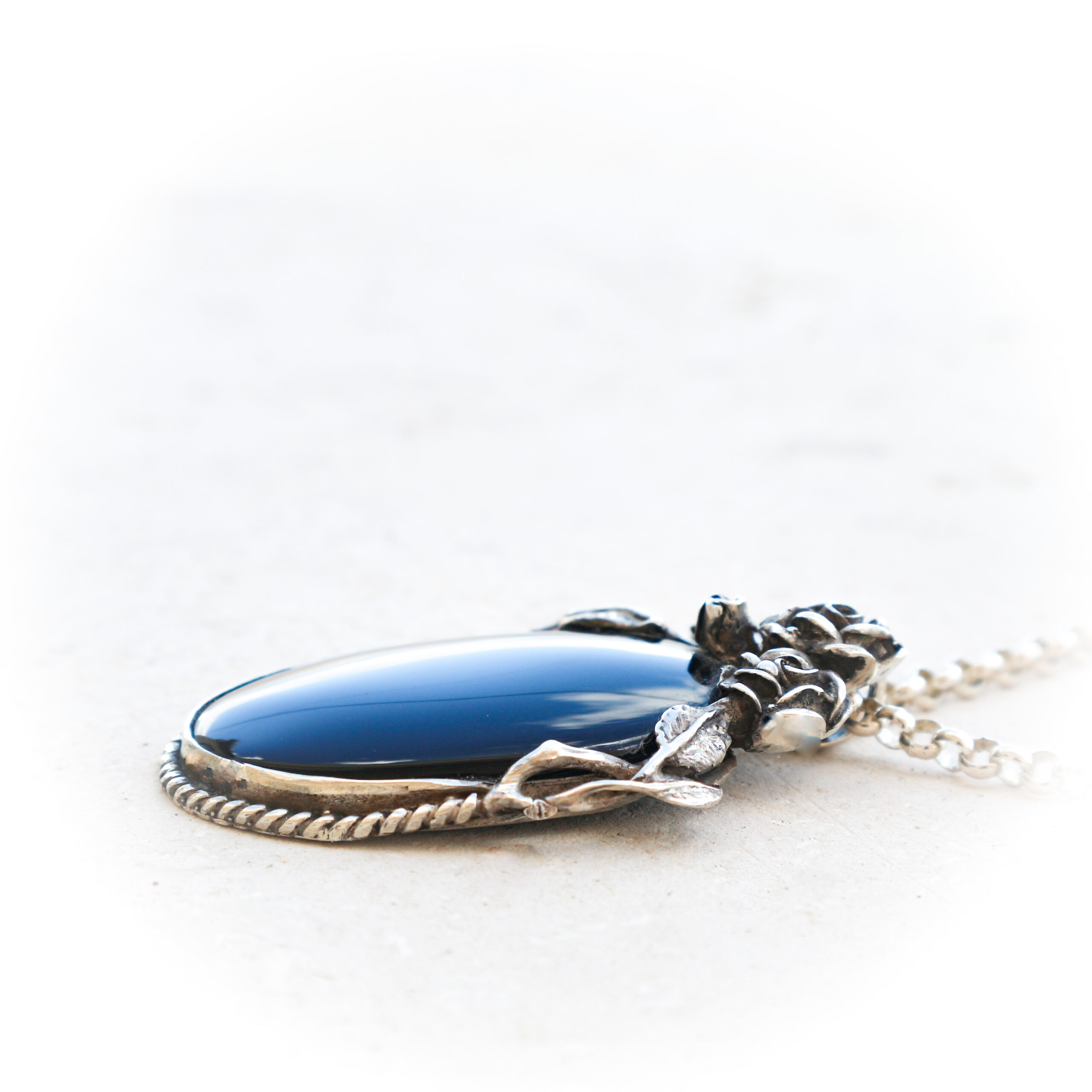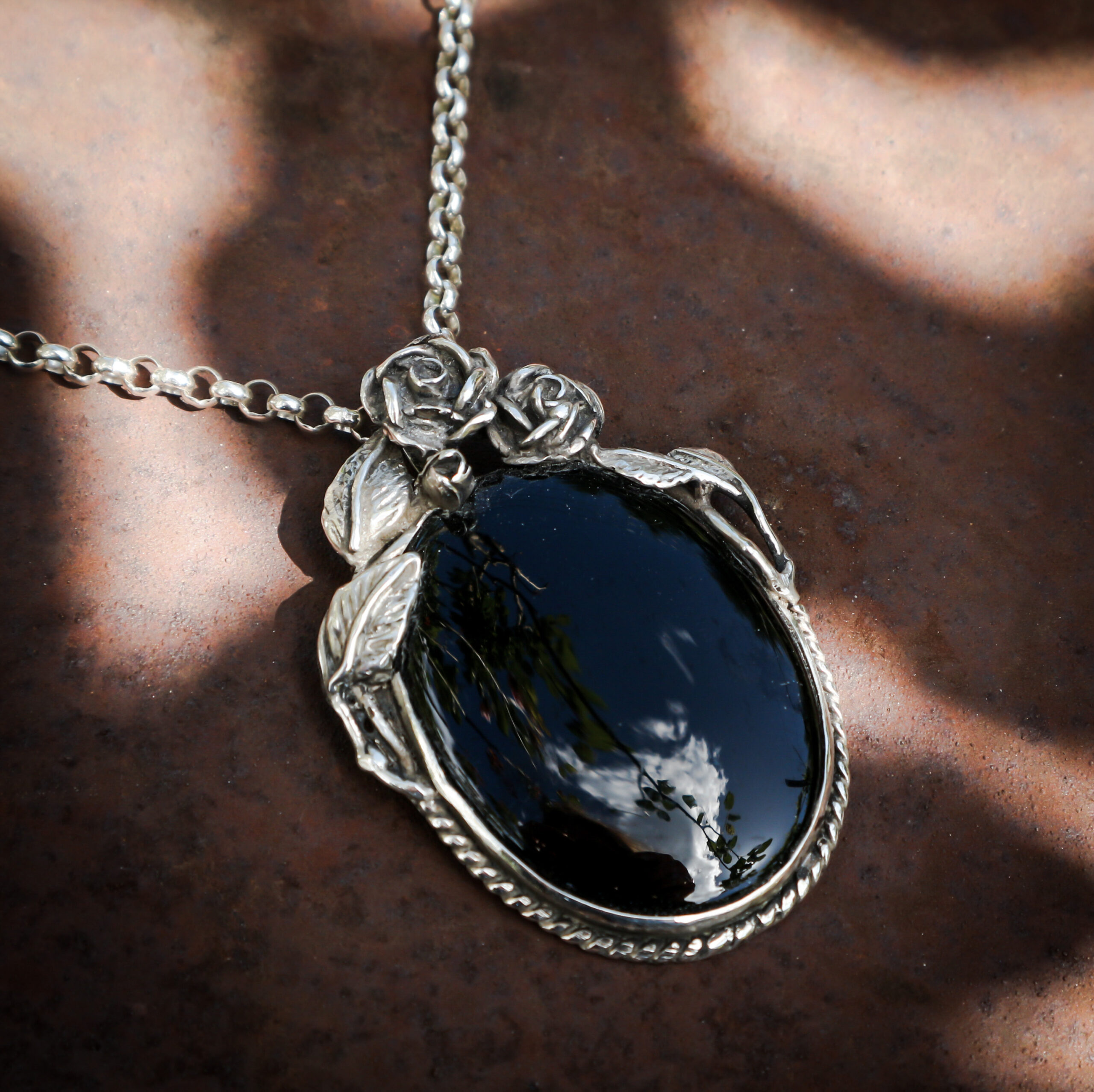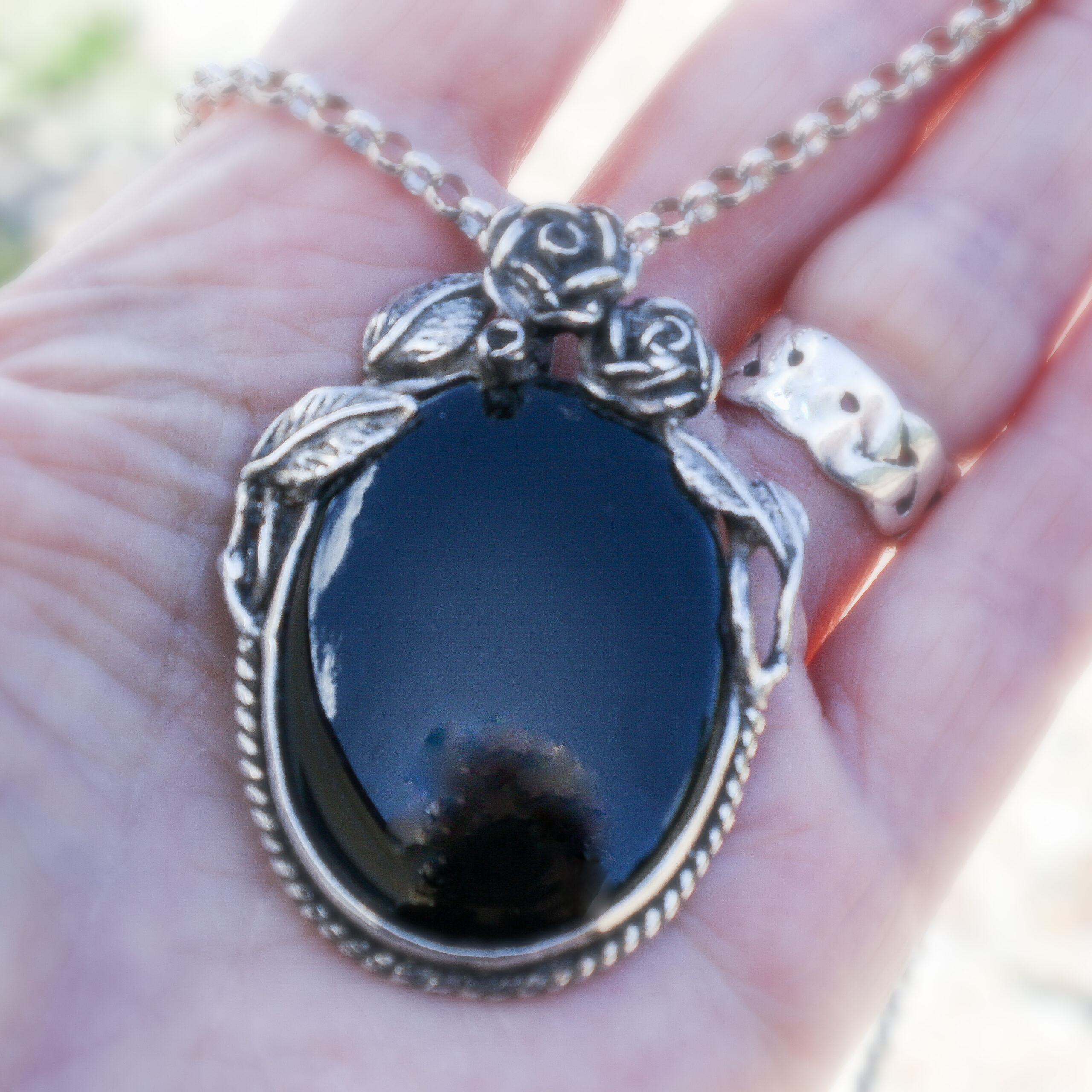 Het middelpunt van de hanger is een grote, betoverende, cabochon geslepen, grote onyx edelsteen, gezet in zilver en versierd met subtiel gevormde rozen en rozenblaadjes in sterling zilver en een mooi getorsde, zilveren rand .