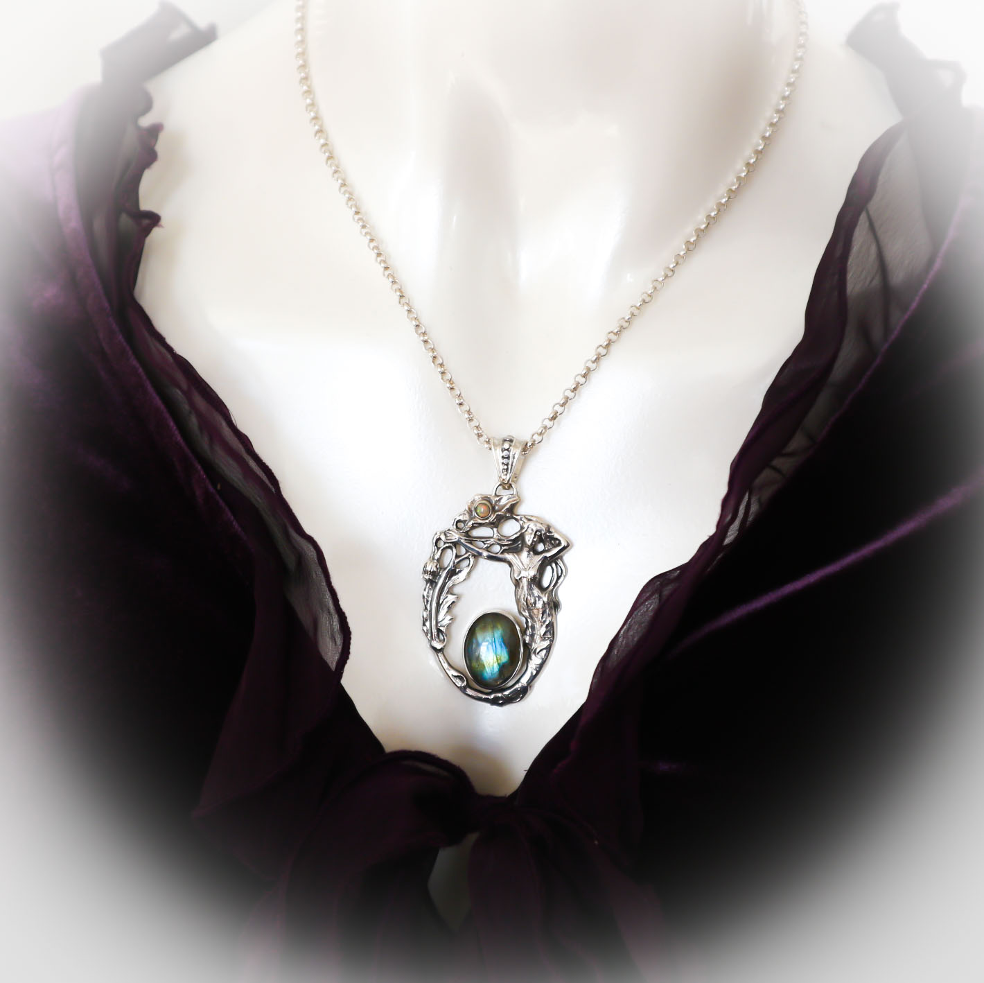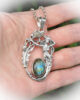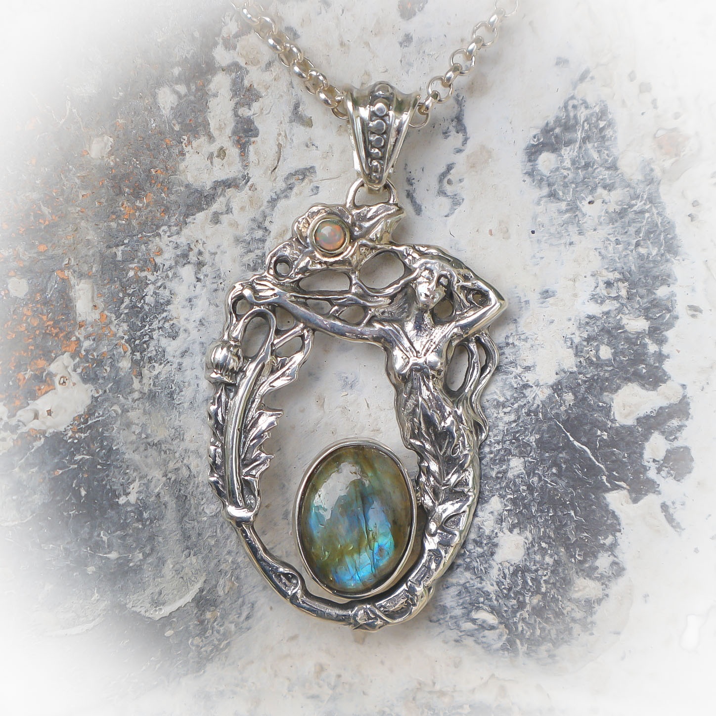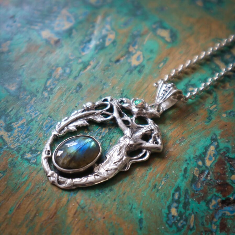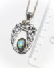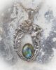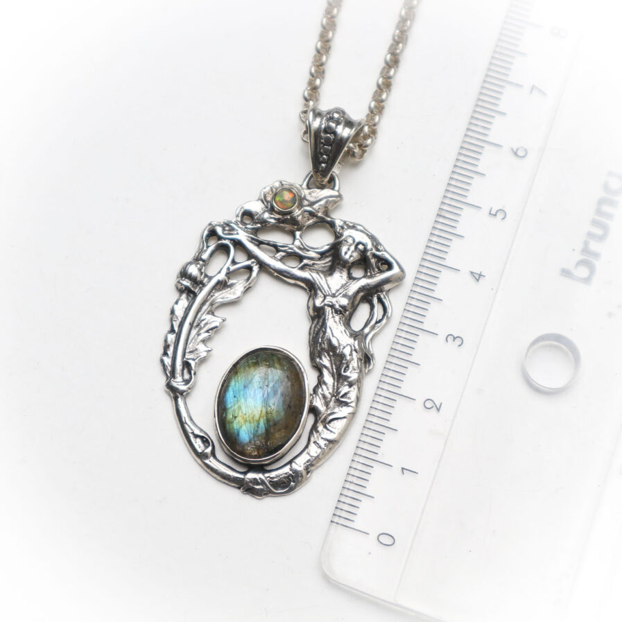 In het hart van de hanger schittert een prachtige labradoriet edelsteen, met een prachtige glans en kleuren blauw, groen en geel wanneer het licht erin valt ( formaat van de steen 11×15 mm)
