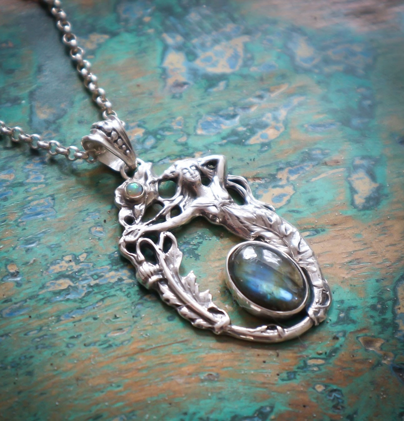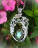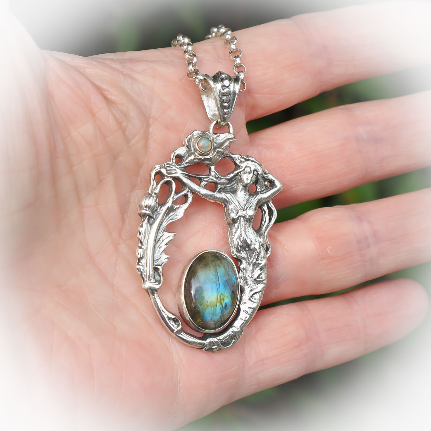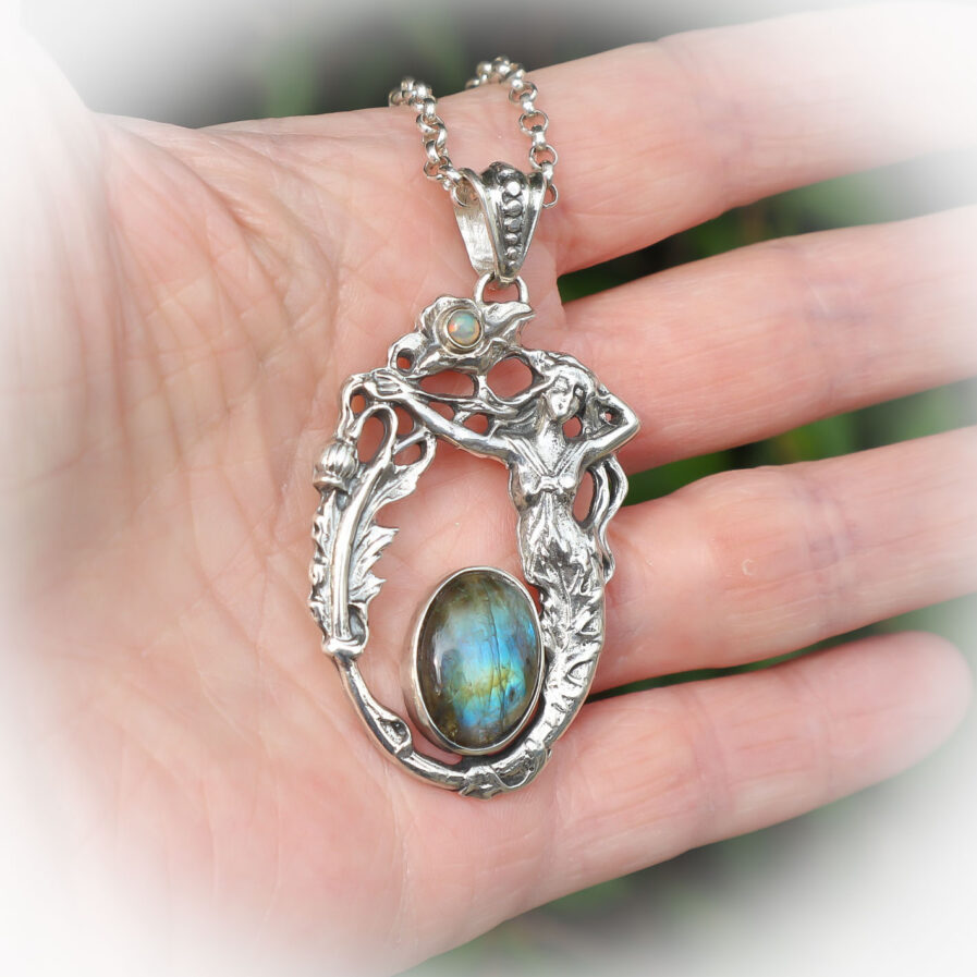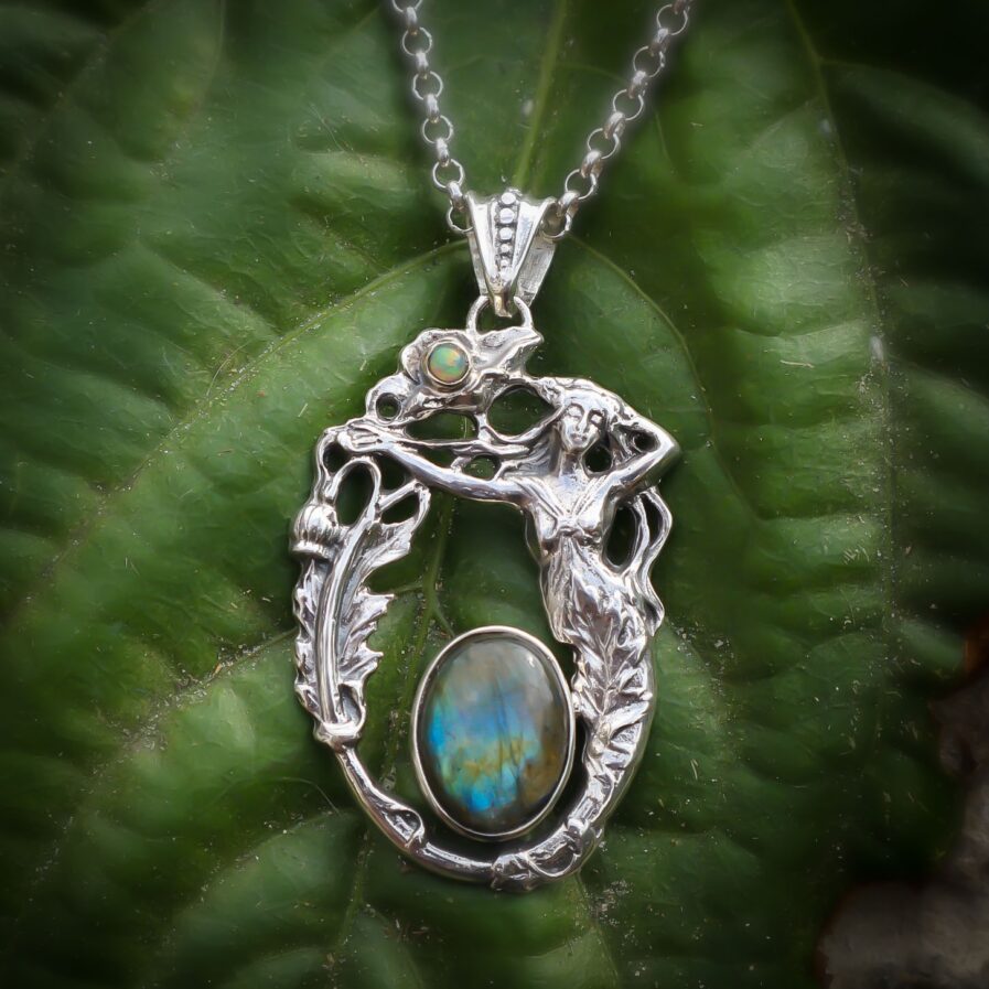 In het hart van de hanger schittert een prachtige labradoriet edelsteen, met een prachtige glans en kleuren blauw, groen en geel wanneer het licht erin valt ( formaat van de steen 11×15 mm)